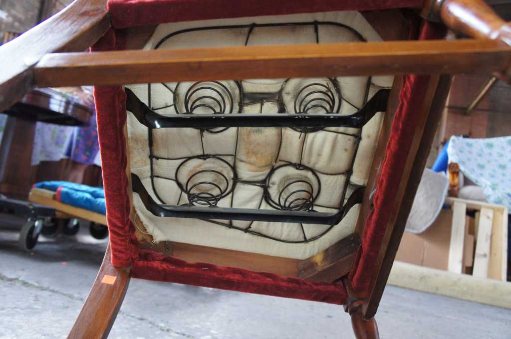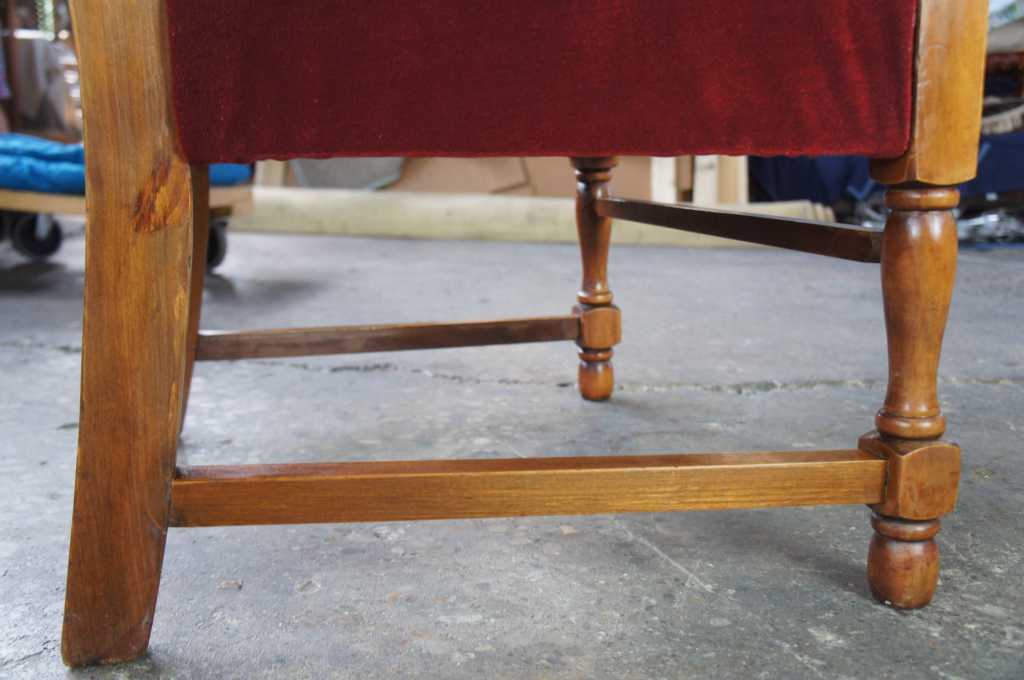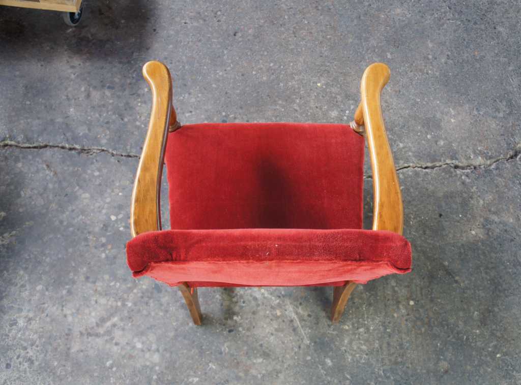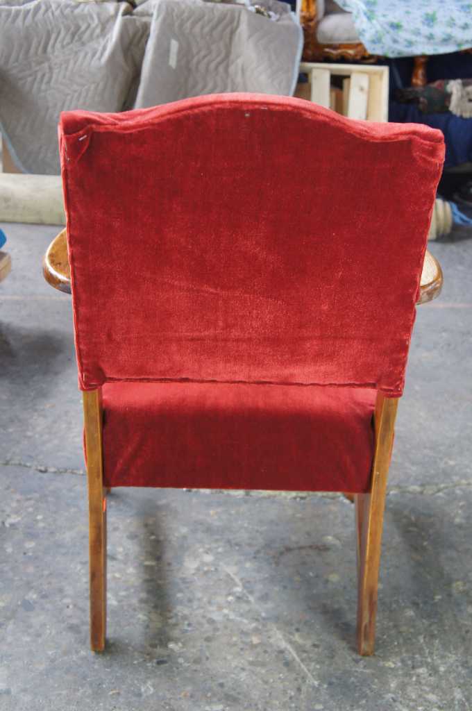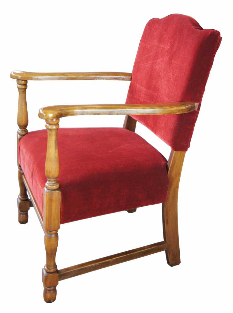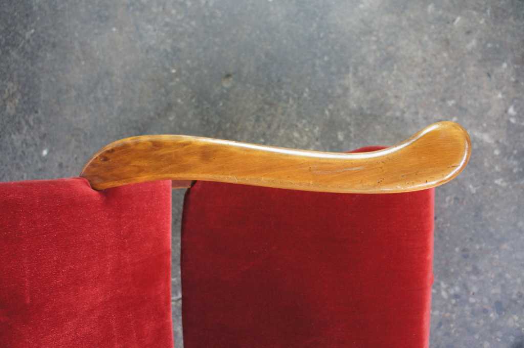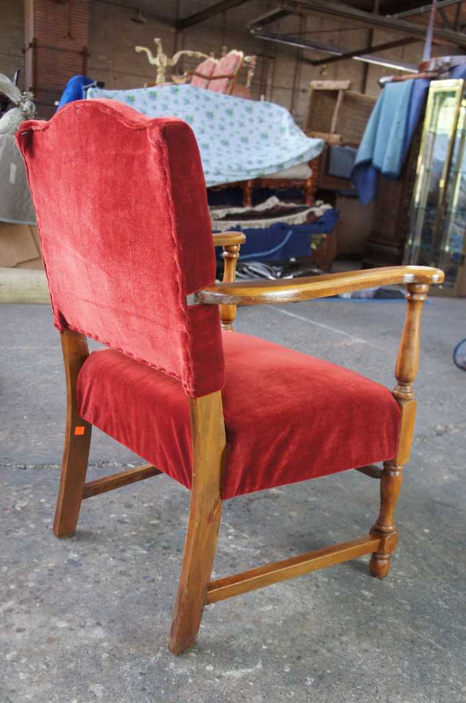 Circa 1940s walnut arm chair. Made from walnut with flared arms and a velour seat.