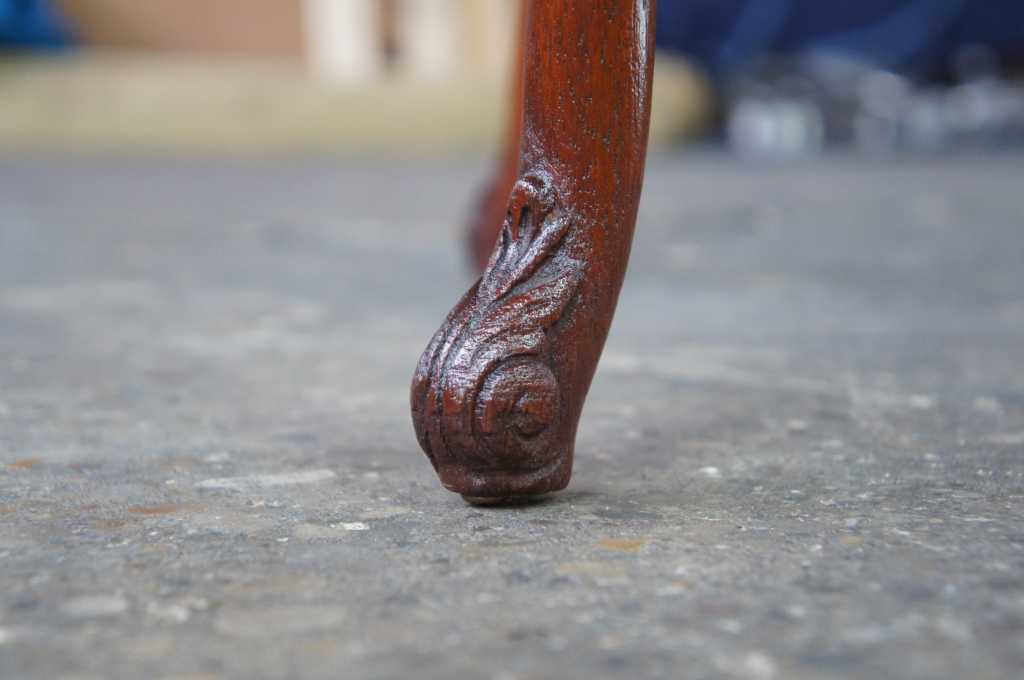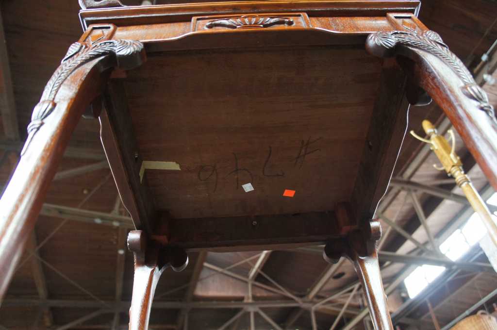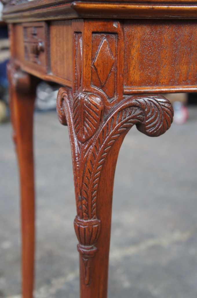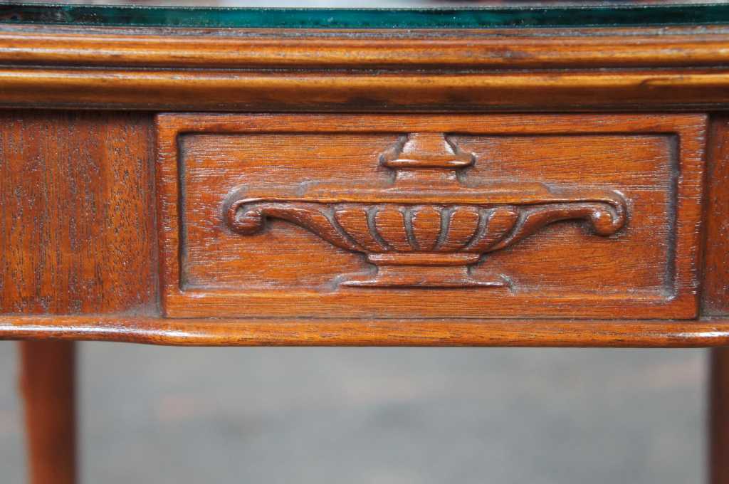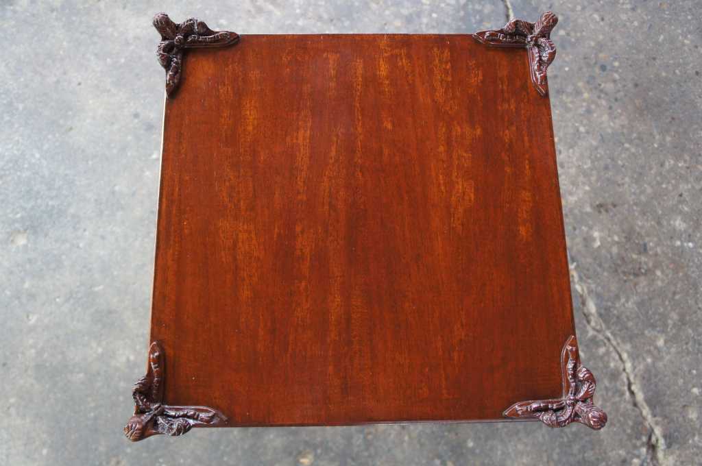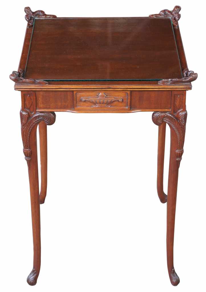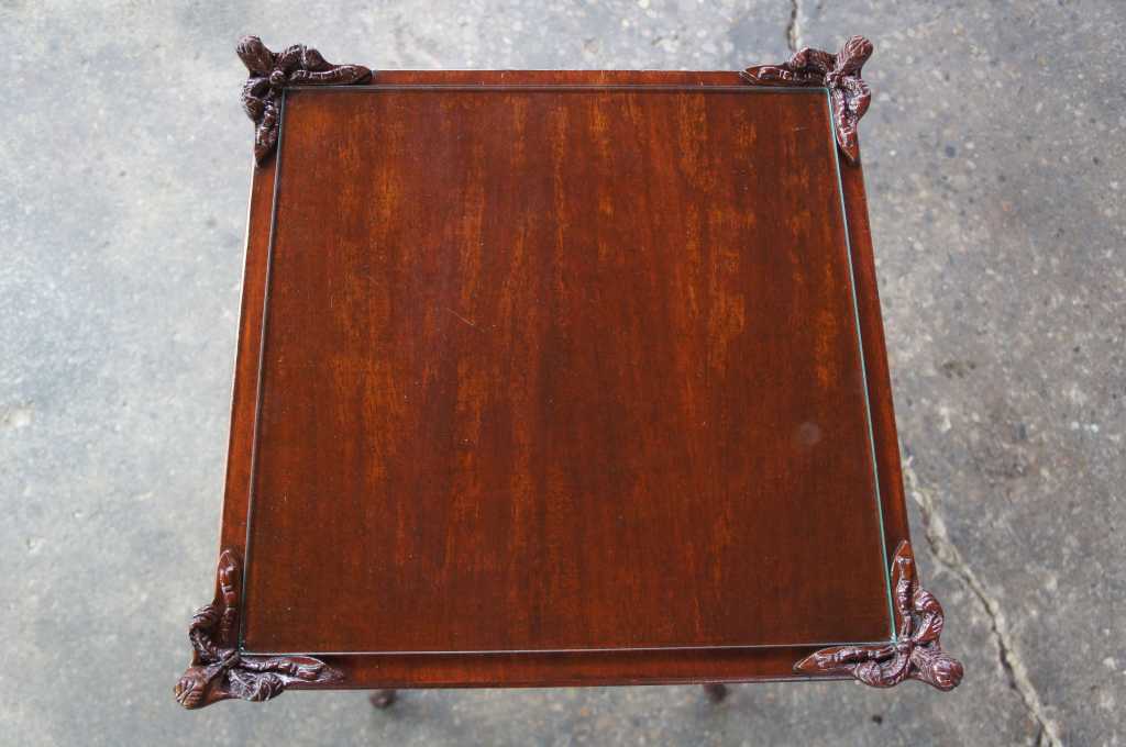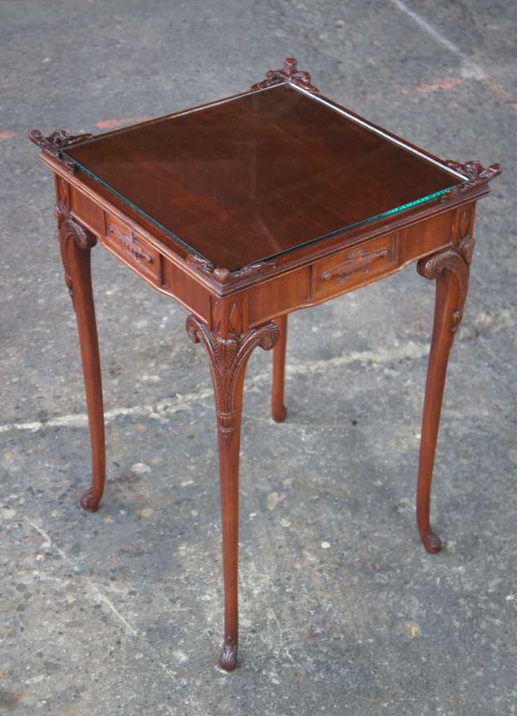 Antique french or baroque revival side table with glass top. Made from mahogany with intricate fleur-de-lis carvings along the legs and top. Features trophy and diamond designs along the apron and acanthus scrolled feet.