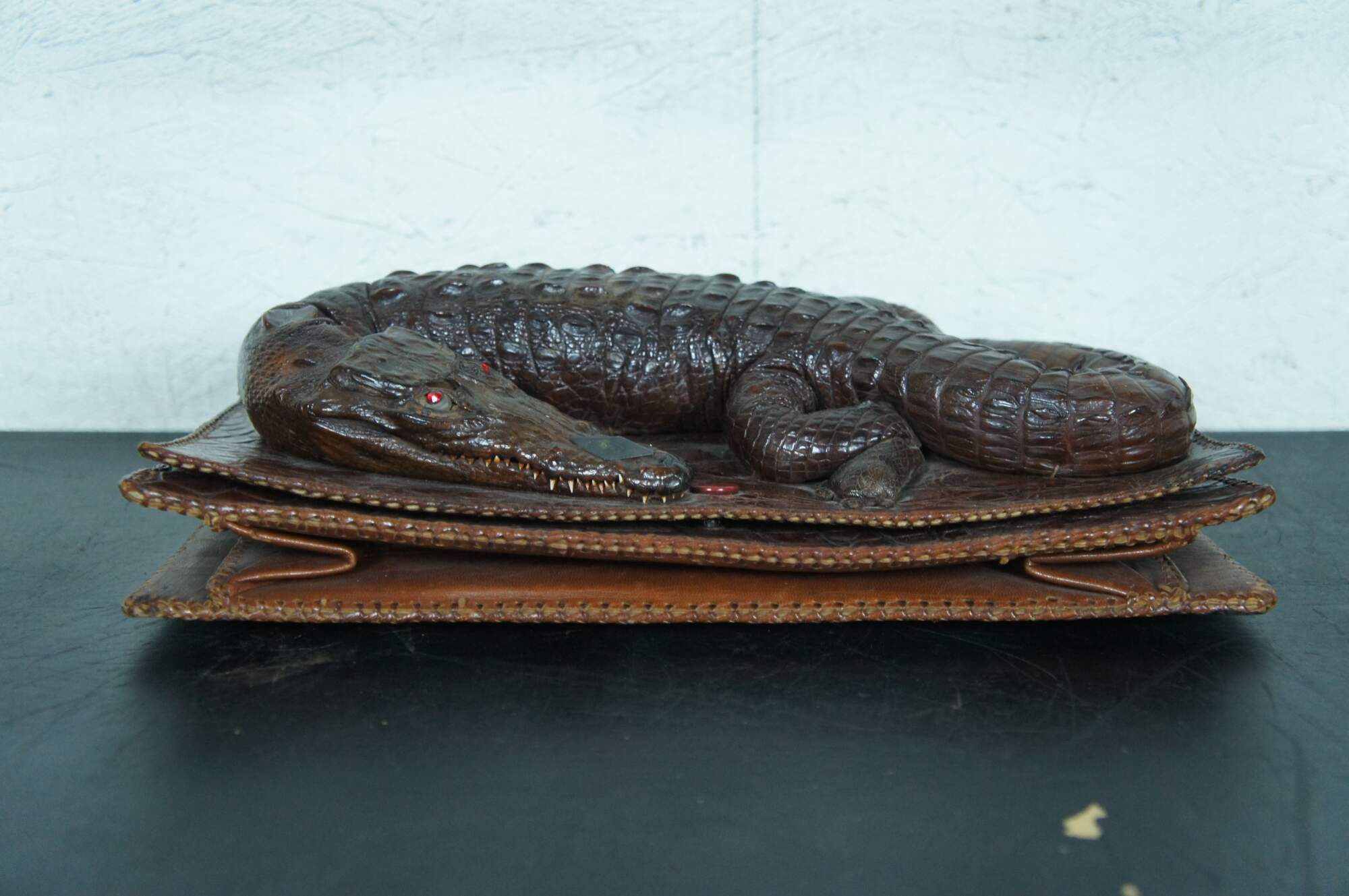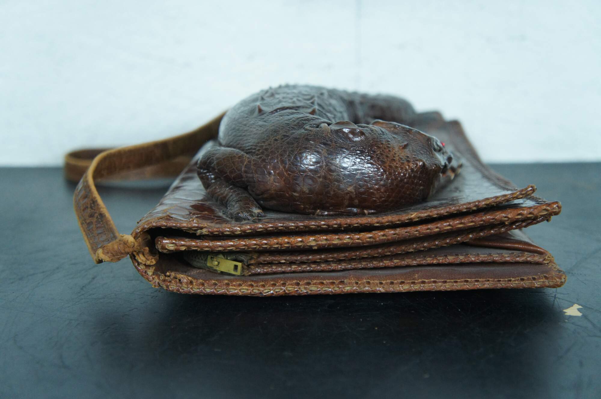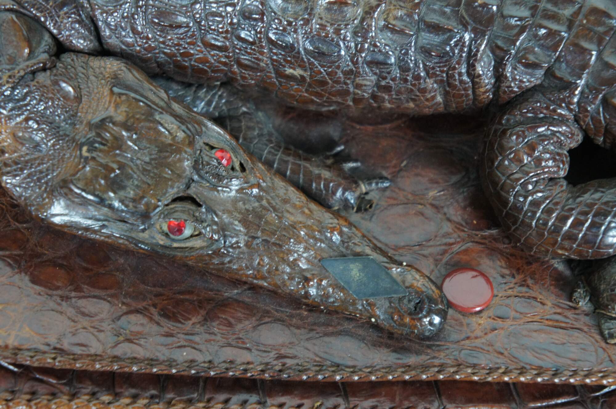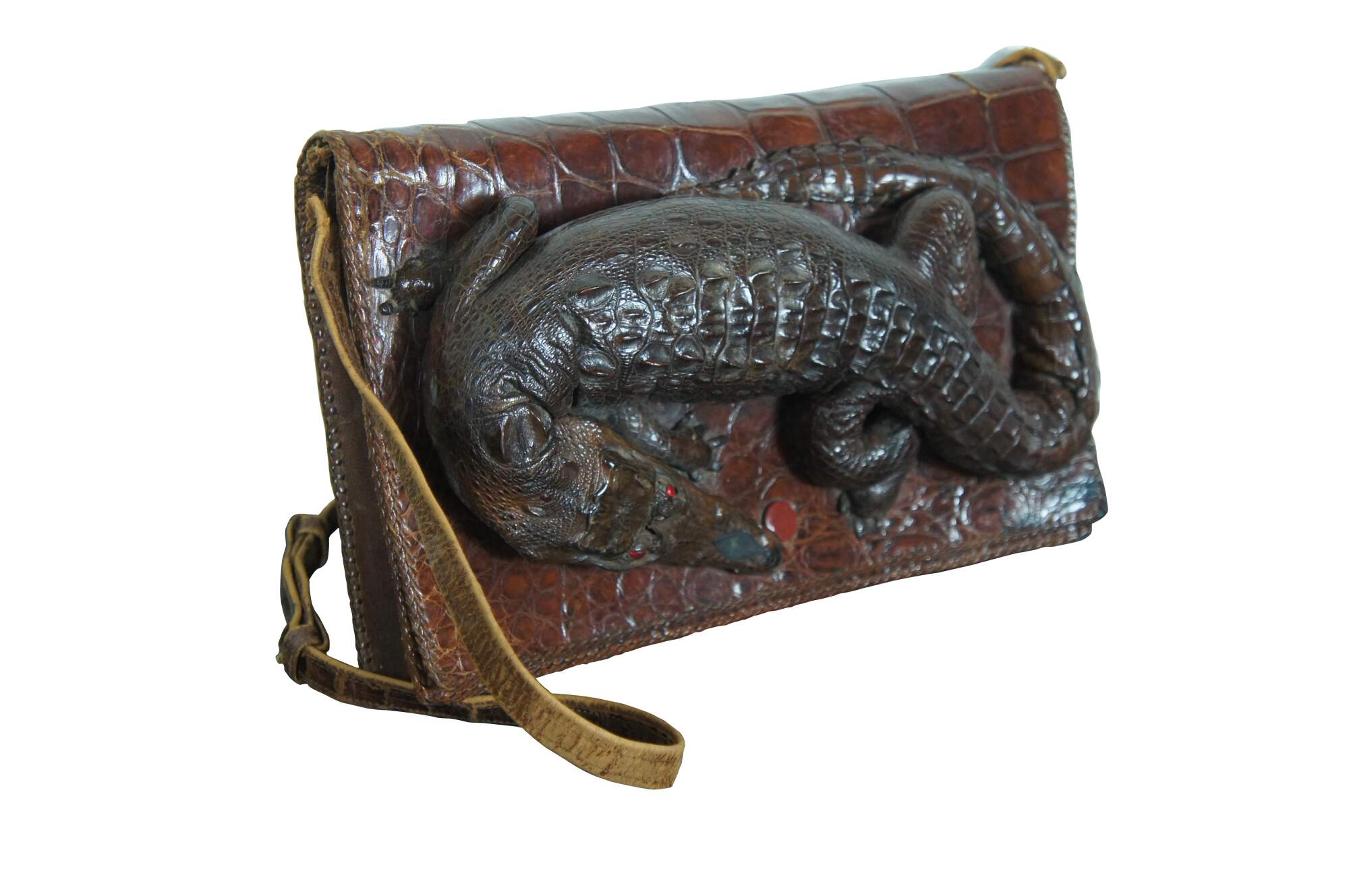 Antique / Mid Century / Circa 1940's brown alligator skin / leather hand bag / purse. Rectangular form with taxidermied baby alligator / crocodile on the front with red rhinestone eyes. Adjustable shoulder strap, snap closure, three interior compartments (one zippered), and four smaller pockets.
