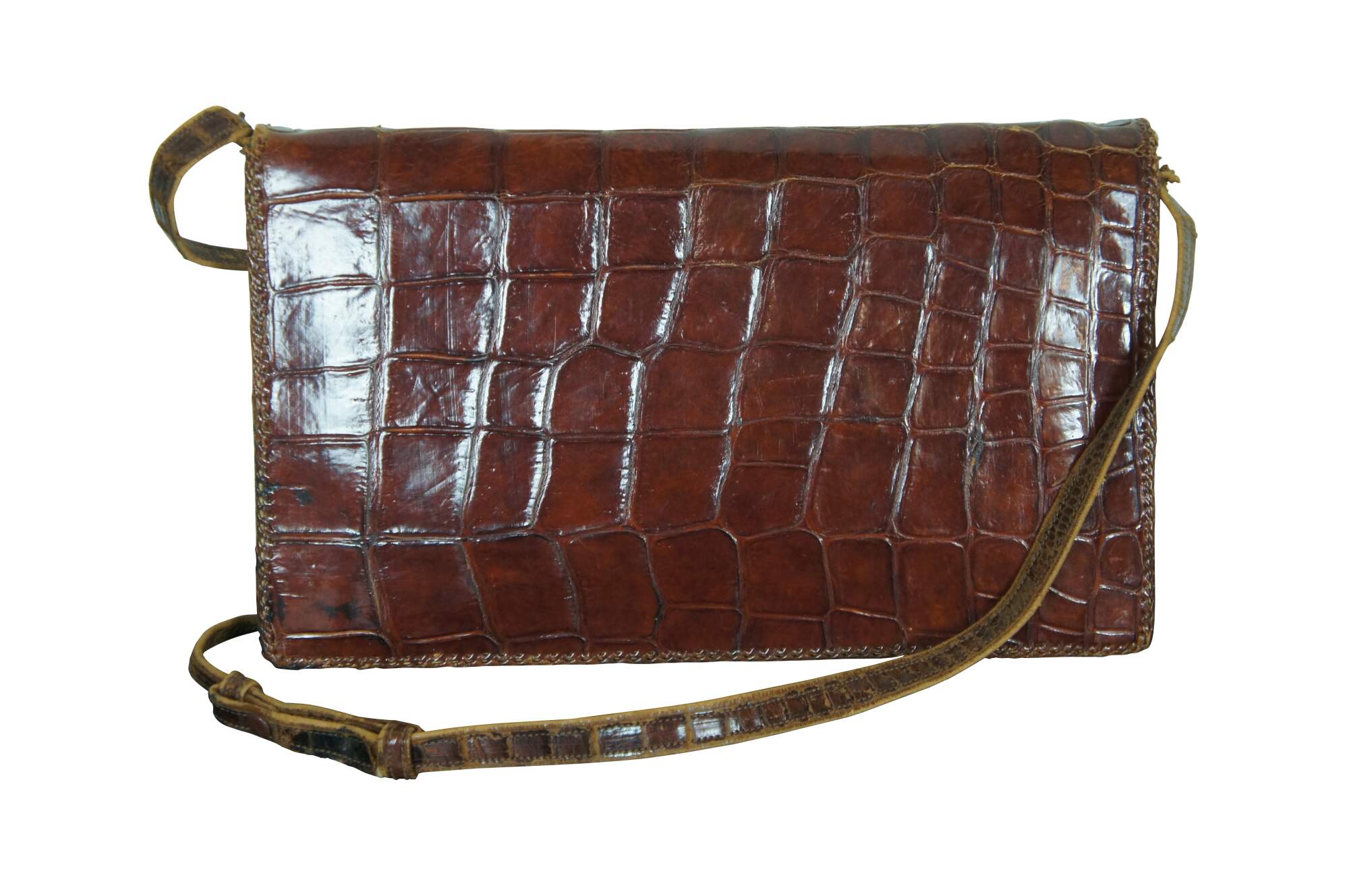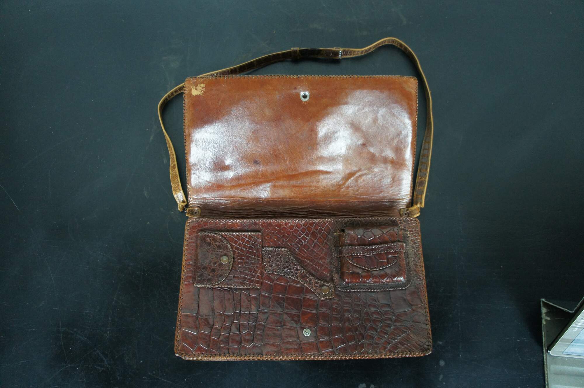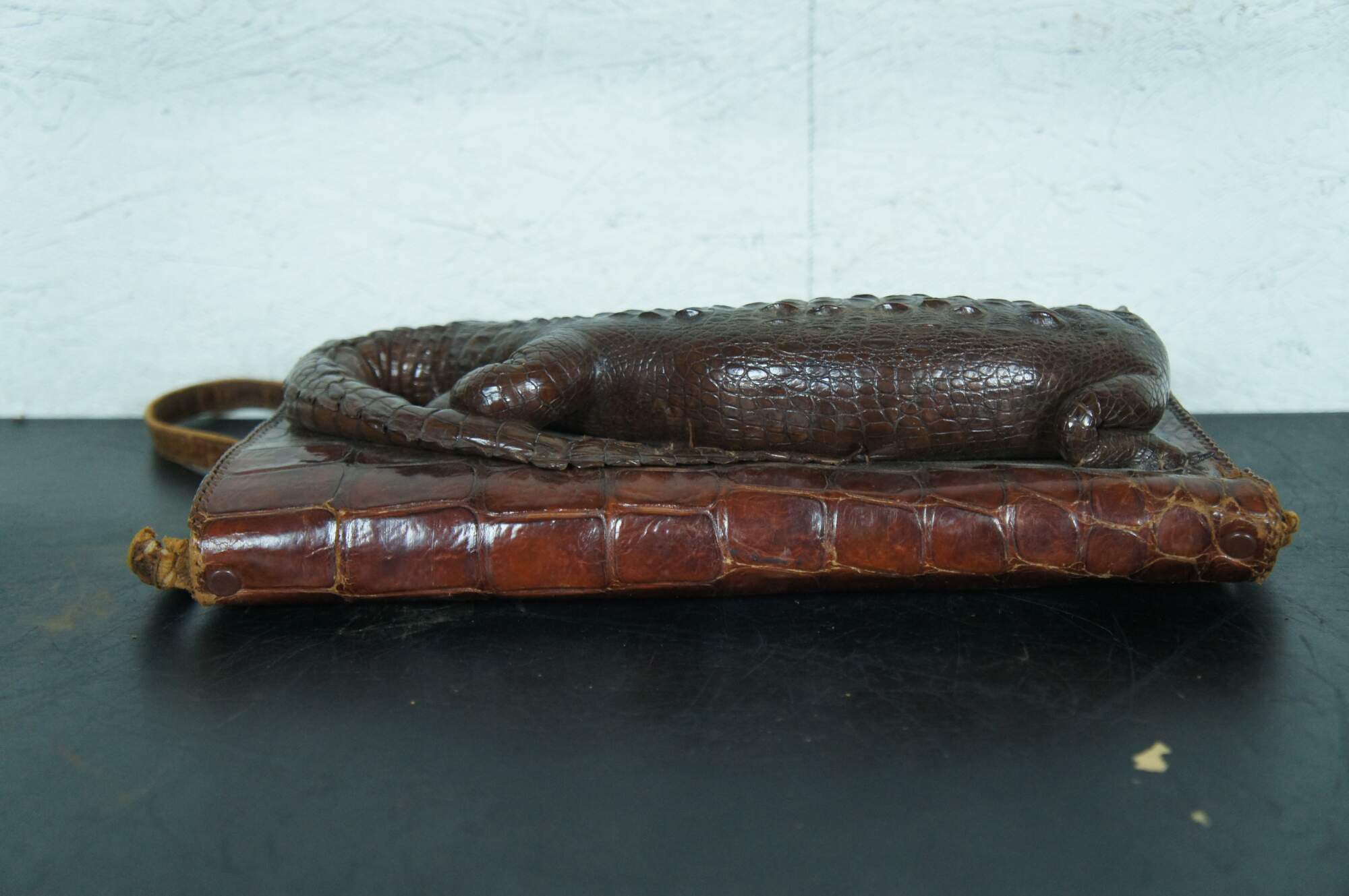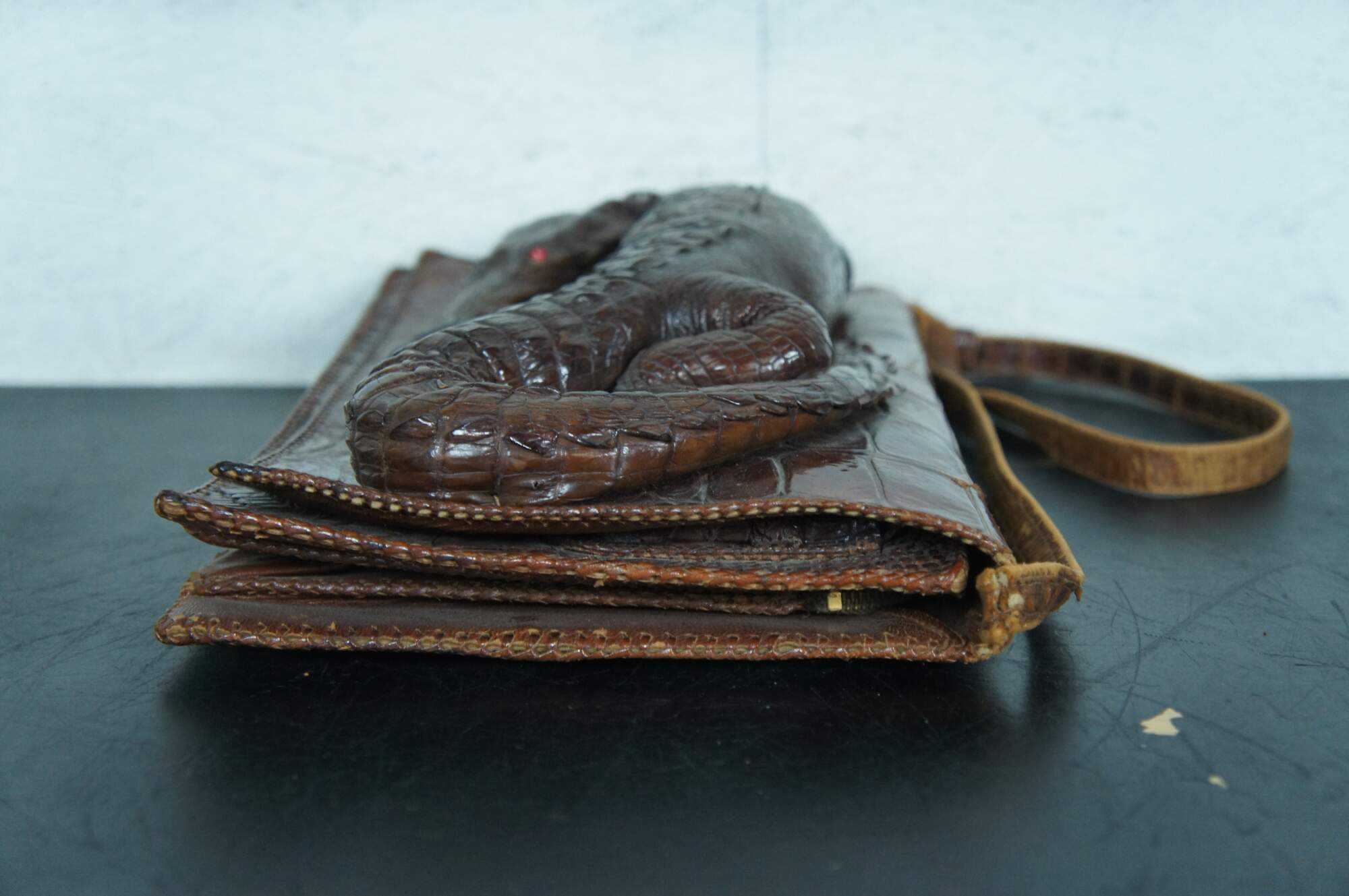 Antique / Mid Century / Circa 1940's brown alligator skin / leather hand bag / purse. Rectangular form with taxidermied baby alligator / crocodile on the front with red rhinestone eyes. Adjustable shoulder strap, snap closure, three interior compartments (one zippered), and four smaller pockets.