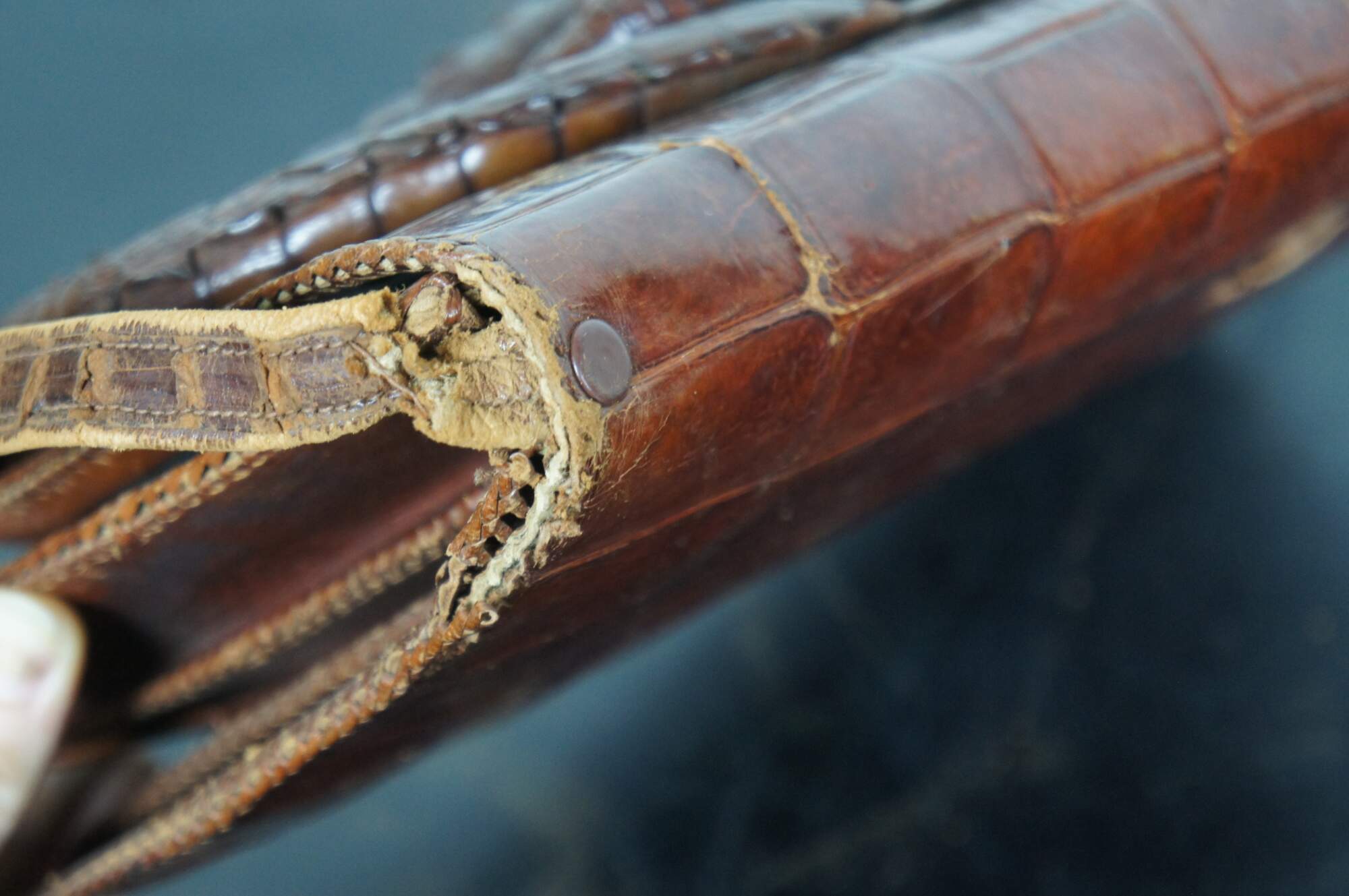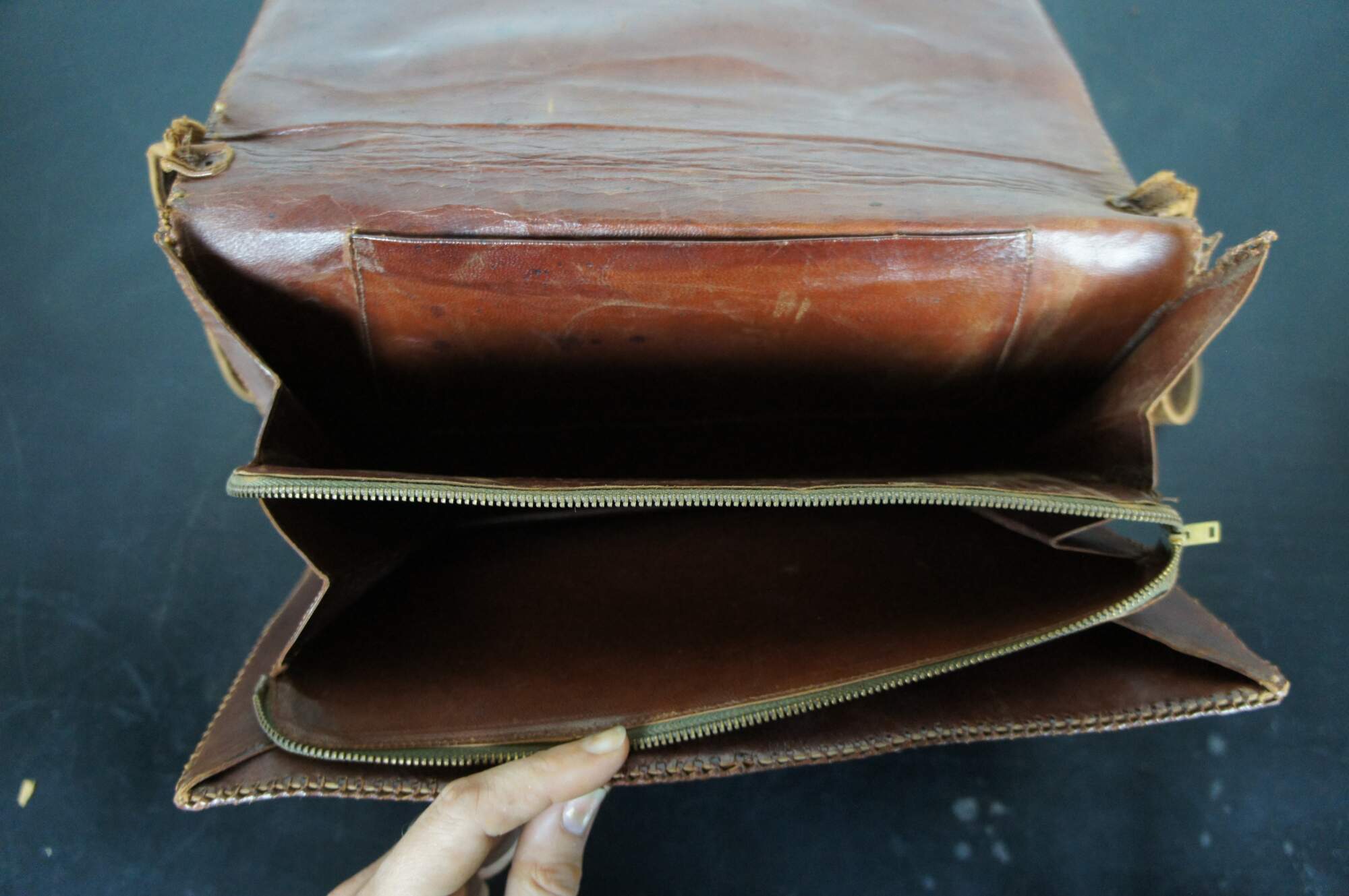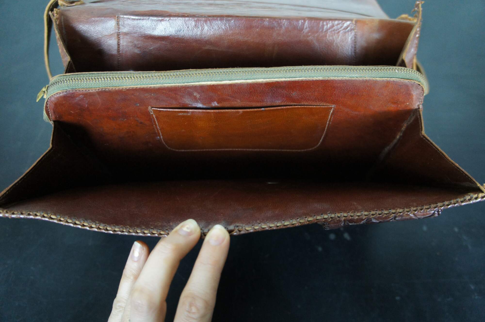 Good Overall - Gentle wear; edges slightly brittle; wear/cracking to shoulder strap/tearing where attached to bag