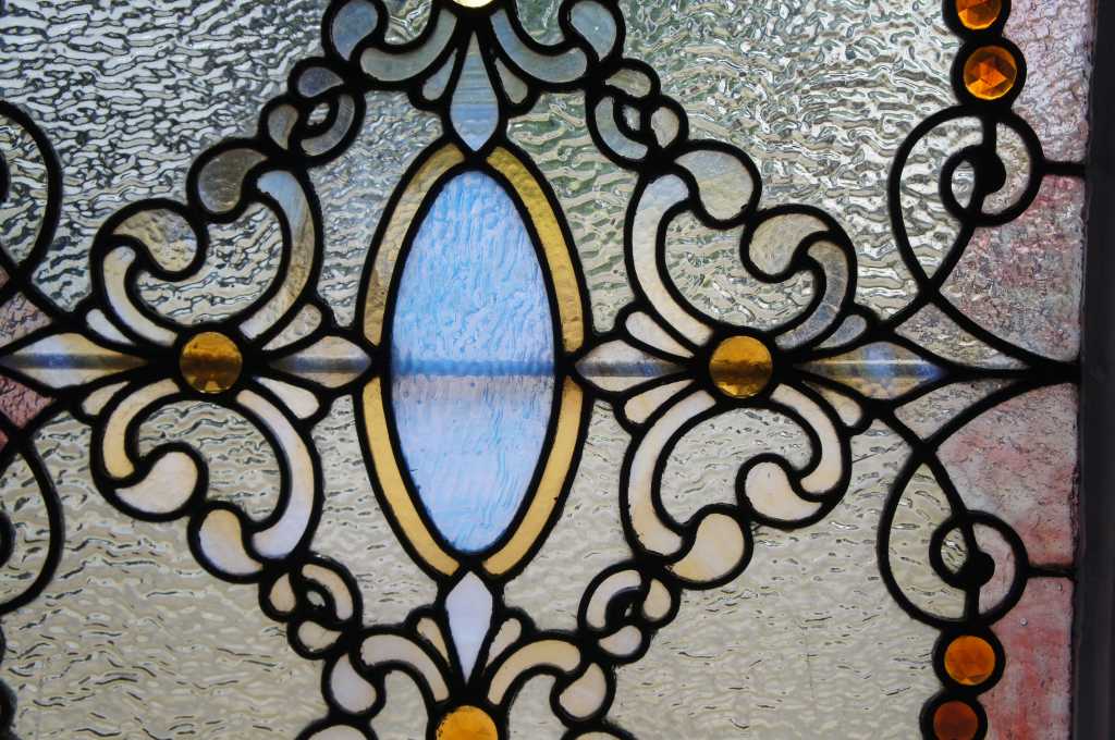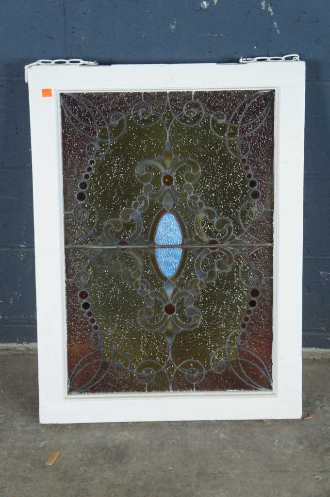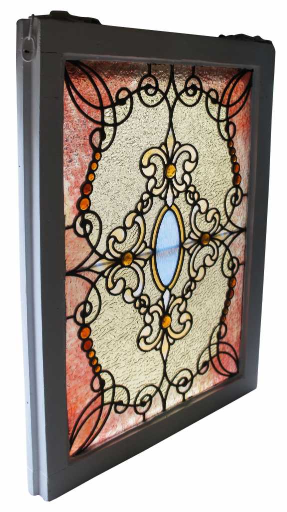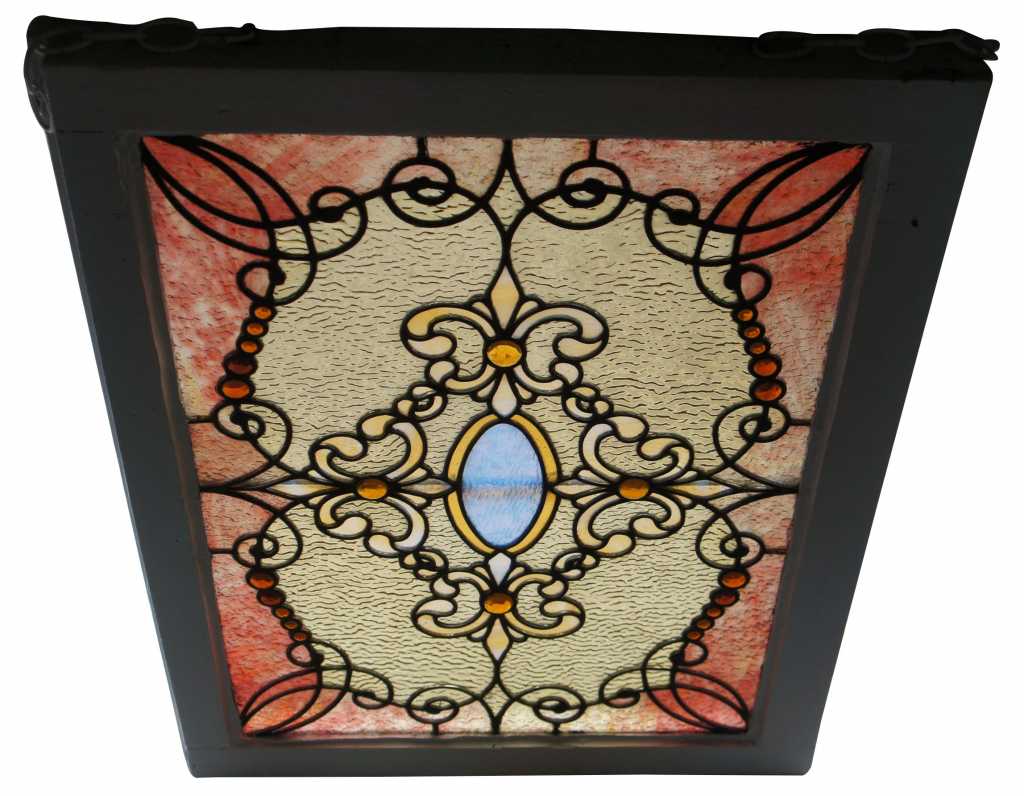 Up for consideration is a stunning stained glass window. Salvaged from a building in Cincinnati Ohio. Circa 1850-70s. Features an amazing Fleur de lis design beaded with rose, amber and blue glass. A true work of craftsmanship.