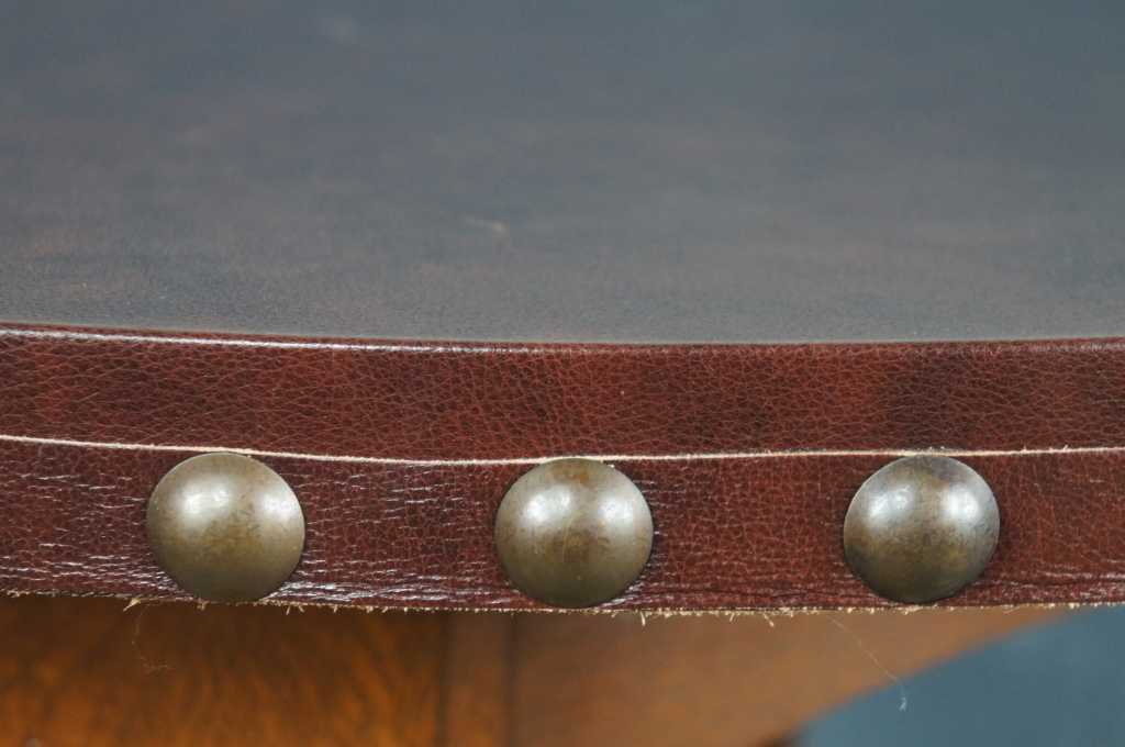 Features Mission staples like keyed mortise and tenon joinery and a thick 1 11/16" oak top with aged brown leather and brass nail head trim.