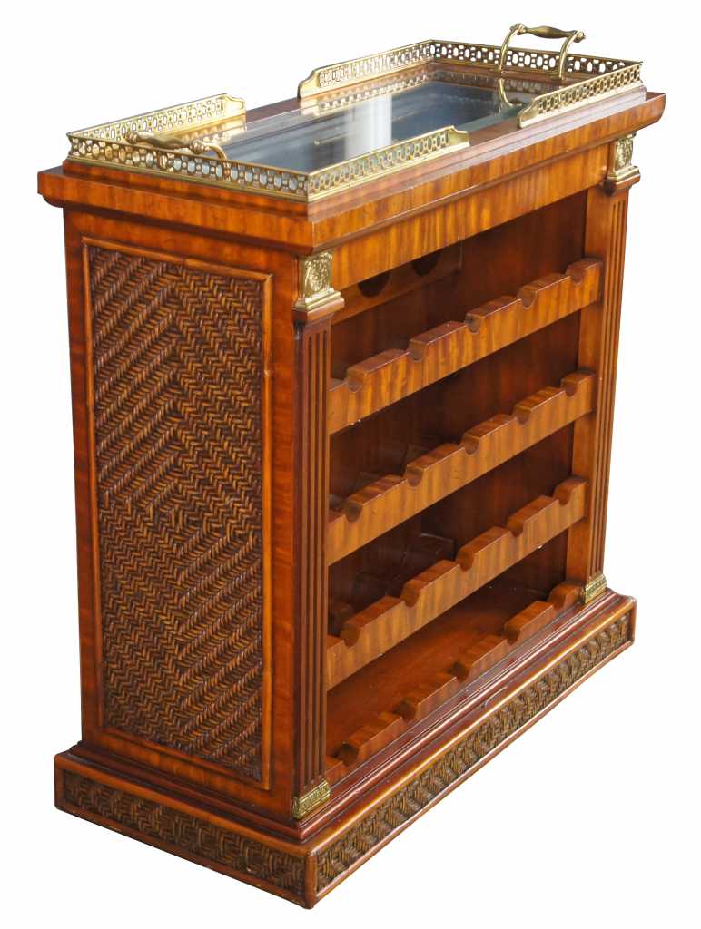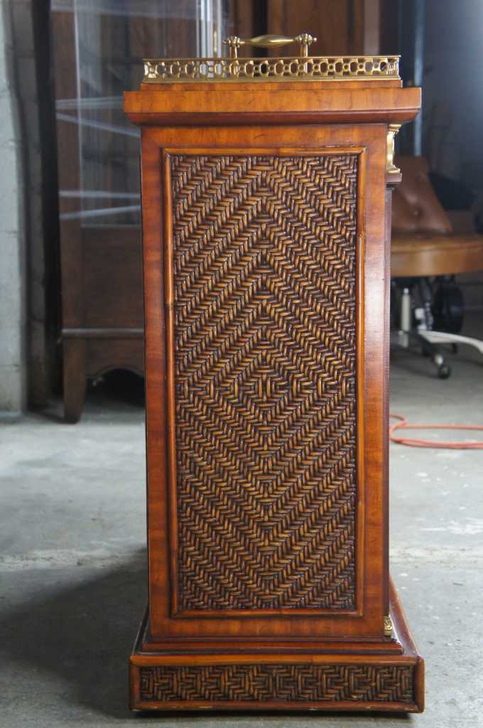 Features neoclassical styling with a stunning diamond patterned rattan siding and a flamed walnut veneer to the front. The long side columns are flanked by brass mounts. The top serving tray has a beveled glass surface inset into the wood which is framed by a pierced brass gallery.