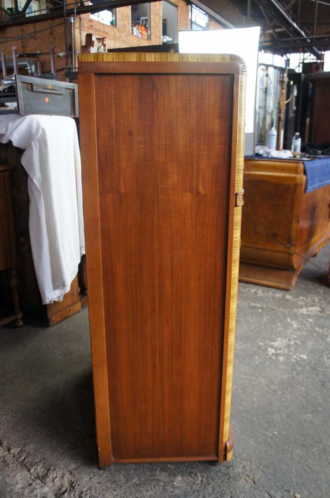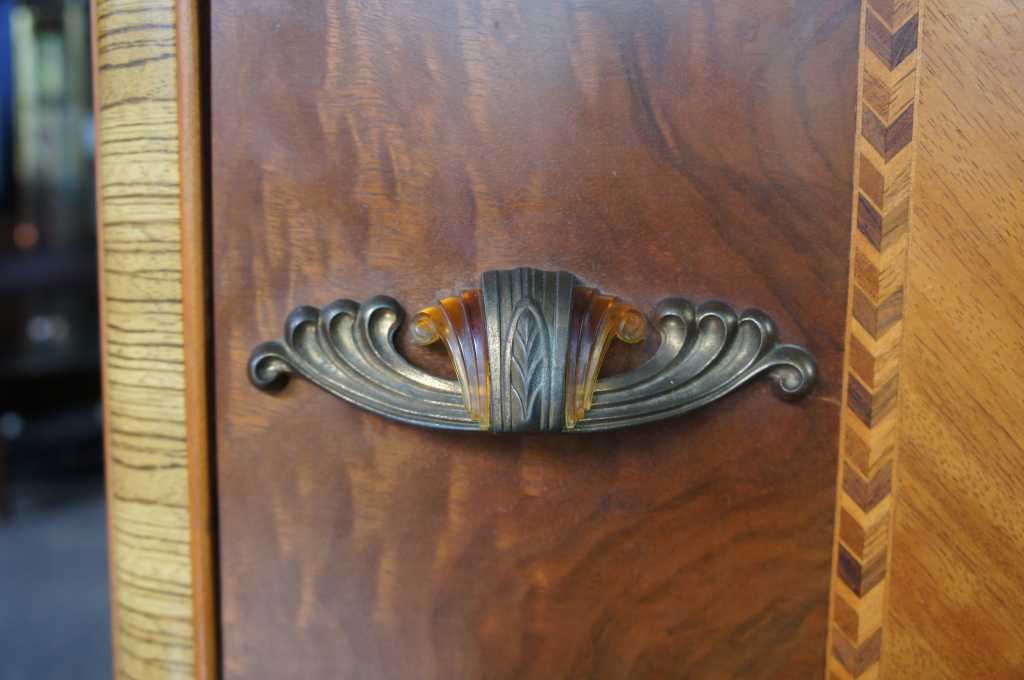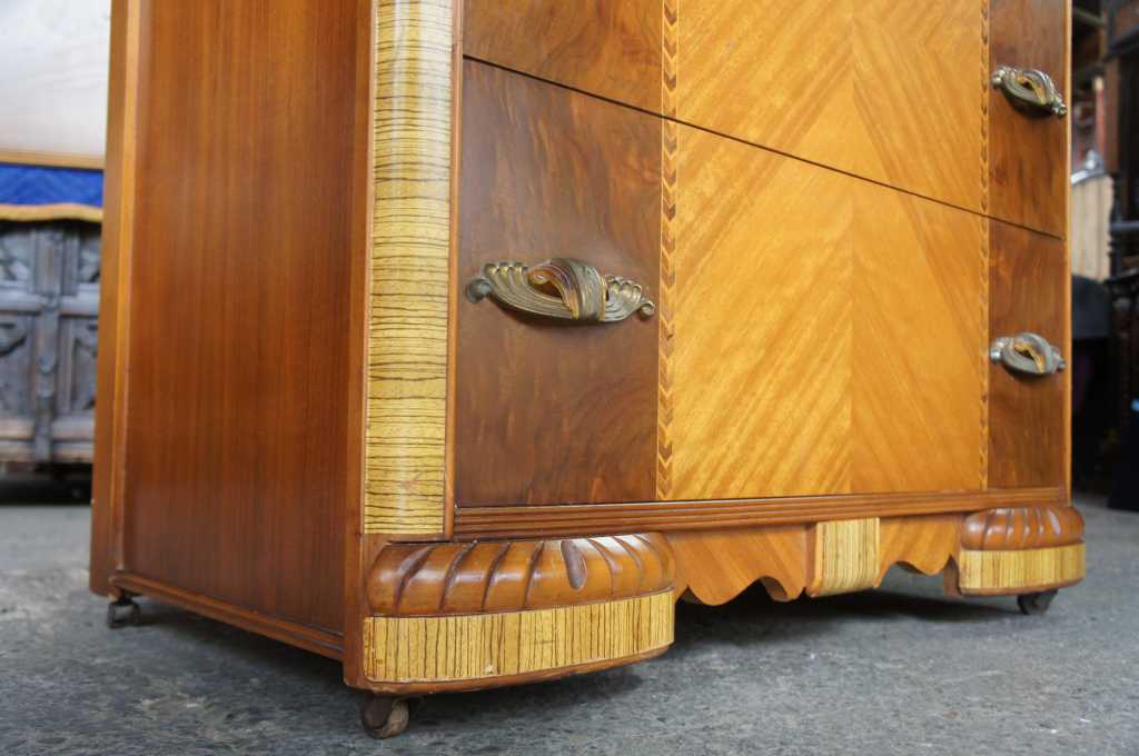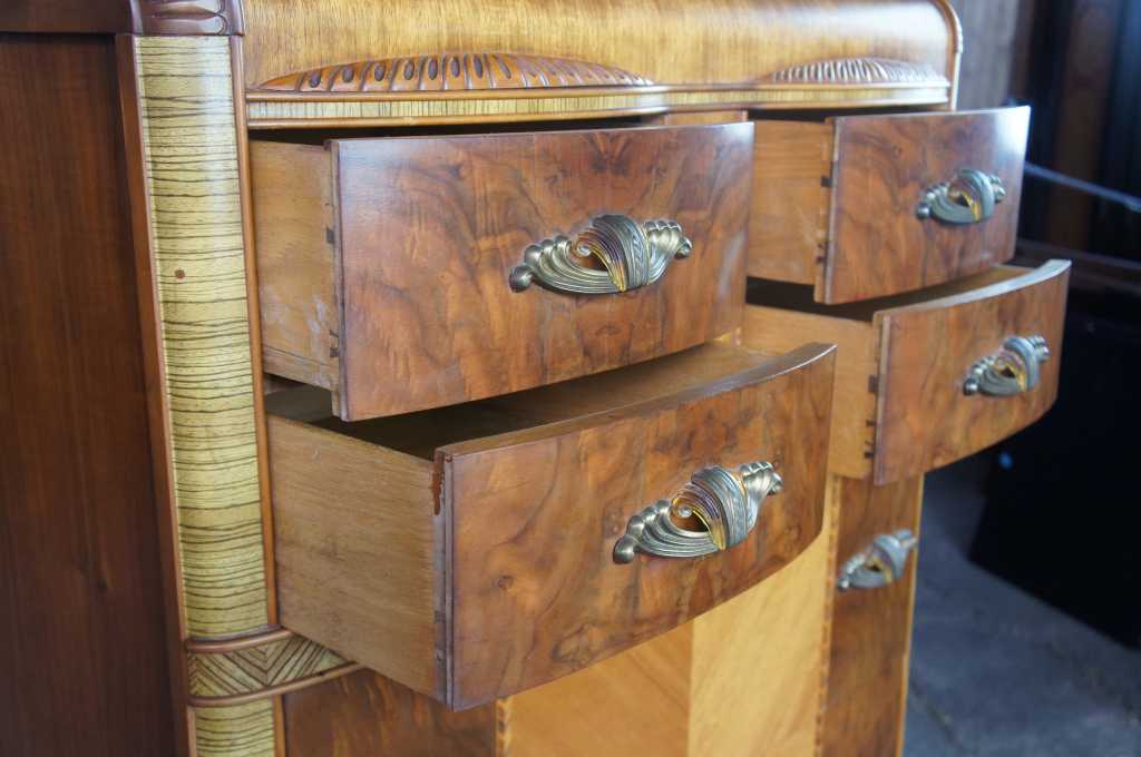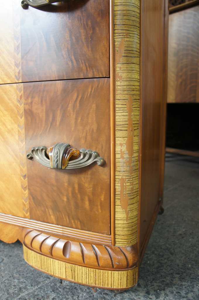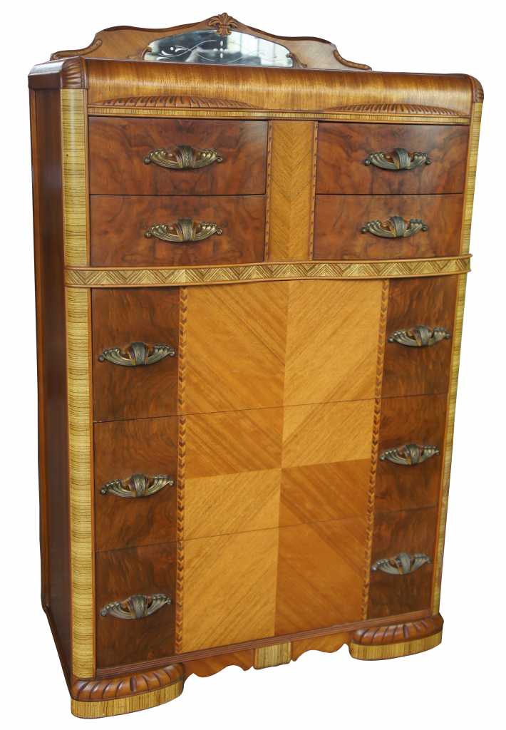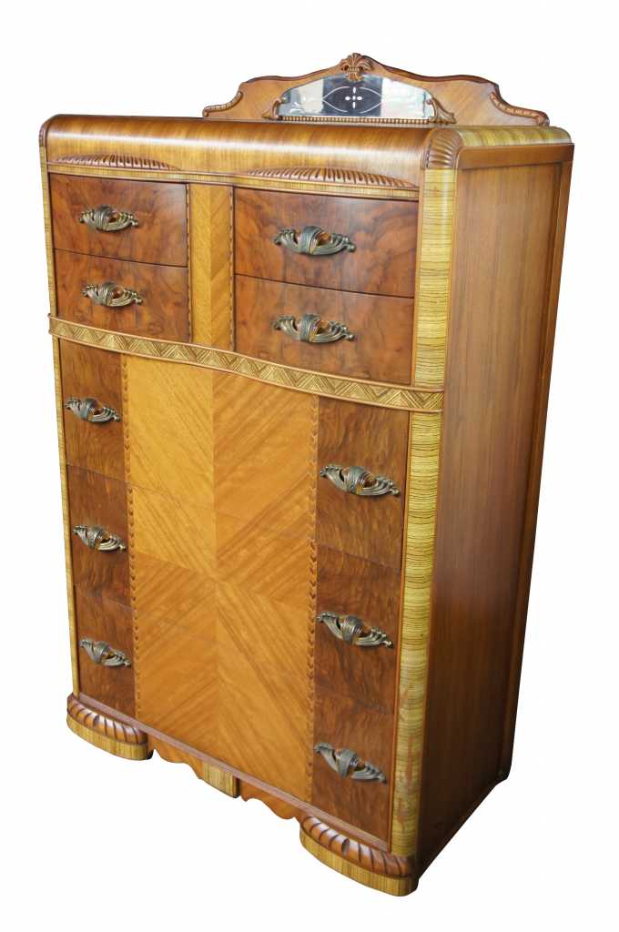 Gorgeous Art Deco era waterfall dresser, circa 1920s. Part of a two piece set. Constructed from walnut with matchbook veneered front, burlwood and fruitwood inlays. Includes seven dovetailed drawers with brass and Bakelite hardware. Includes a floral engraved mirror along the backsplash and pineapple carved finial. The perfect compliment to any setting