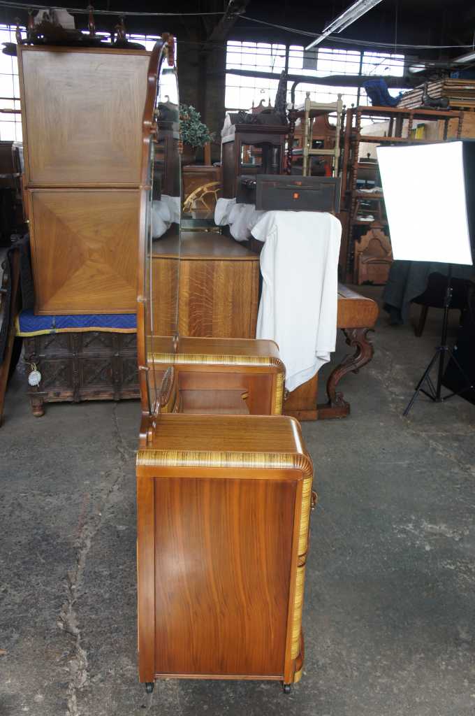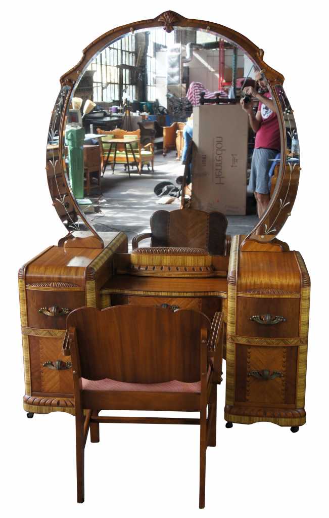 Gorgeous Art Deco era waterfall vanity and bench, circa 1920s. Part of a four piece set. Constructed from walnut with matchbook veneered front, burlwood and fruitwood inlays. Includes five dovetailed drawers with brass and Bakelite hardware. The massive round three piece mirror is both beveled and engraved with a floral design. Along the top is a fun pineapple carved finial. The perfect compliment to any setting
