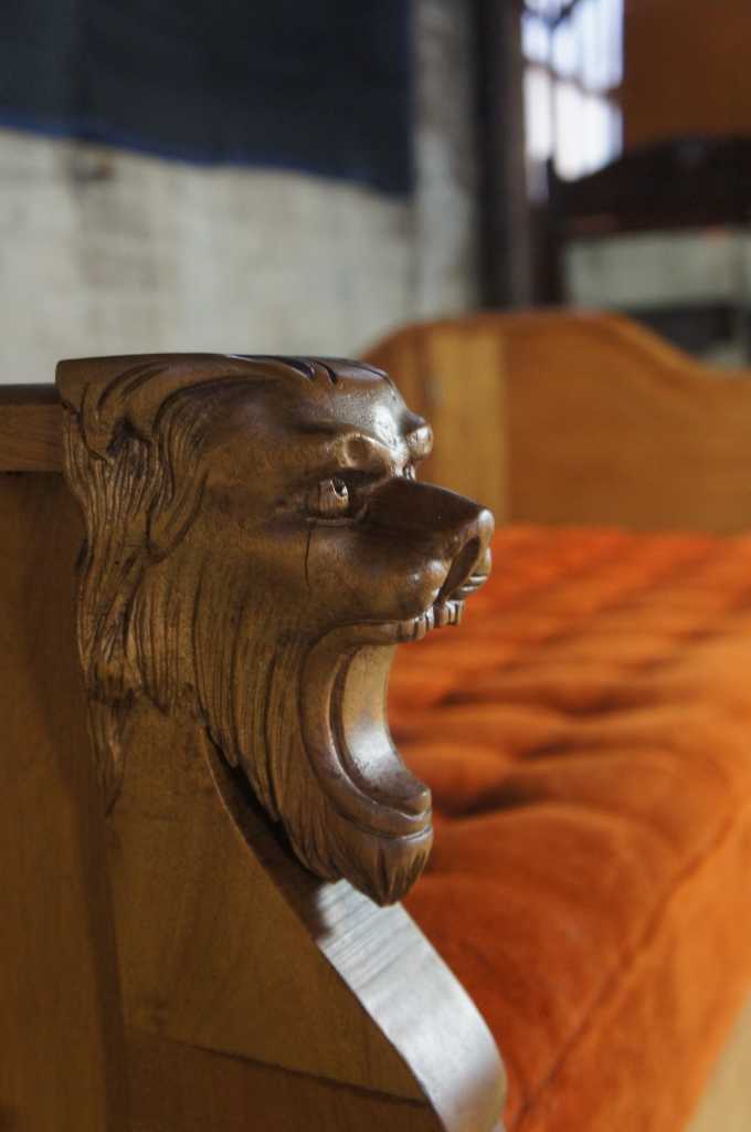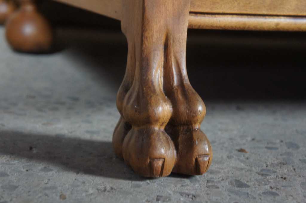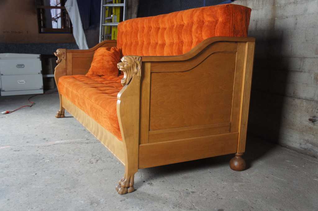 Amazing Victorian era sofa bed by Schauss MFG of Cleveland Ohio. Schauss operated from the late 19th century to the early 20th century. This sofa is made from Walnut with lion head arms leading to paw feet. Features and orange tufted seat that can quickly turn into a lounge or day bed.
