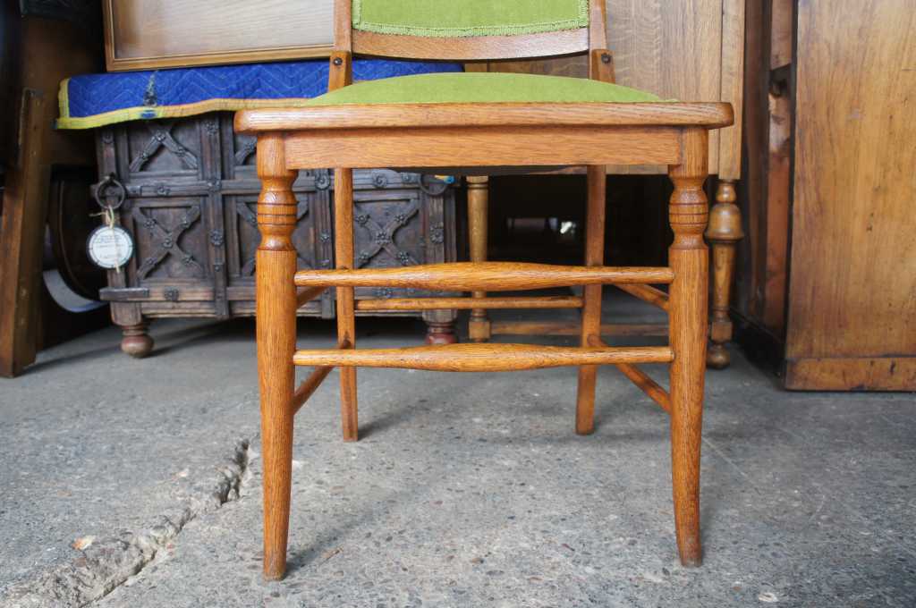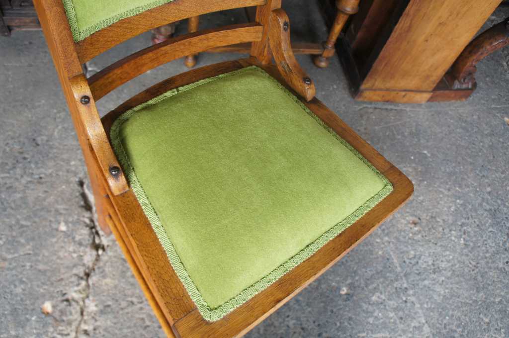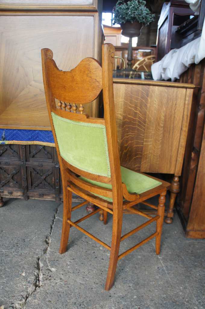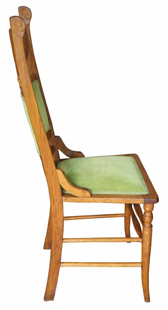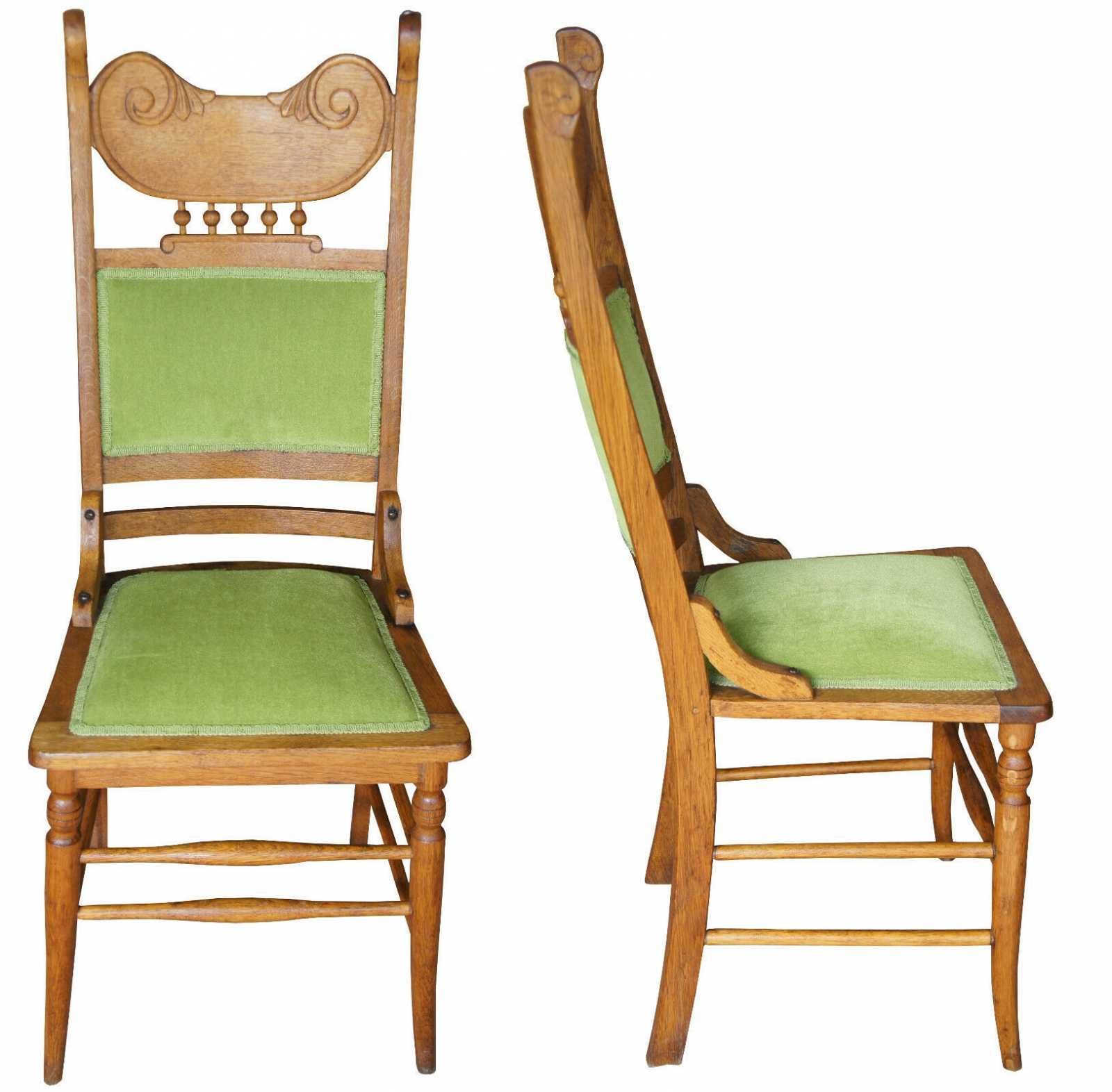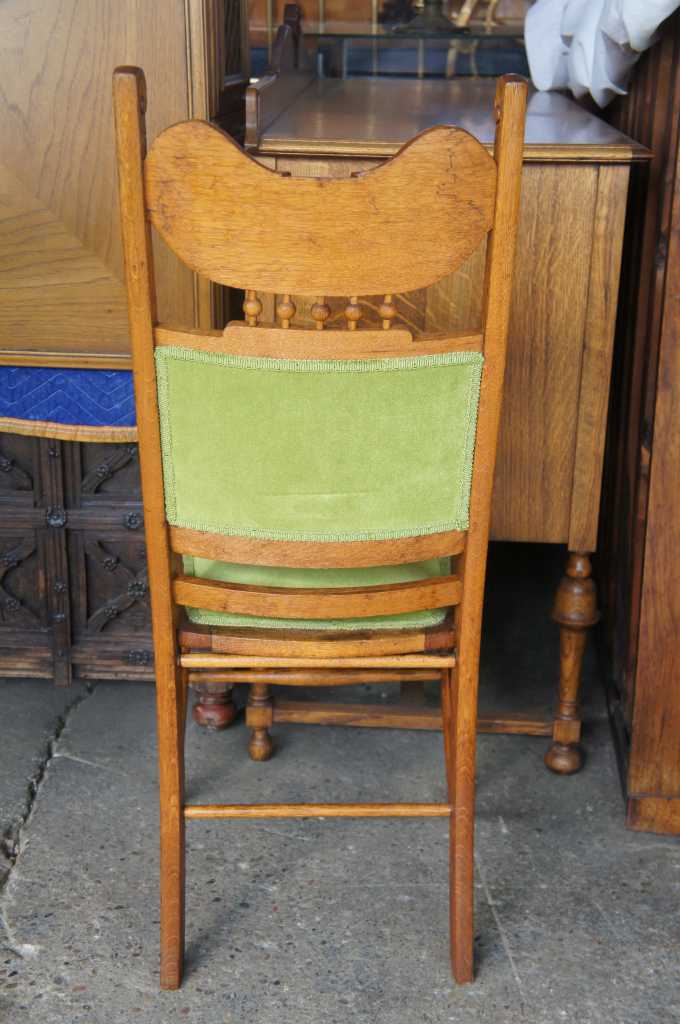 2 Late Victorian oak side chair. Features a high back with spindled and carved accents. Upholstered in green with spring seat. Additional matching upholstered gentleman's Chair is available.
