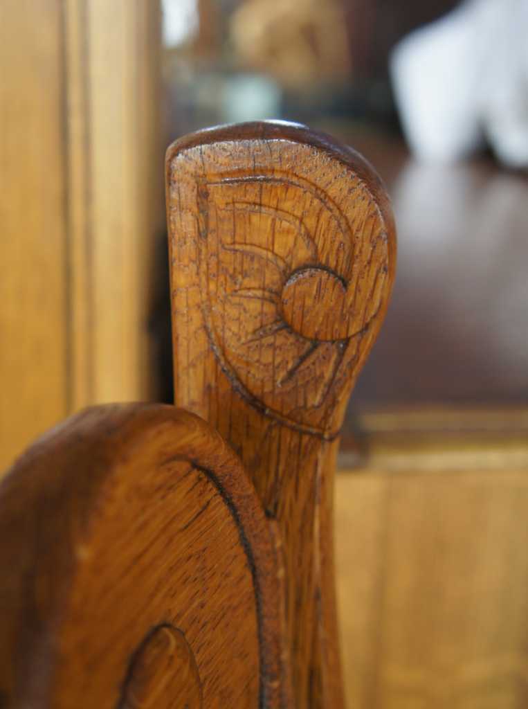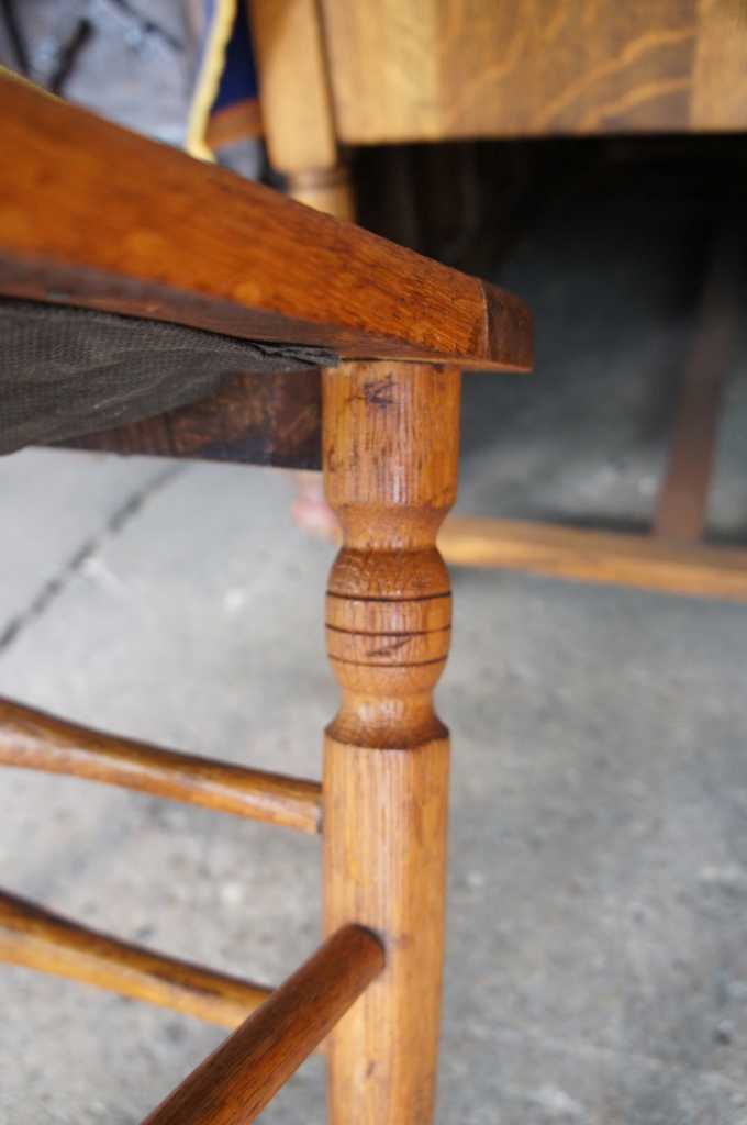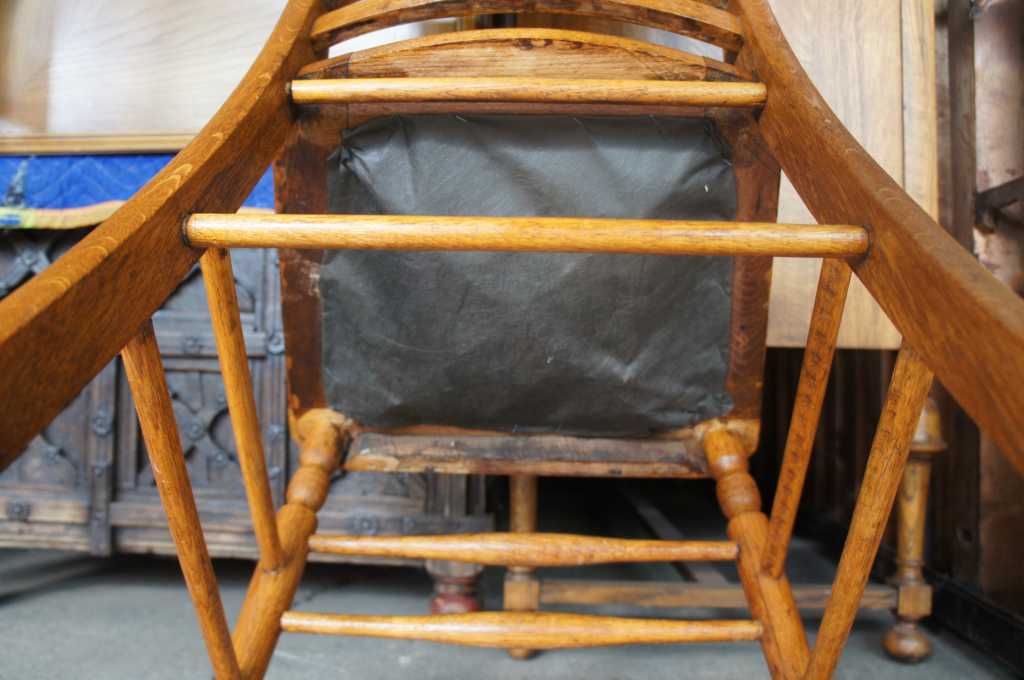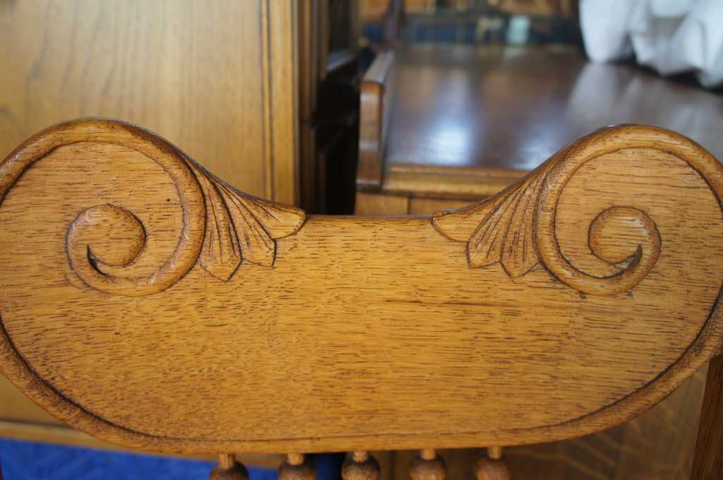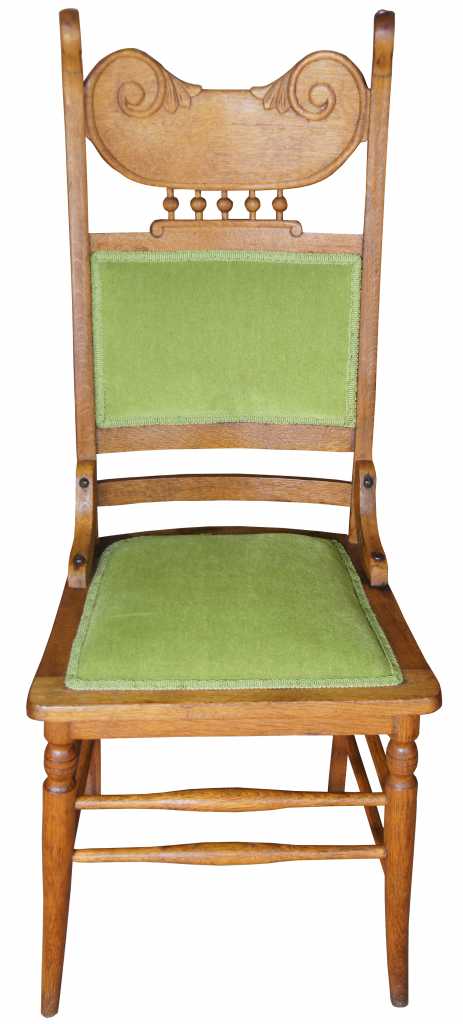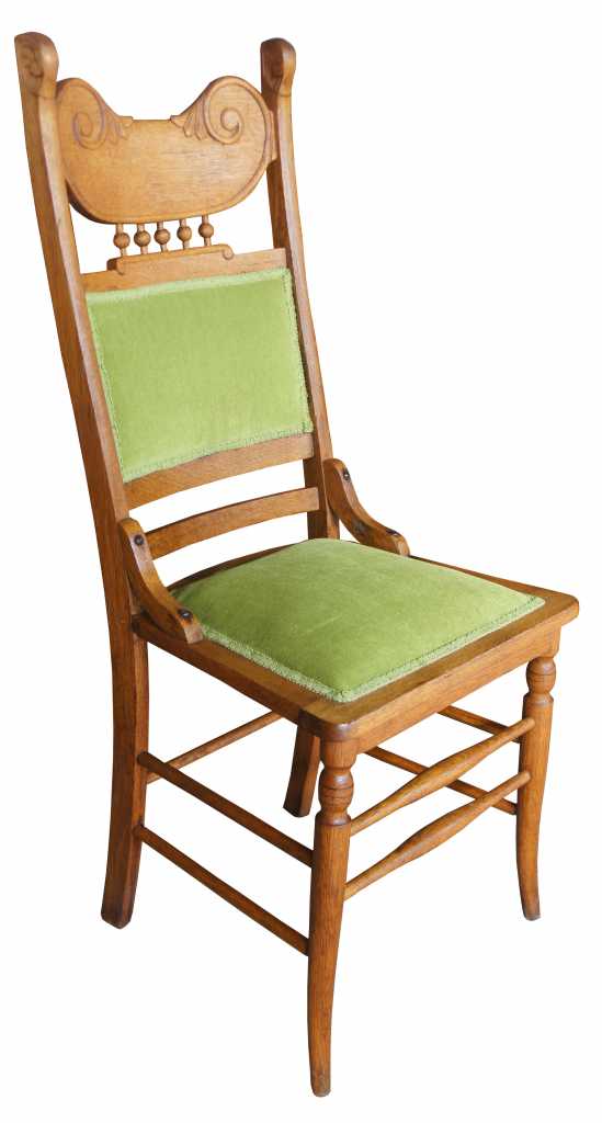 2 Late Victorian oak side chair. Features a high back with spindled and carved accents. Upholstered in green with spring seat. Additional matching upholstered gentleman's Chair is available.