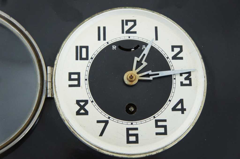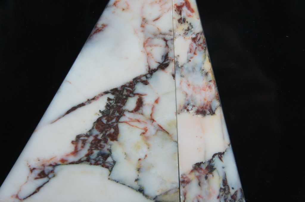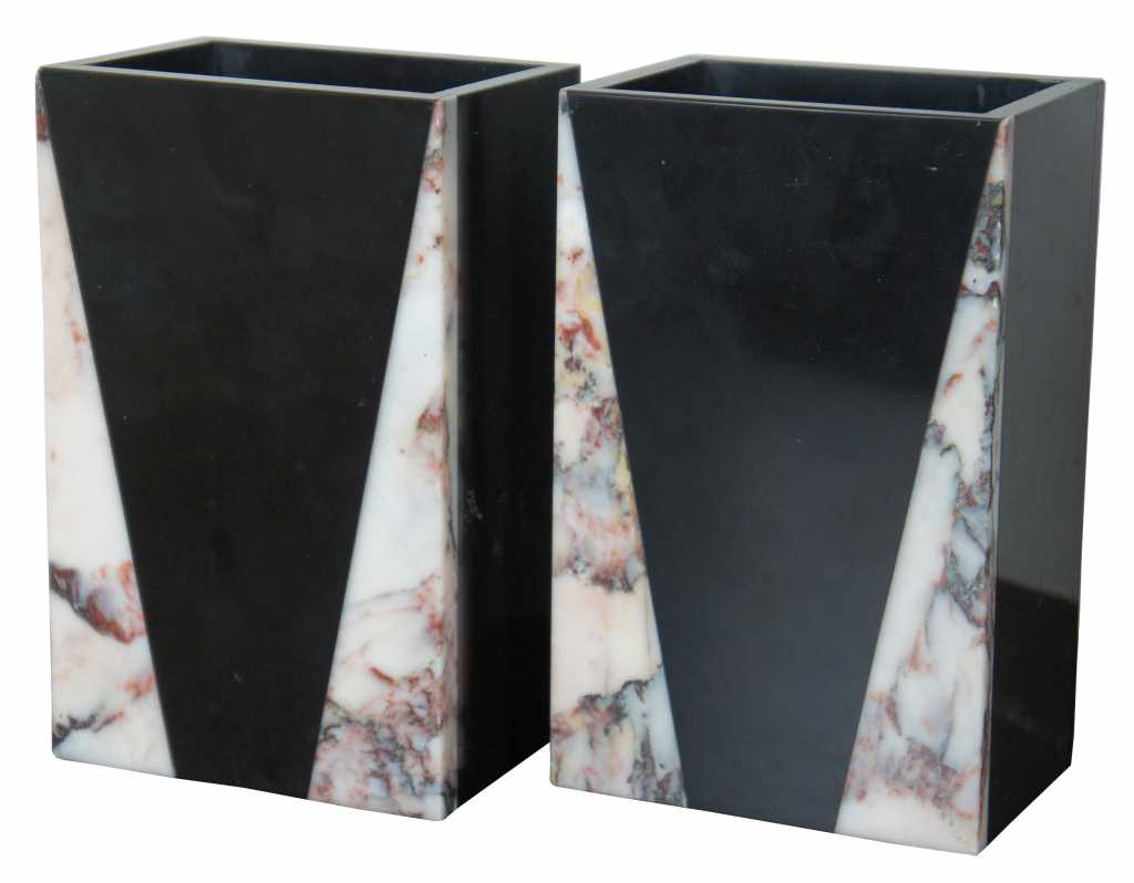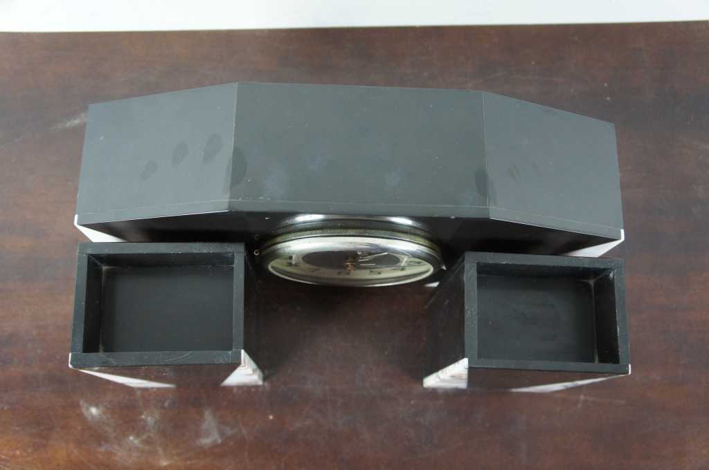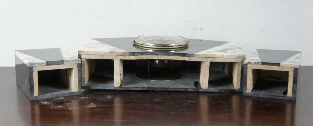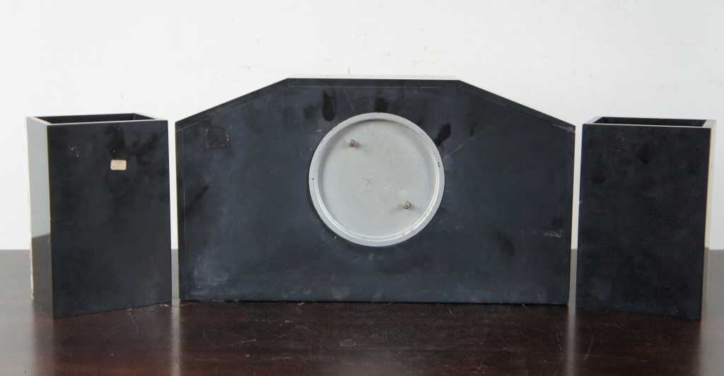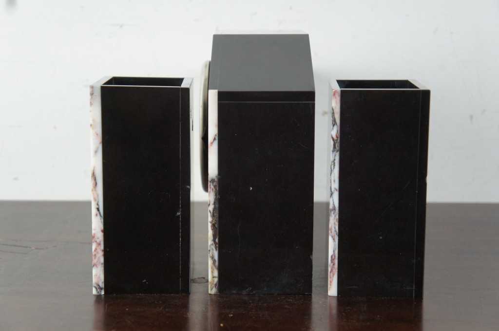Circa 1930s Art Deco Clock & Garniture set. Onyx and white marble with pink grain. The perfect compliment to any setting