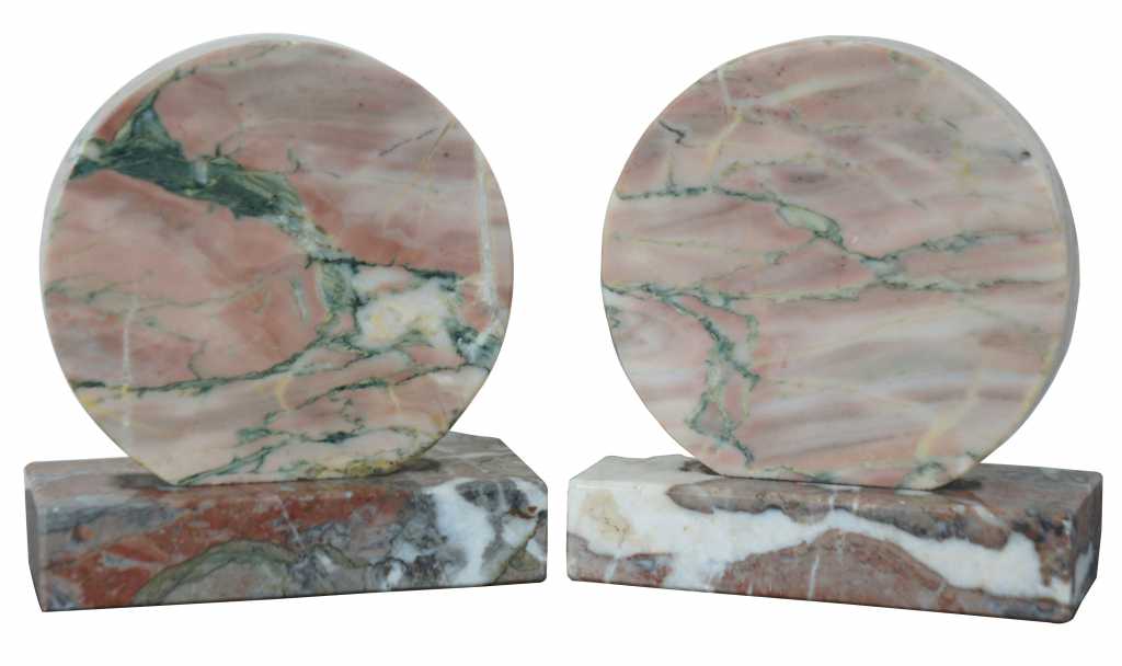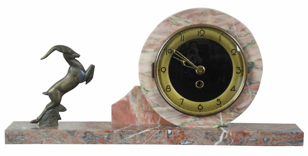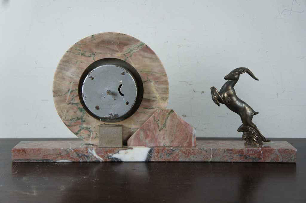Circa 1930s garniture clock set. Made from pink marble with cast bronze leaping goat along the left. Clock is marked Marefbay. Great for use along at your desk or along the fireplace.