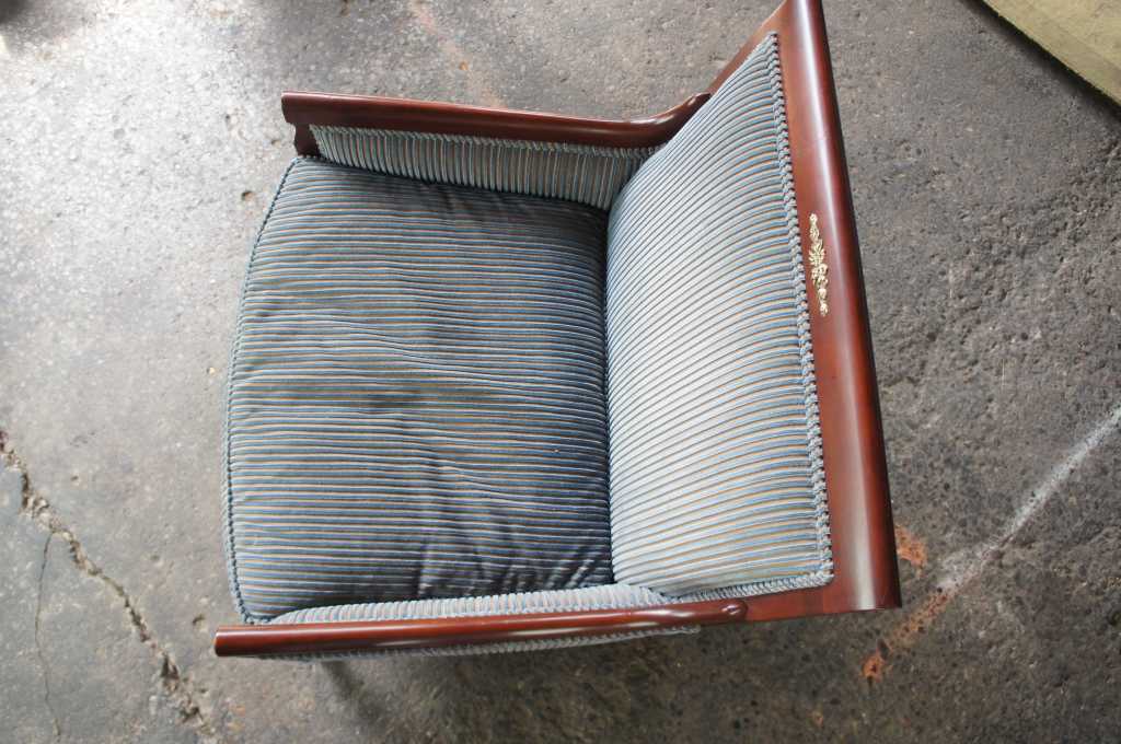 Made from mahogany with brass mounts and a blue striped corduroy upholstery.