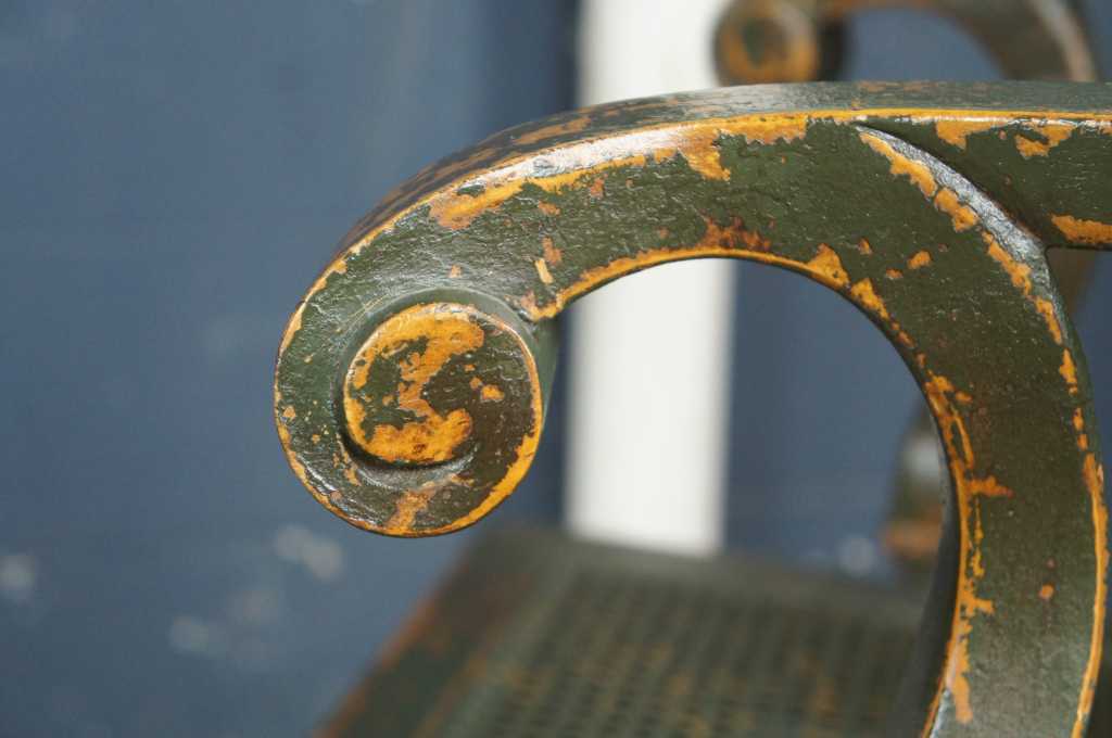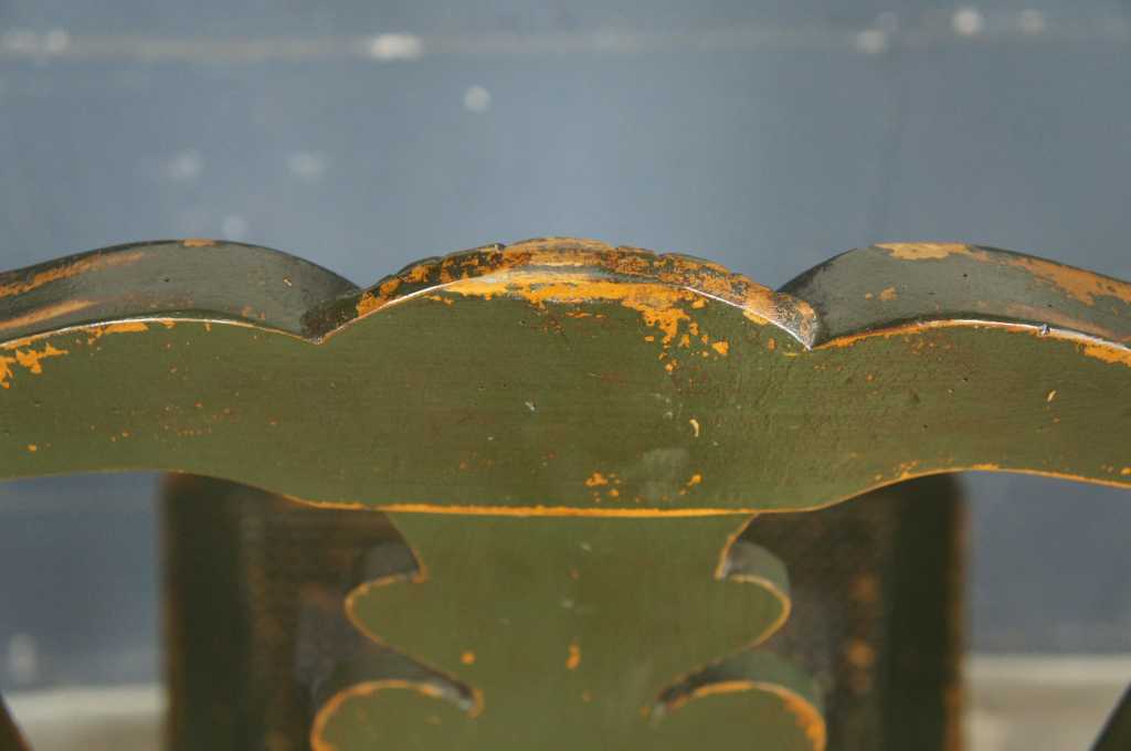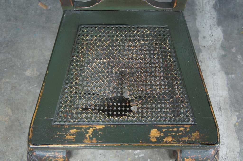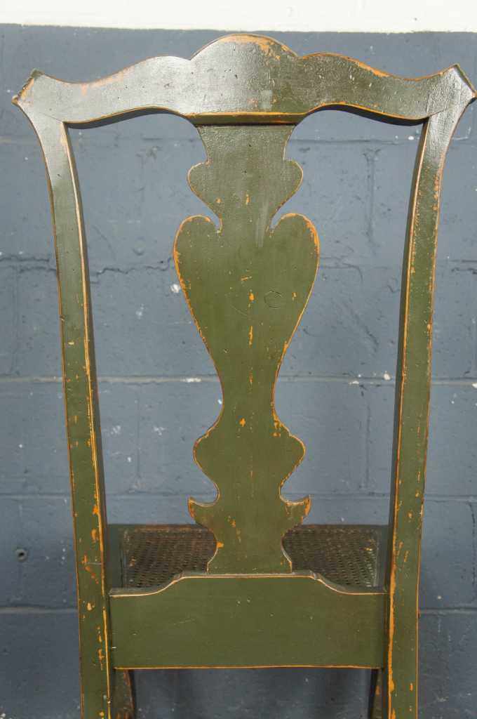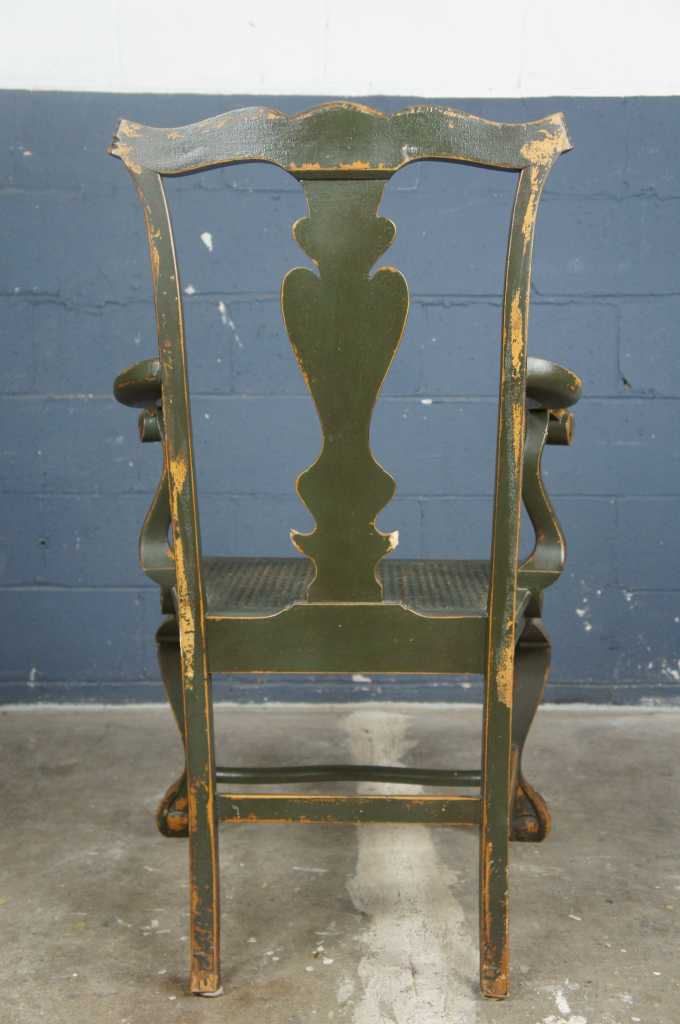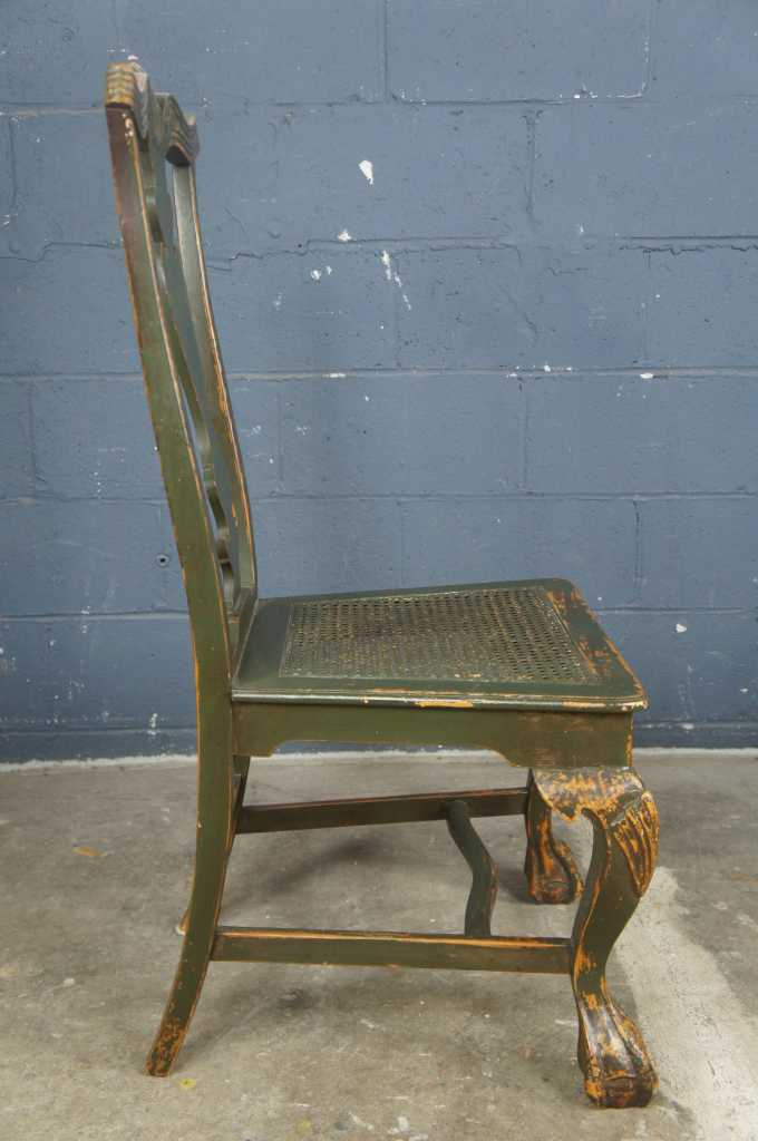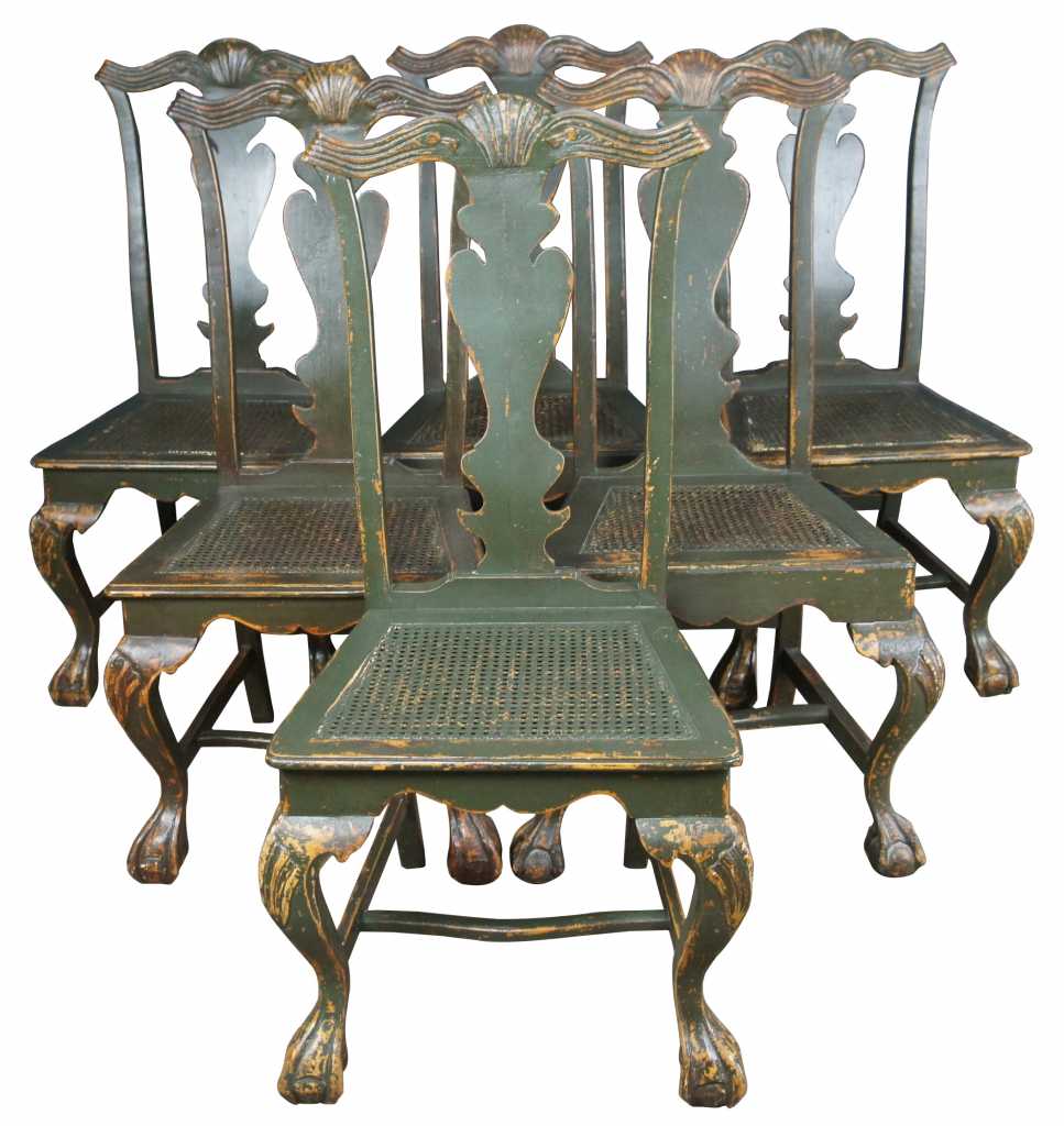 A gorgeous set of 19th century Chippendale inspired dining chairs. Distressed green with caned seats. Features a vase shaped splat and serpentine scalloped back. Cabriole legs connected by an H stretcher lead to ball and claw feet