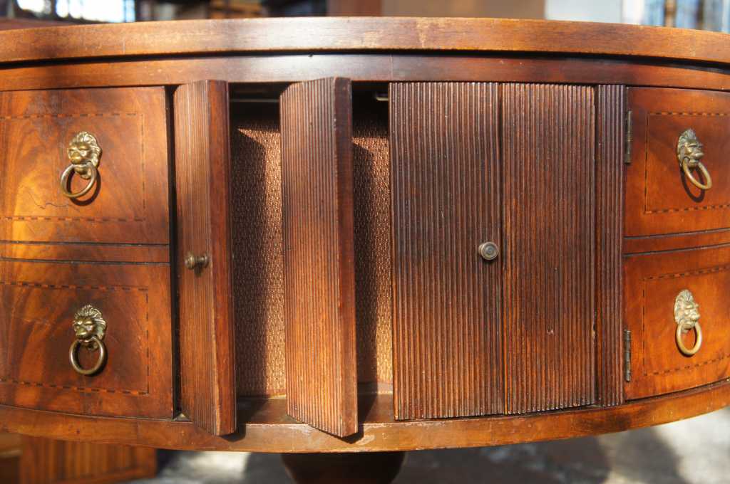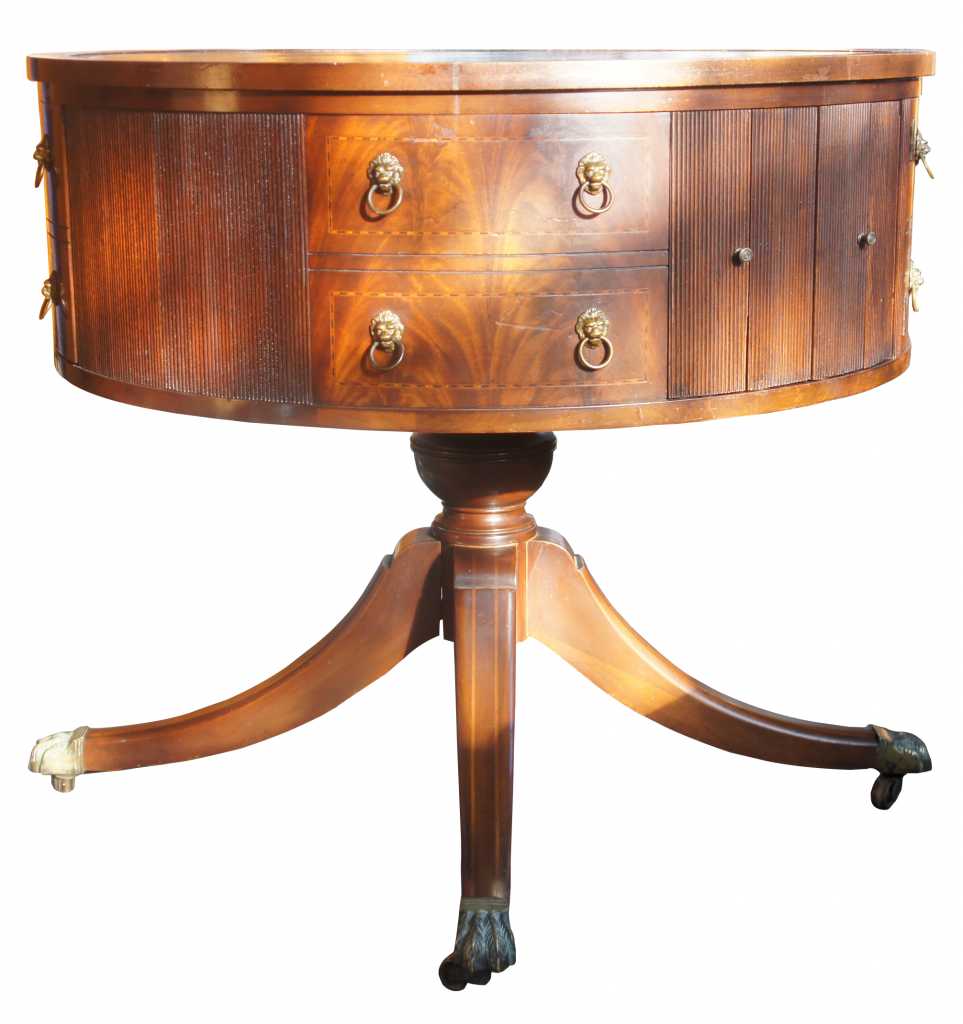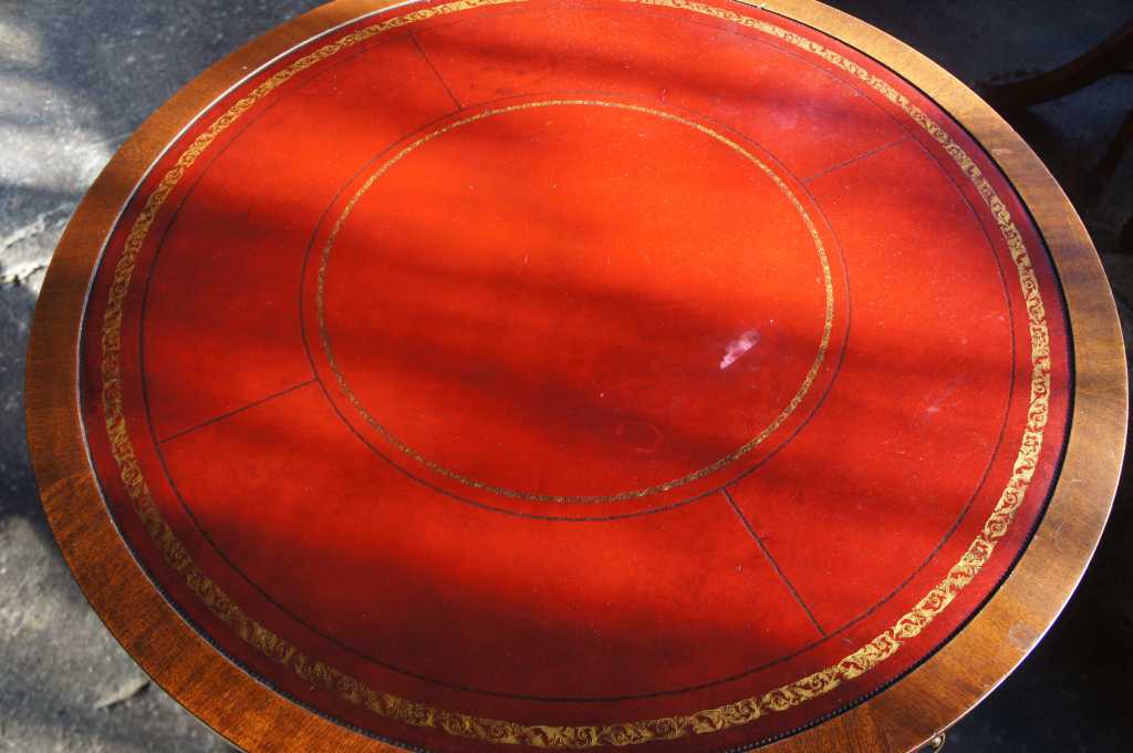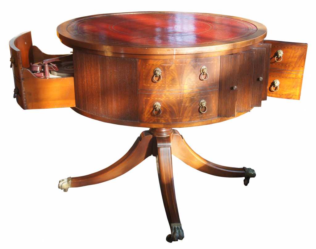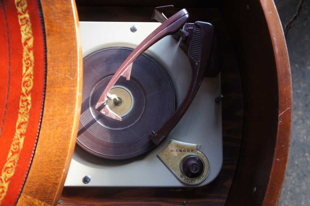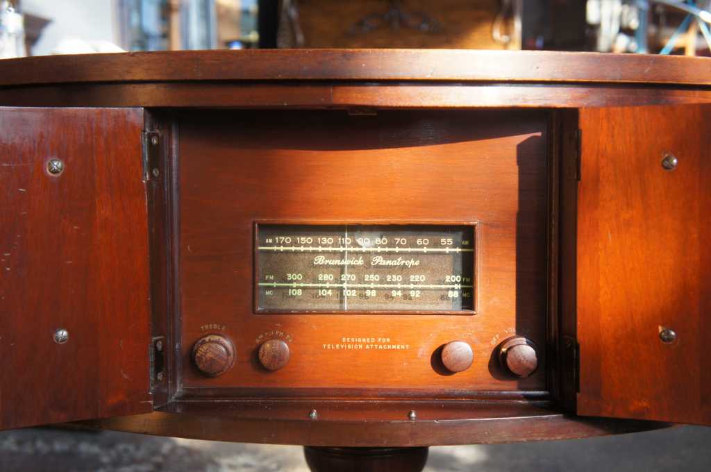 An extremely rare piece that both fits the aesthetic and musical value for any collector. Complete with a radio, phonograph and auxiliary capabilities. Made from Mahogany with a red leather top. Inside are 2 speakers that sound great, but could also easily be updated.