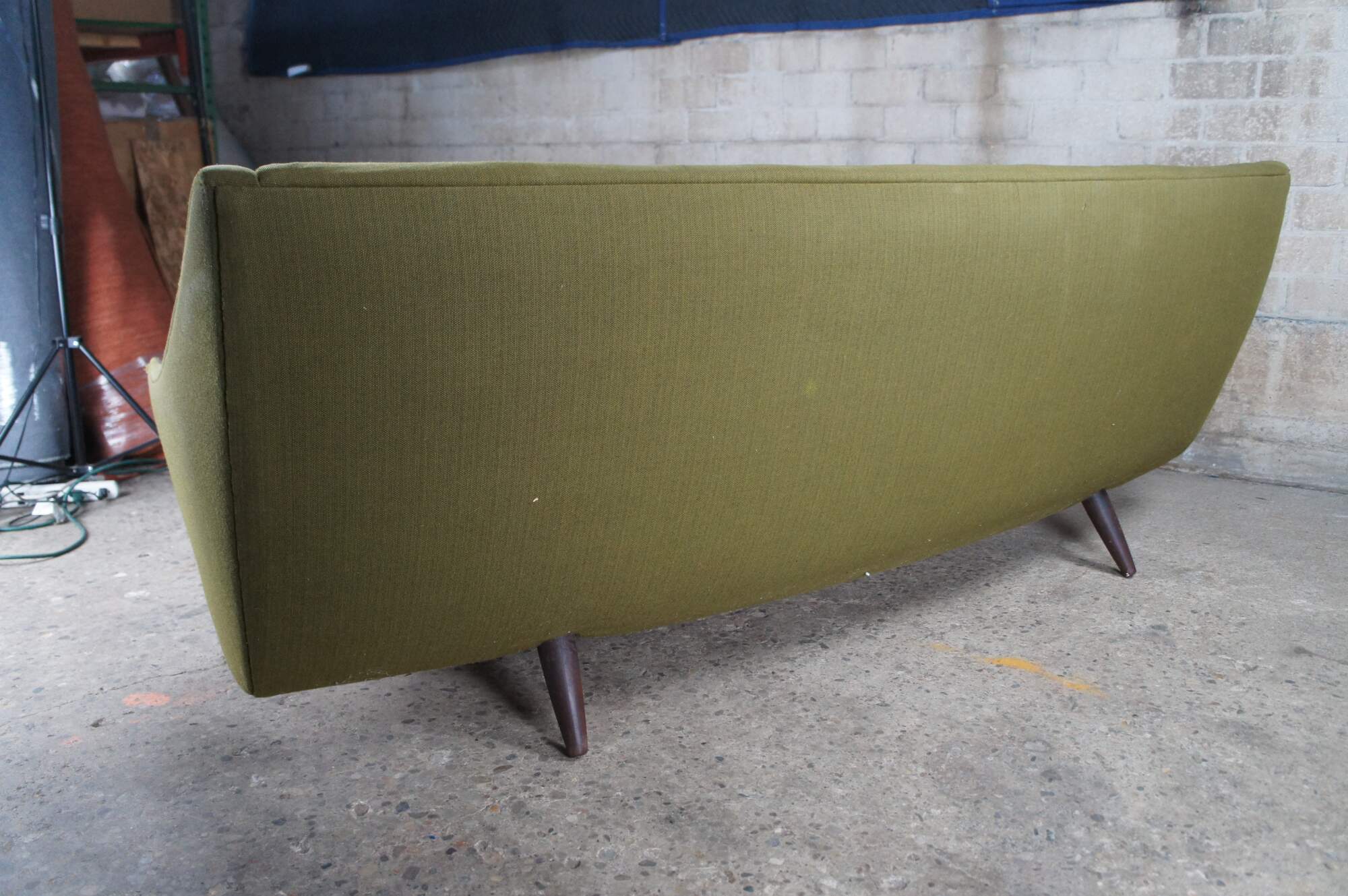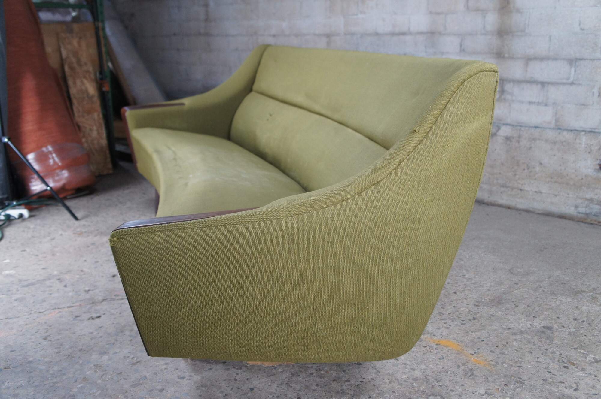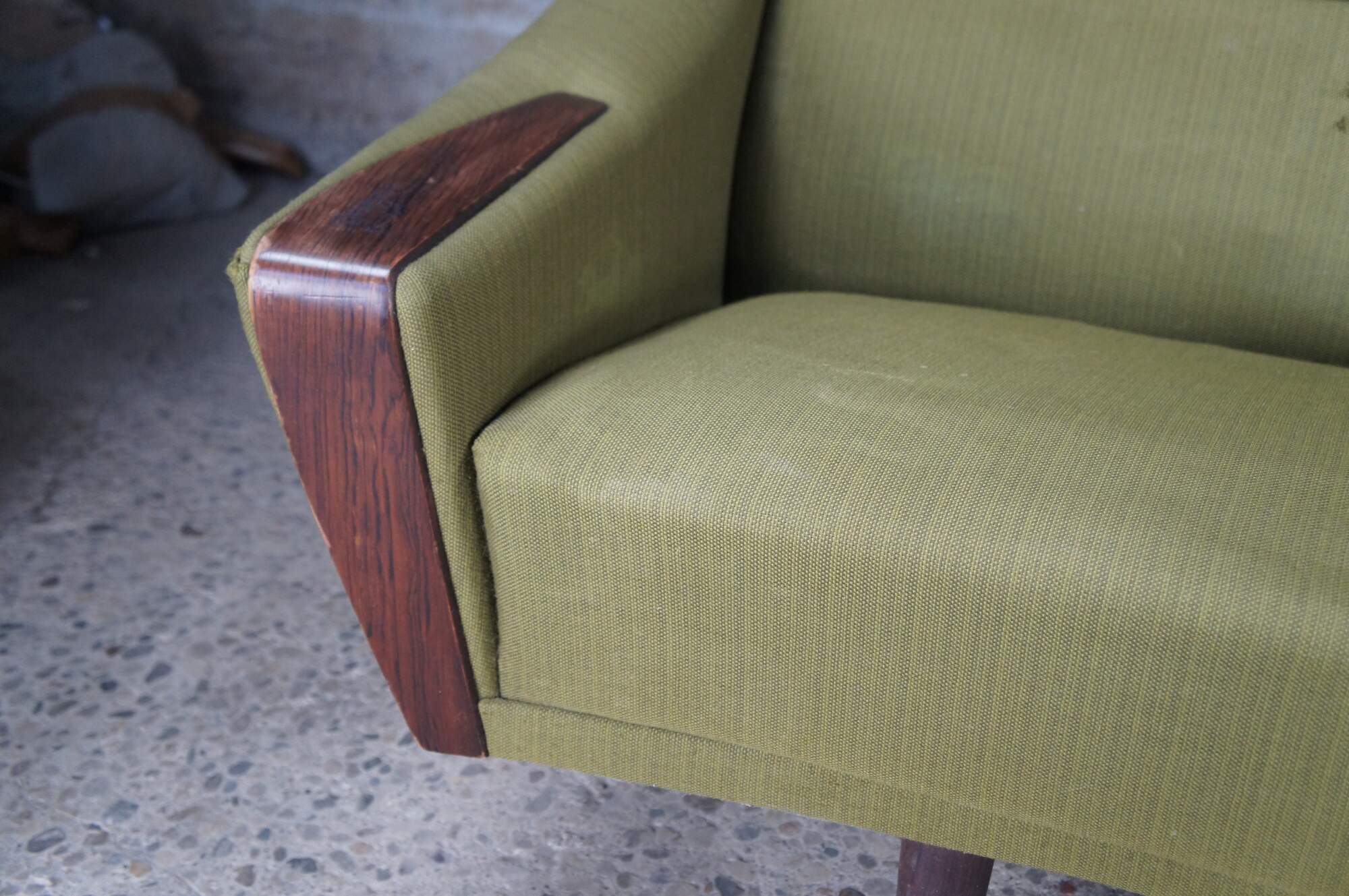 Rare mid century modern Severin Hansen sofa / couch or love seat featuring a bow front shape with rosewood arm rests and tapered legs.