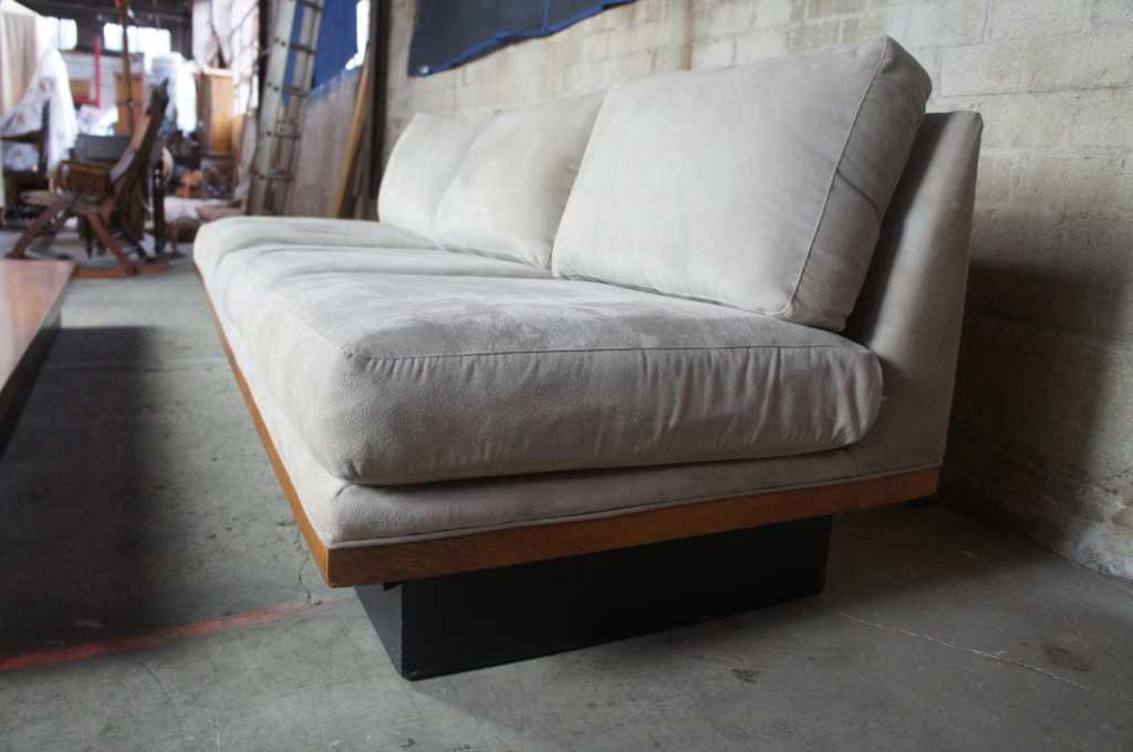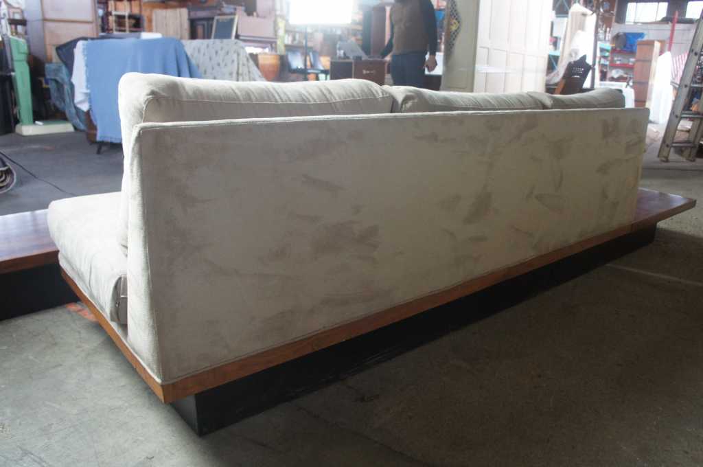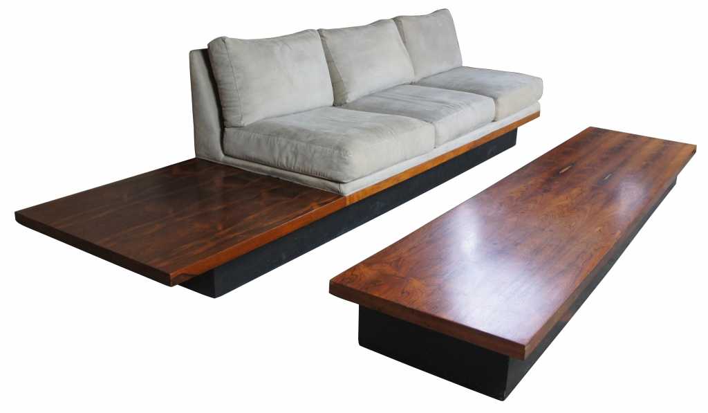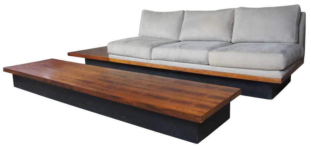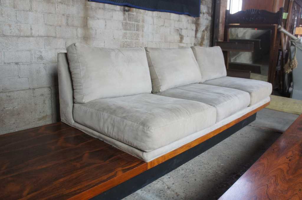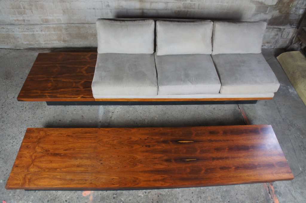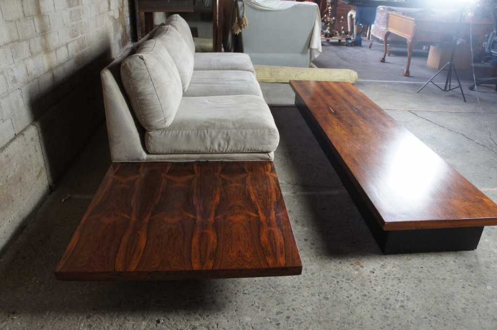 1968 Milo Baughman for Thayer Koggin platform floating sofa and coffee table. Table number 474 with Rosewood top and black base. Grey upholstery.