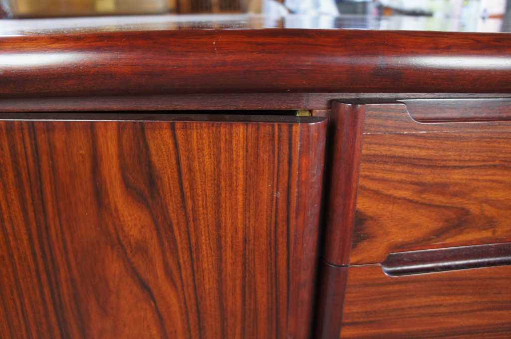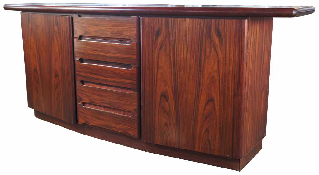 Danish Modern sideboard by Skovby Mobelfabrik. Features a bow front with a wing shaped top. Made from Rosewood with five drawers flanked by outer cabinets with two interior adjustable shelves. Upper two drawers are felt lined.