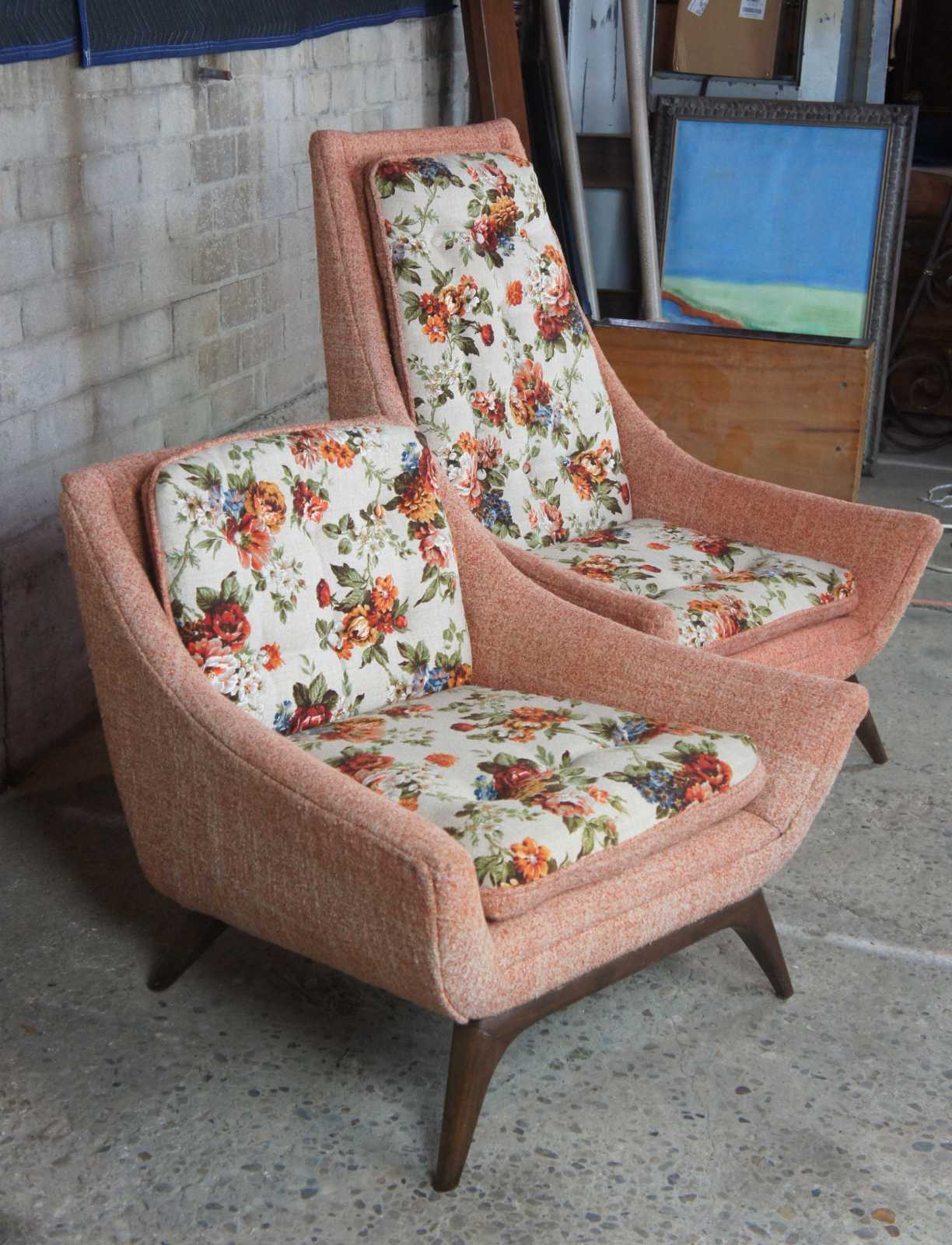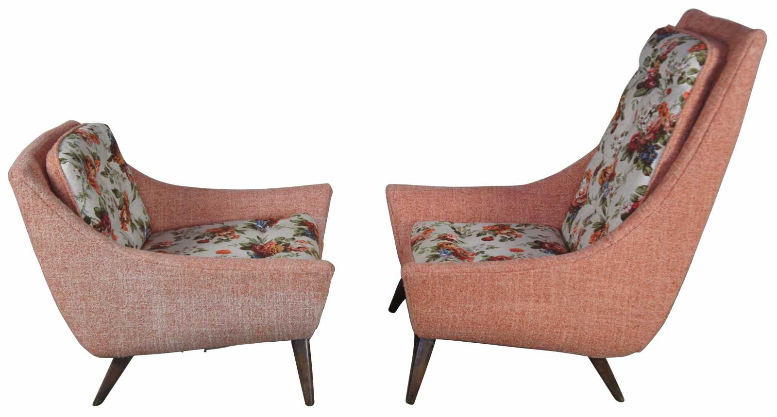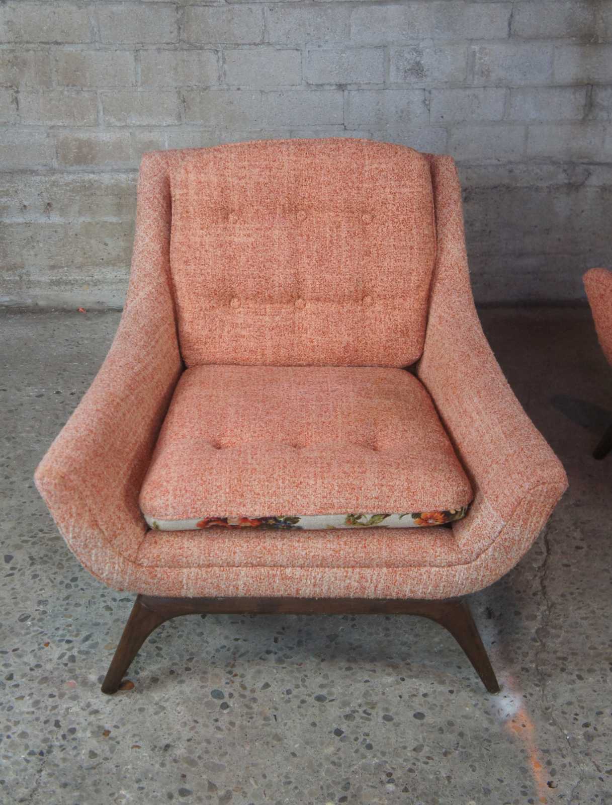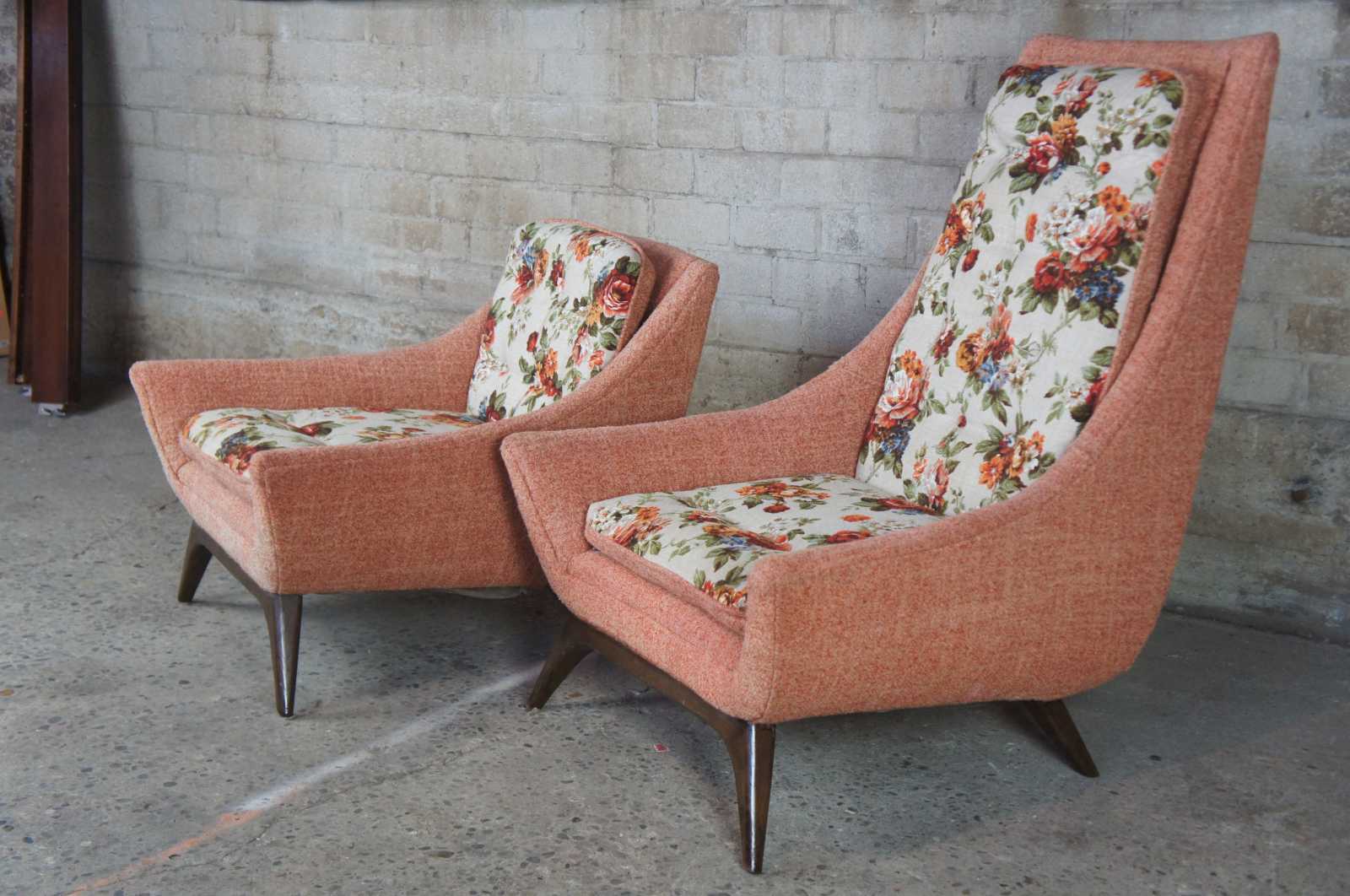 Adrian Pearsall mid century modern 1960s lounge chairs. Upholstered in a peach colour with floral cushions, resting upon walnut legs/feet.