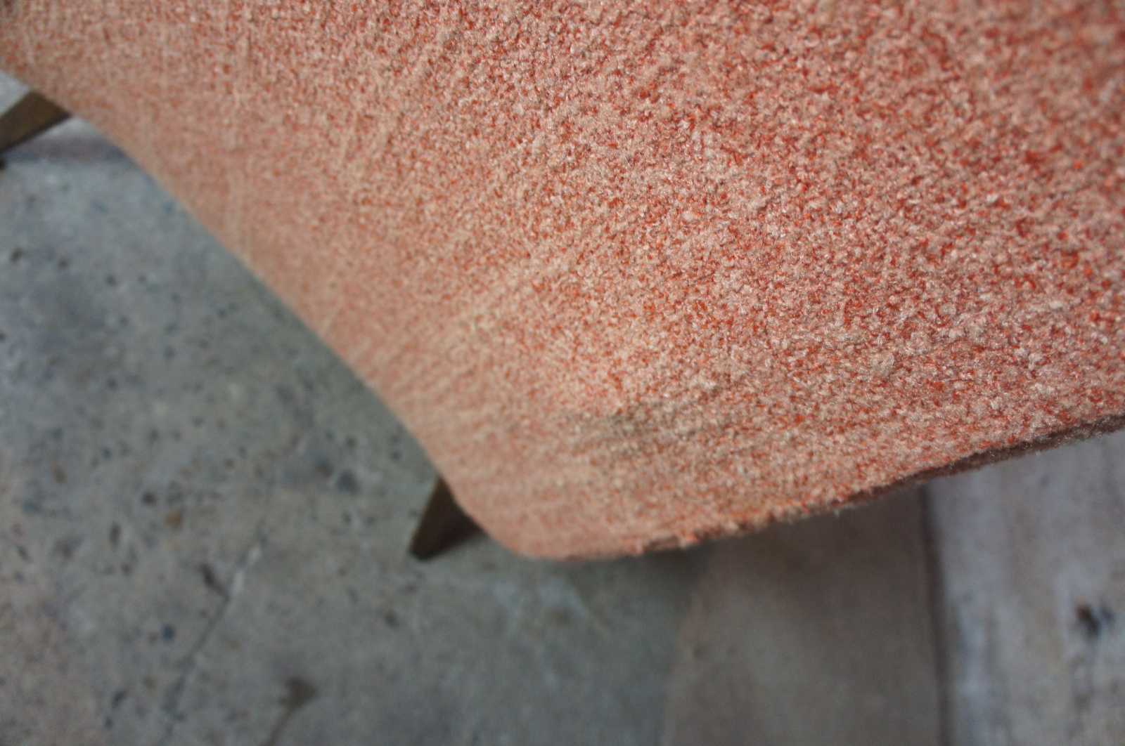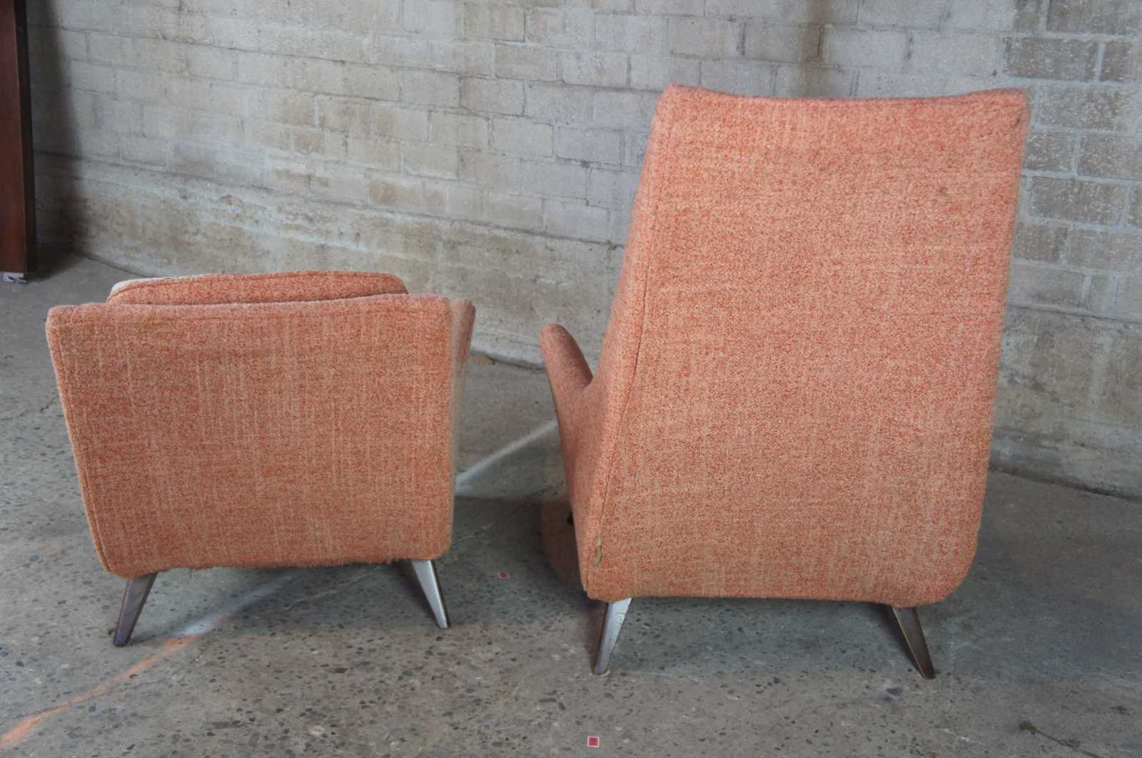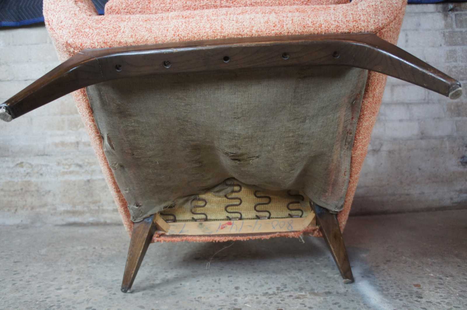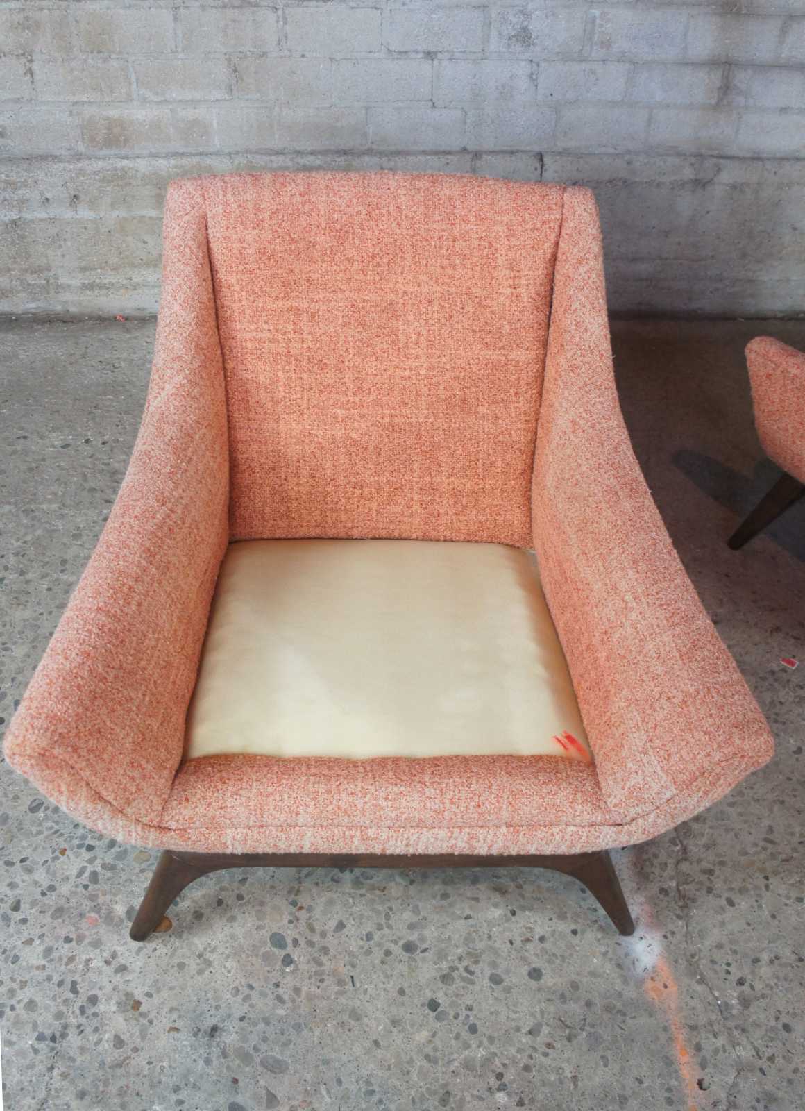 Adrian Pearsall mid century modern 1960s lounge chairs. Upholstered in a peach colour with floral cushions, resting upon walnut legs/feet.