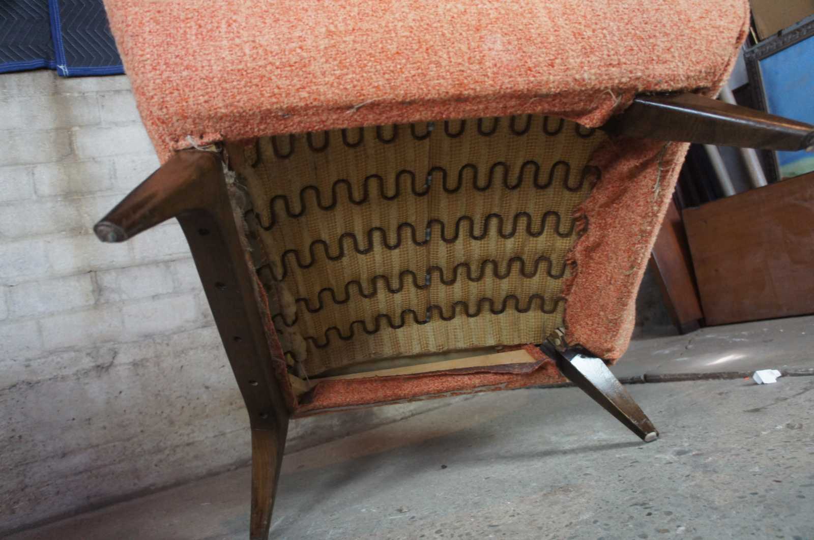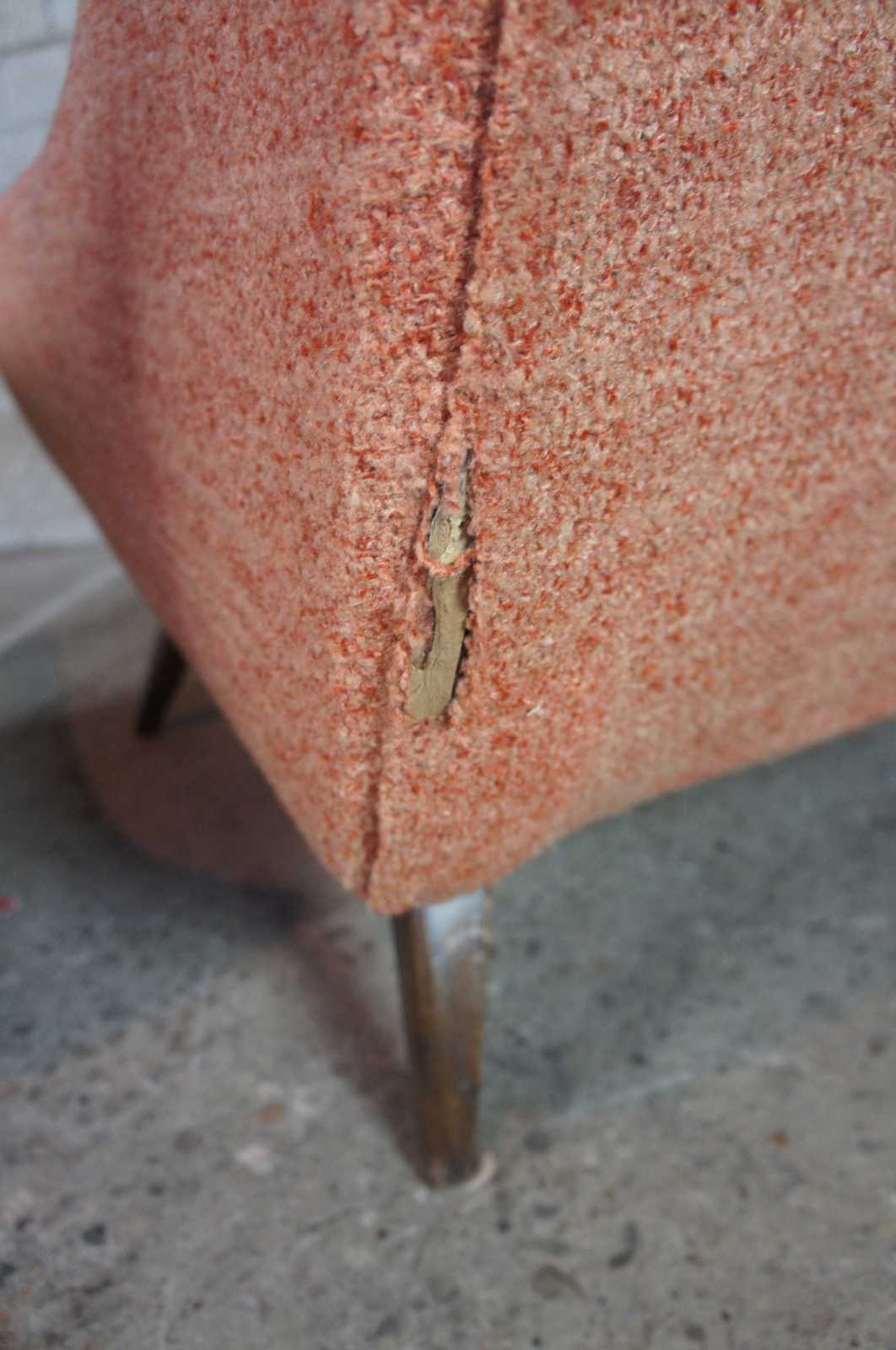 Good overall, some fading / distressing to upholstery, tear and spring poking from back of larger chair, see pictures
