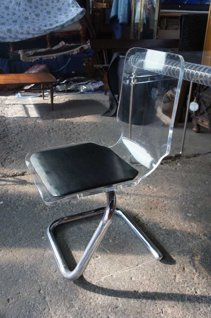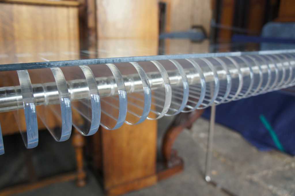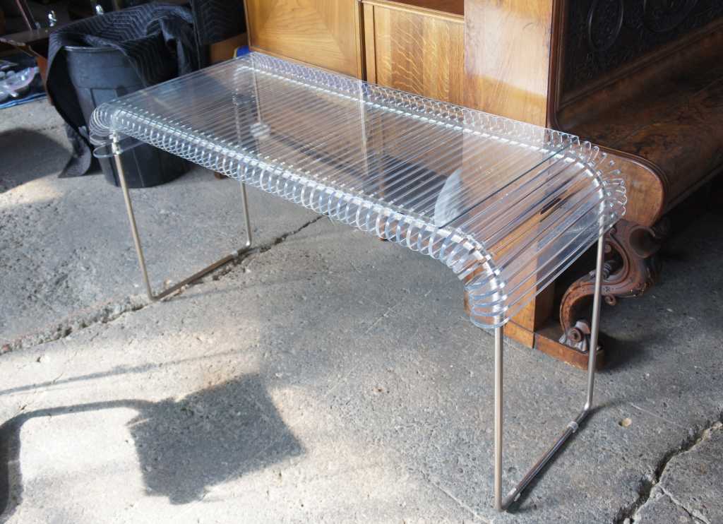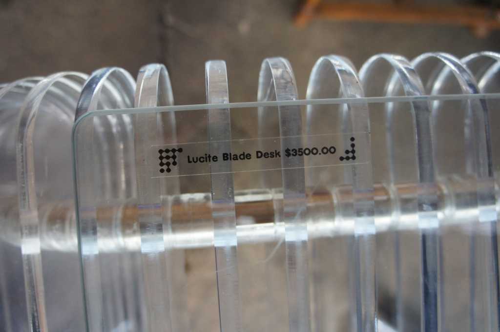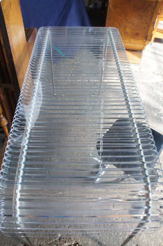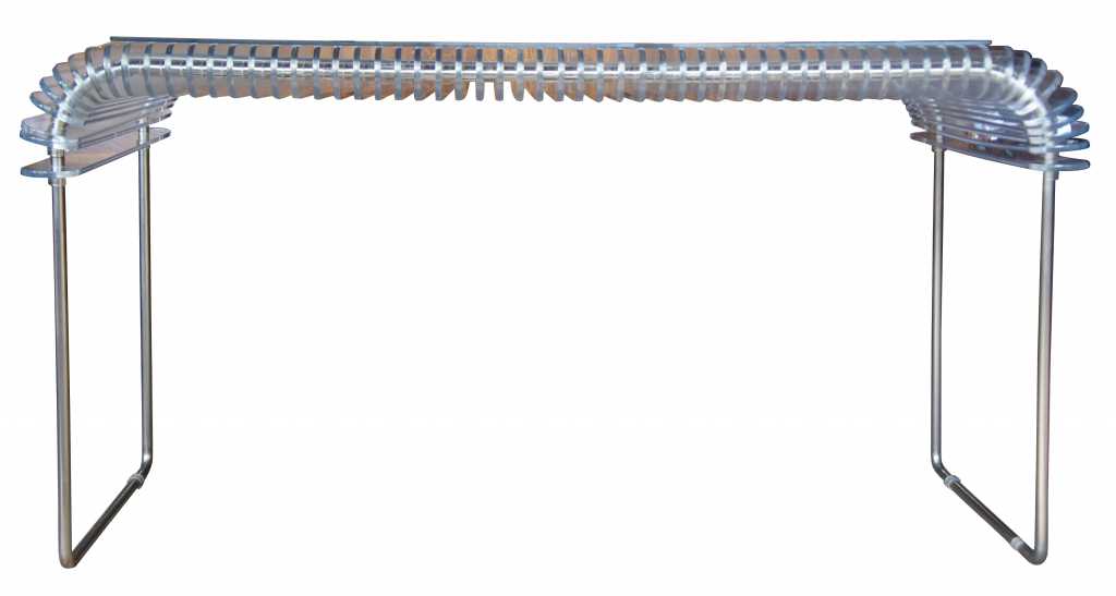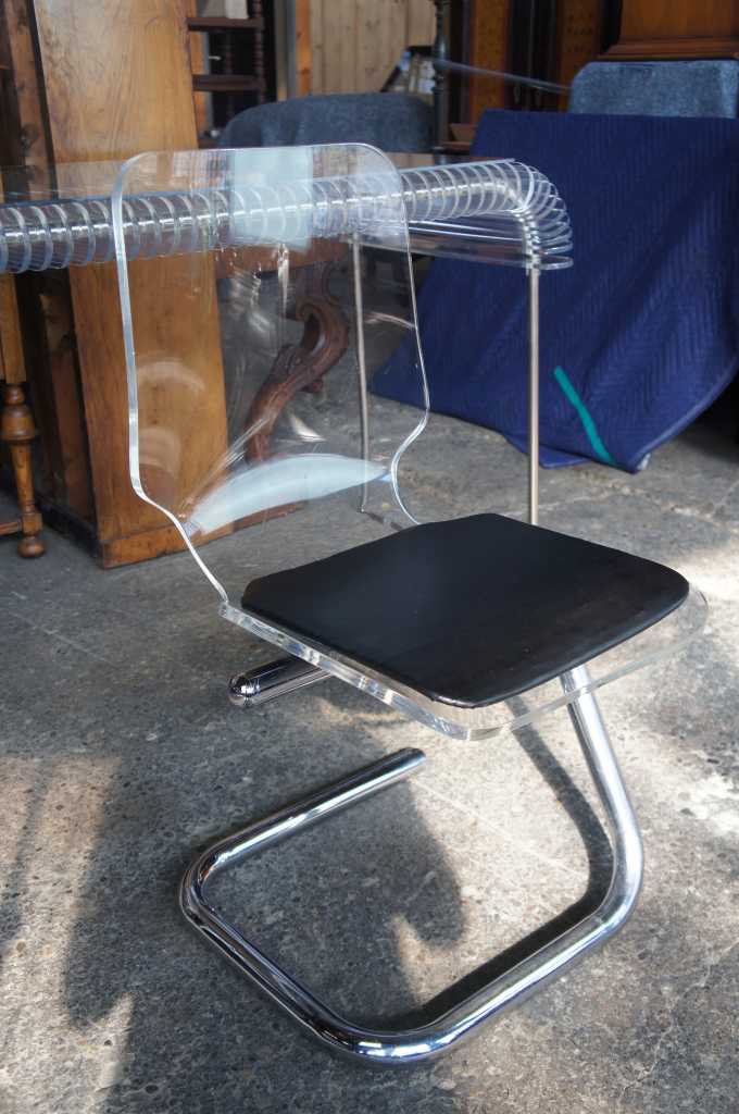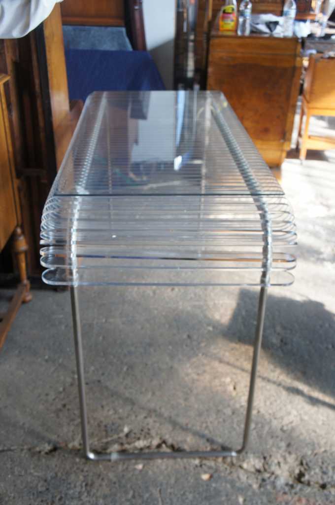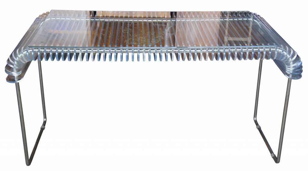 The was a unique prototype desk from the 1960s. Features a fanned lucite top over metal base and lucite Z chair. Great for an office, library or could be used as a side board or sofa console table.