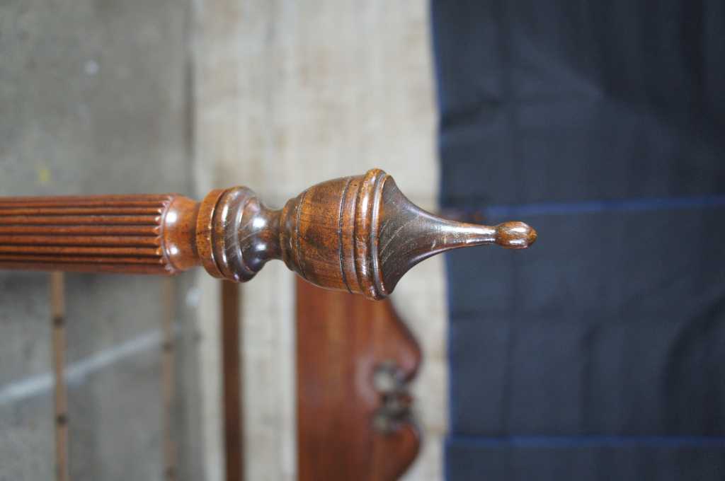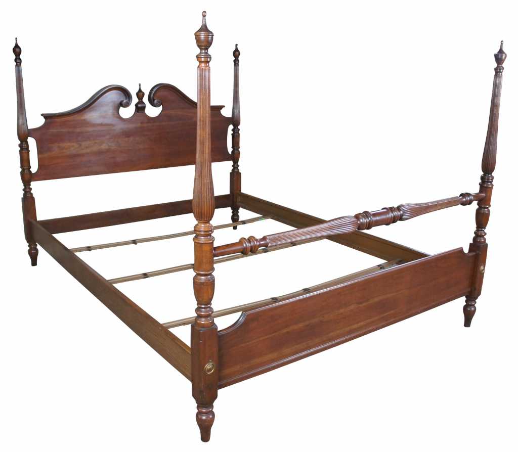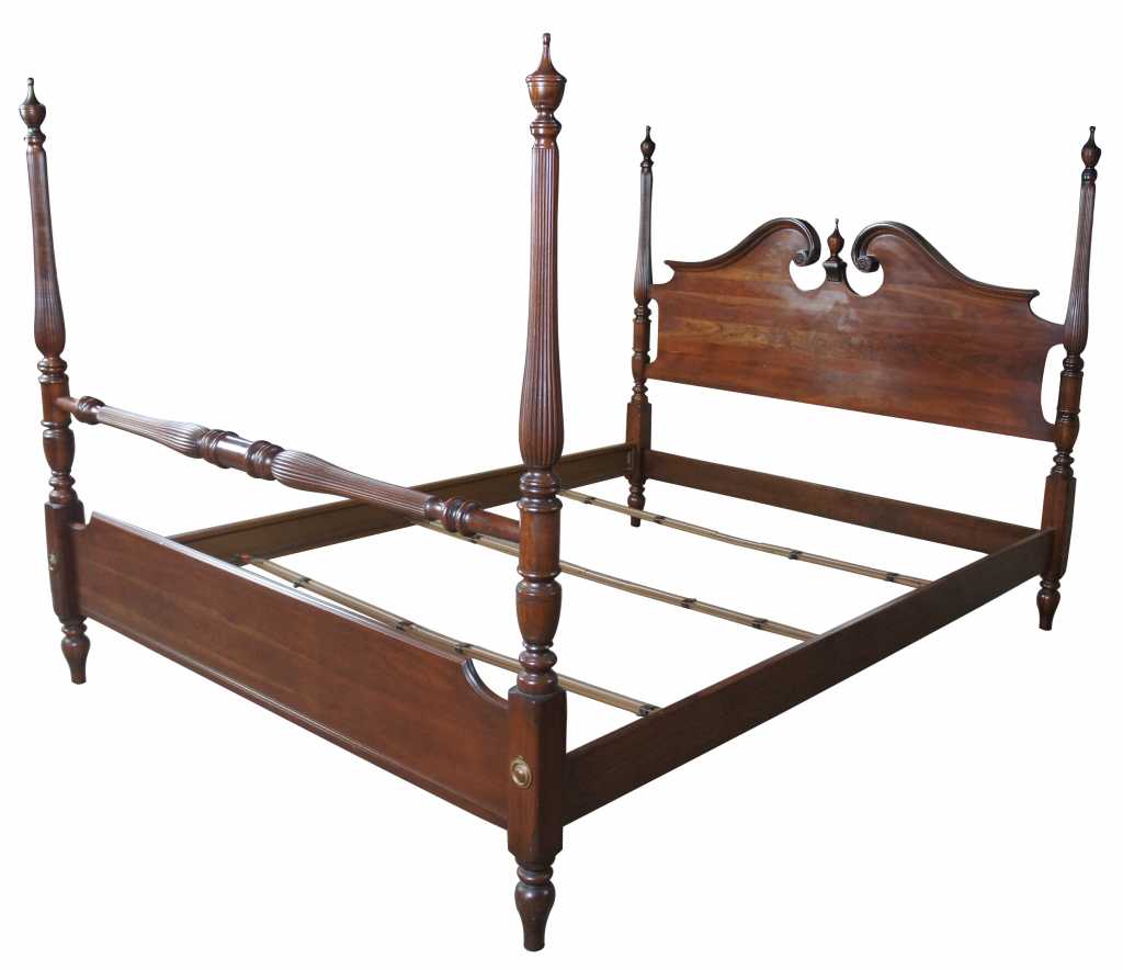 Vintage Ethan Allen Queen bed frame. Features a 4 poster pediment style in solid cherry, in warm brown georgian court finish. Includes wood grain finish bed rails with metal supports. Page 37 of the Ethan Allen treasury suppliment and pictoral index.