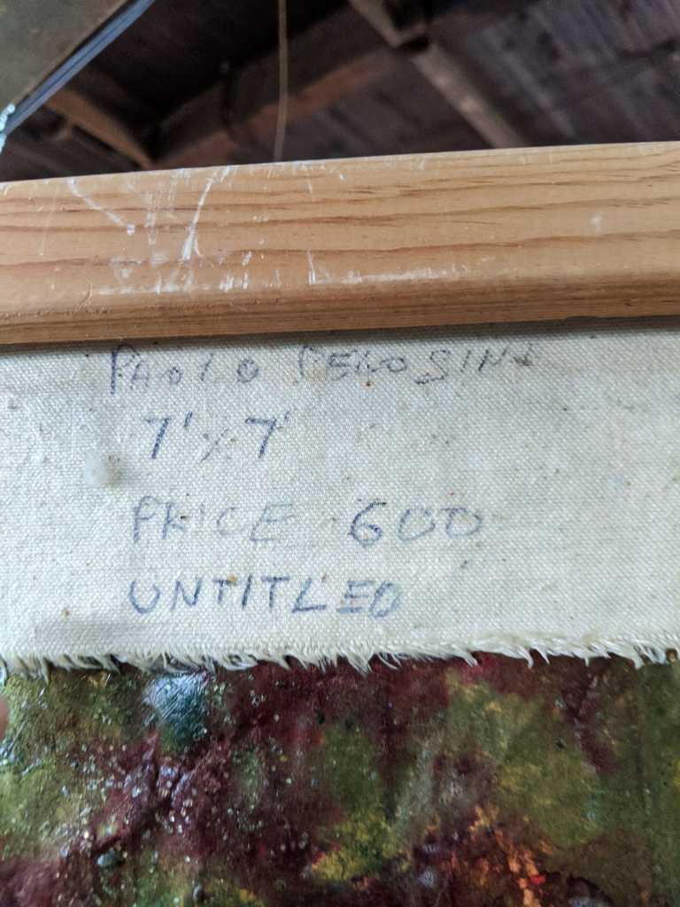 Leather tapestry artwork by Paolo Pelosini. Untiled. Paolo began his journey as a painter. He graduated from the Instituto D'Arte of Lucca in 1964 and from the Accademia D'arte of Florence in 1969. That year he moved to the U S and enroled in the M F A program at the University of Minnesota. In 1970 he switched to painting Conceptual Art. After teaching for two years at the Cleveland Institute Of Art he moves to New York in 1975. In 1982 begins sculpting, cutting found metal objects with an ax. Today he still uses the same method and materials, in his studios of Spanish Harlem and Massarosa.
