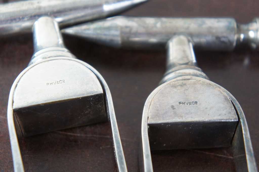 PH Vogel & Co. turn of the century silverplated bullet form ice pick with hammer crusher and chicken claw tongs from Birmingham England, made of elecroplated nickle silver BH9B