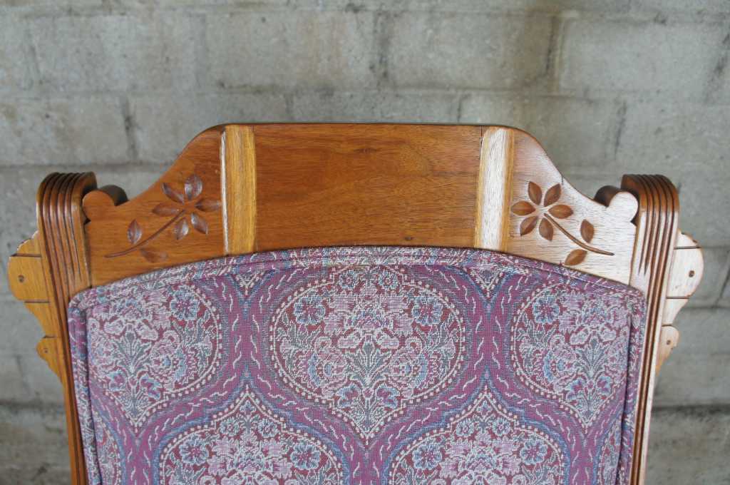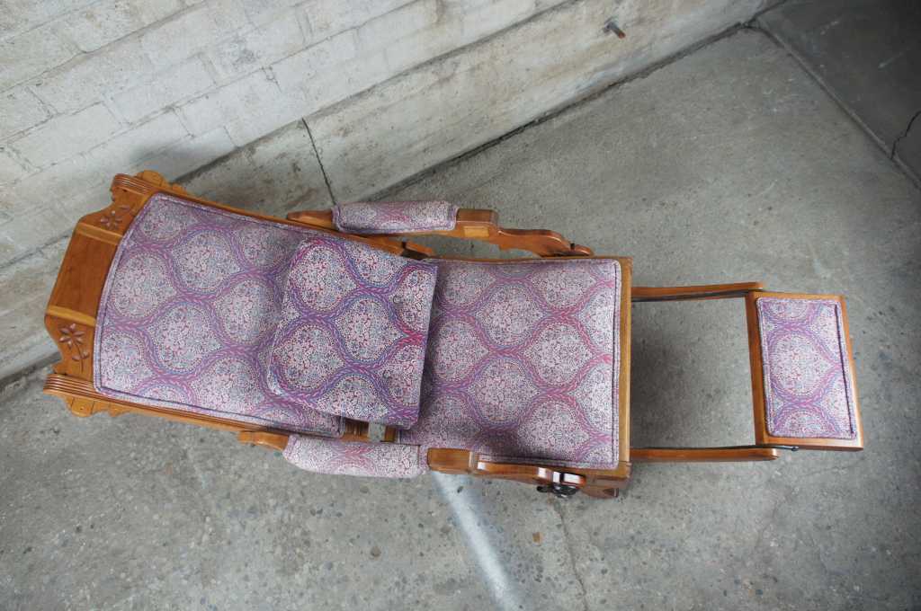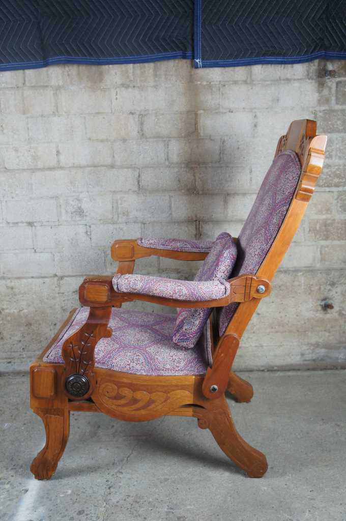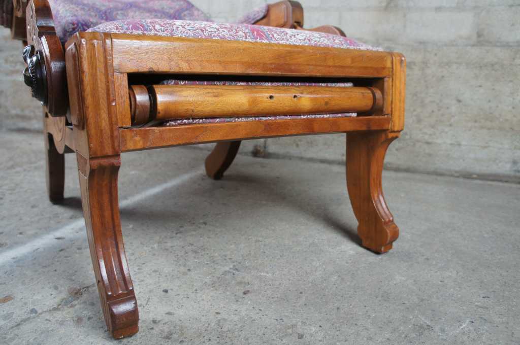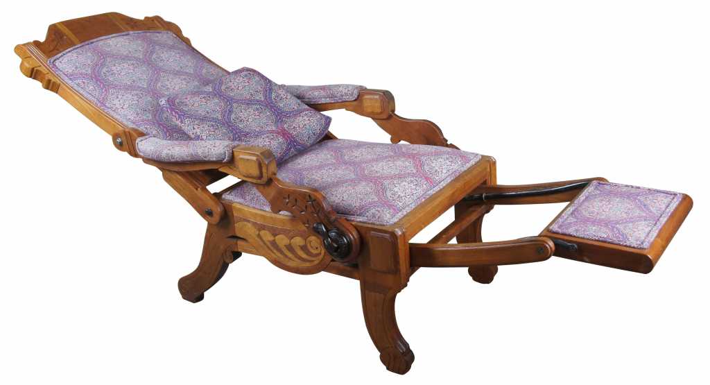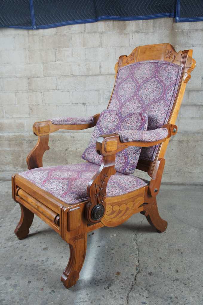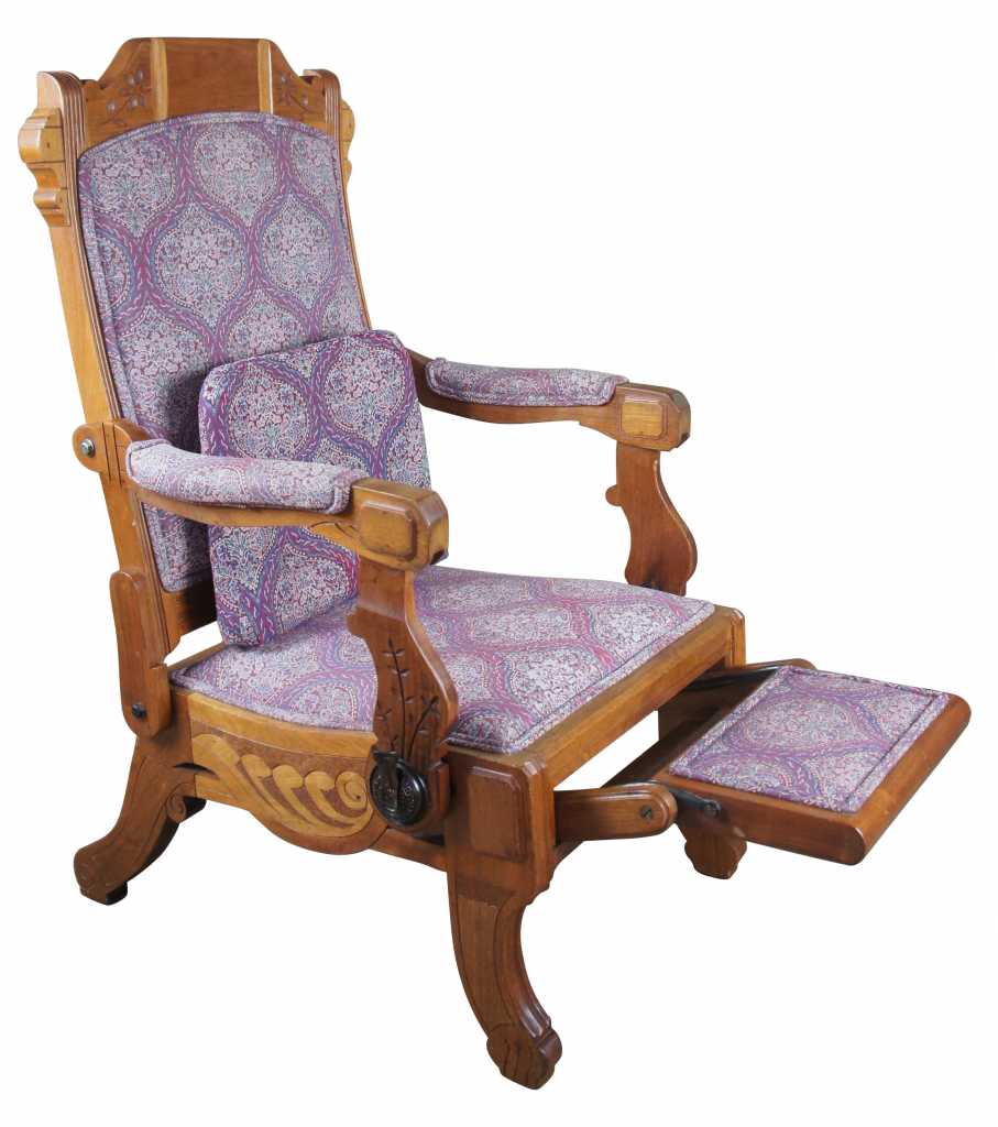 An American late 19th century walnut reclining armchair by the Hartley Reclining Chair Company of Chicago. Features carved and incised floral decorated frame with adjustable reclining back and pull-out foot rest operated by a brass and steel mechanism. Stamped D.B. Hartley Chicago 1883.