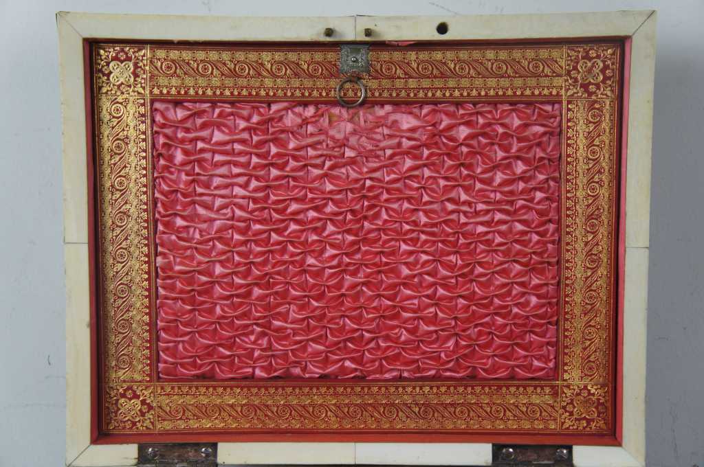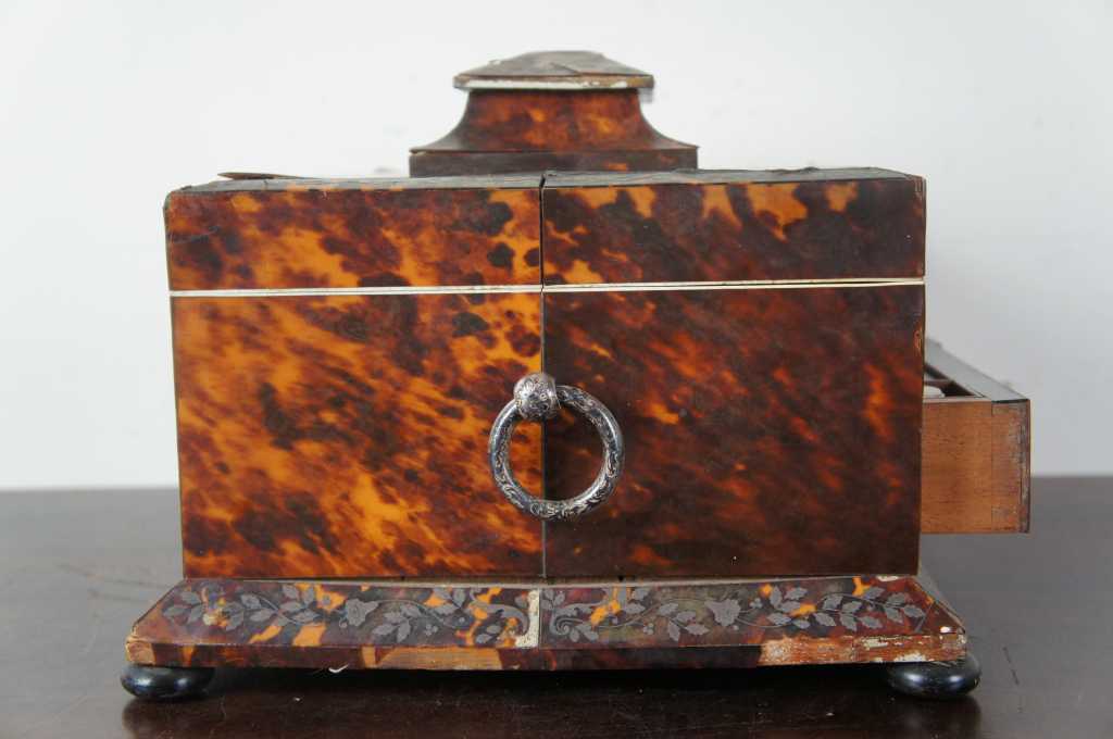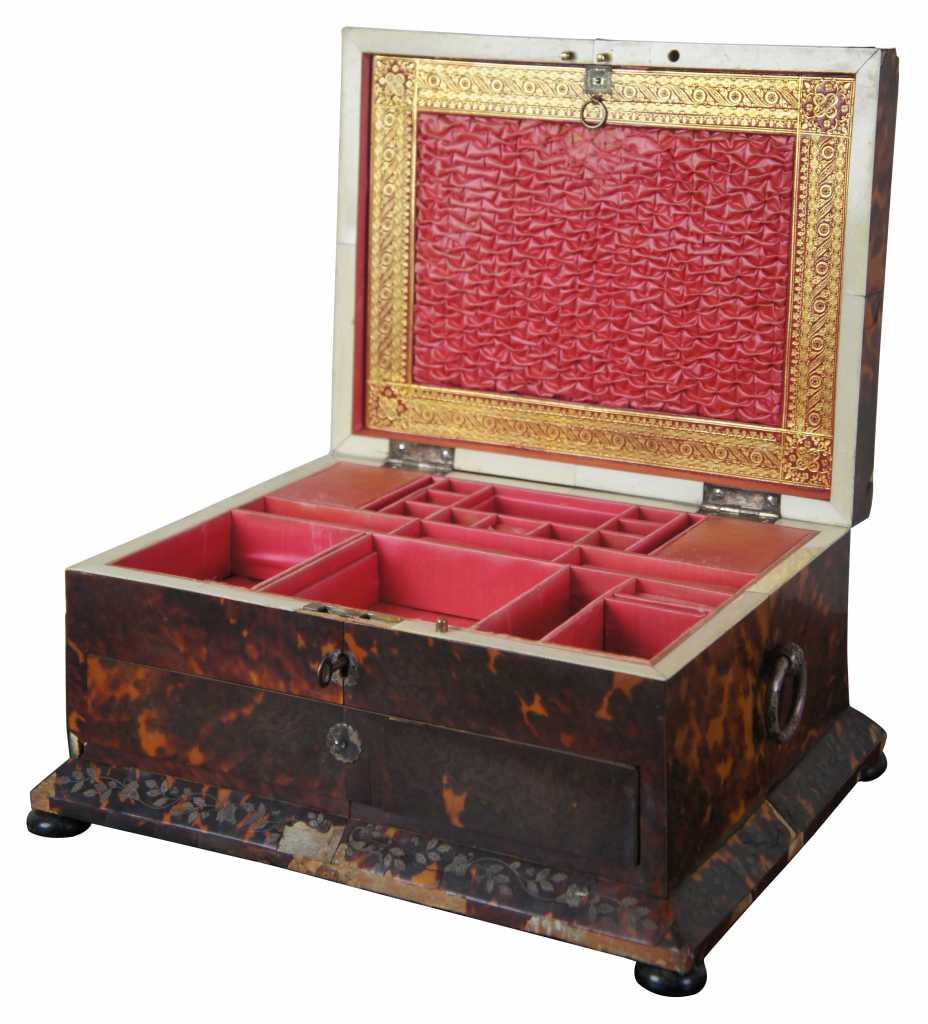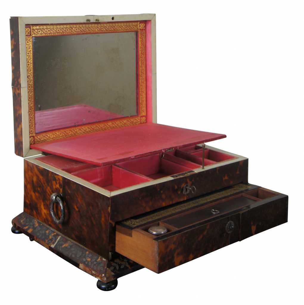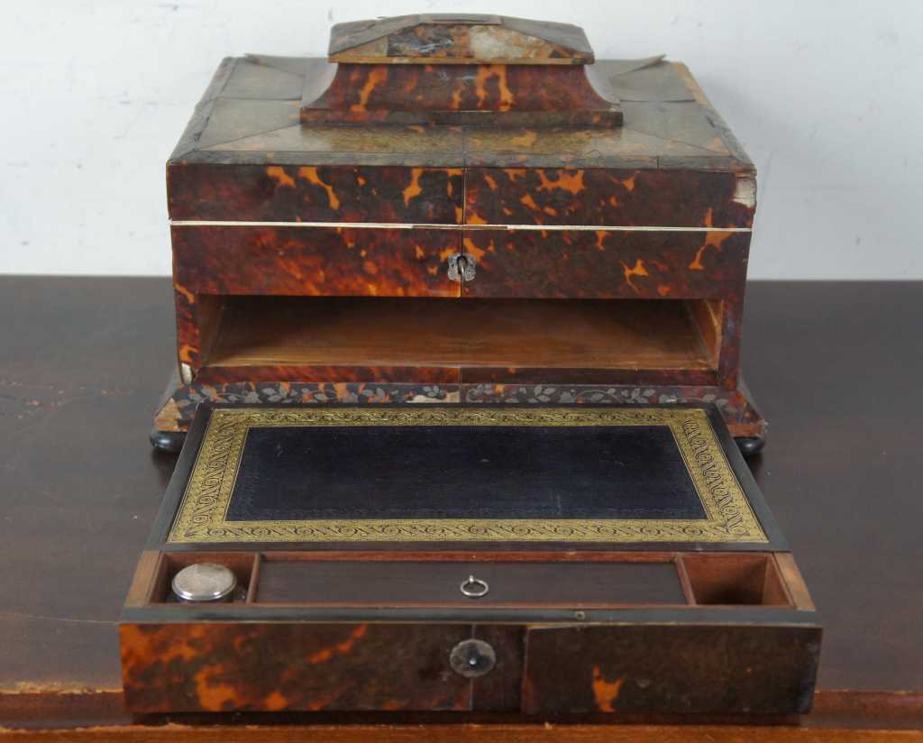 A gorgeous mid 19th century European Jewelry/ sewing box with writing slope. Faux tortoise with silver inlay. Main compartment opens to a pink lined interior with compartments for storage and a gold framed backing that flips down to reveal a vanity mirror. Lower box opens by releasing a brass latch to reveal a leather wiring slope with compartments and glass jar for ink. Box rests upon bun feet.