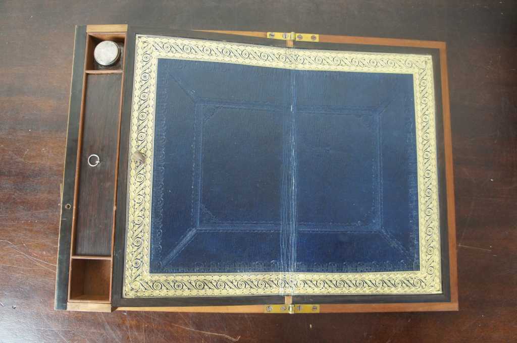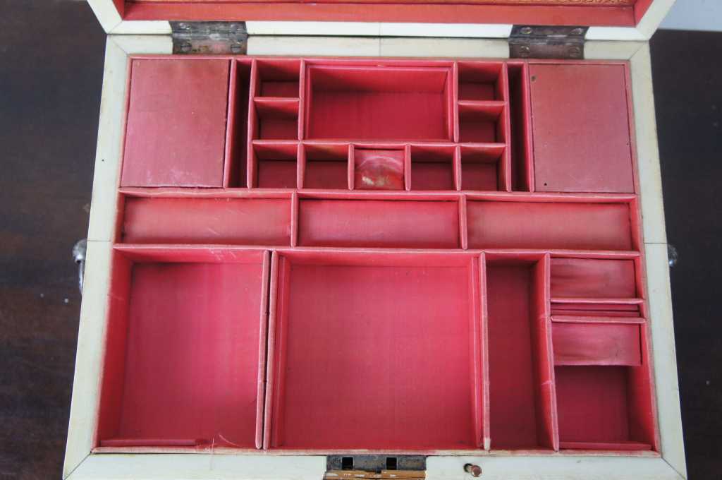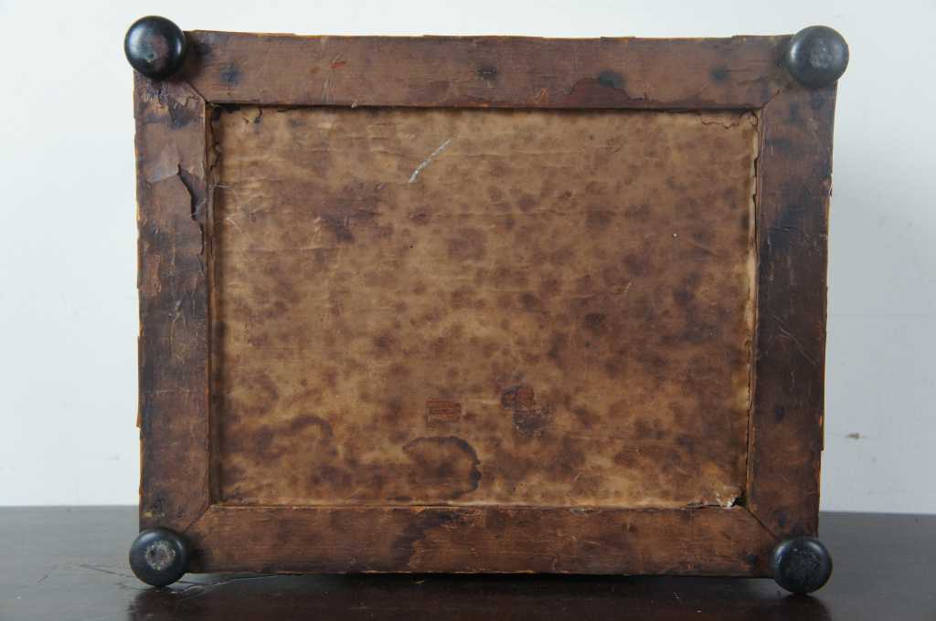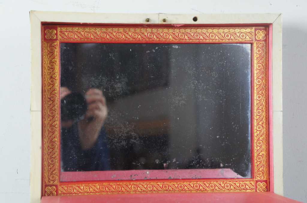 Gently Used – Pieces of veneer missing/chipped; key included but does not lock; catch for drop mirror sticks slightly; lower drawer is opened by pulling out bar in front edge of top compartment; Silver loss to mirror. see pictures
