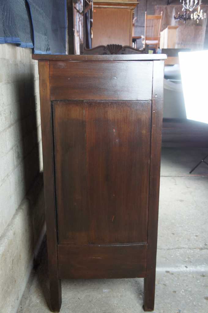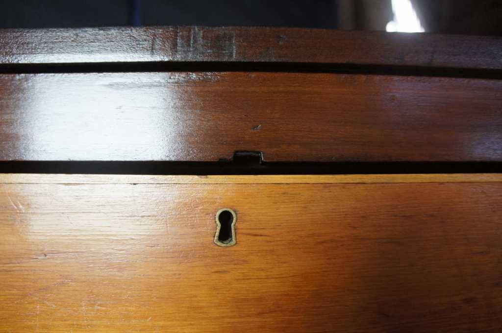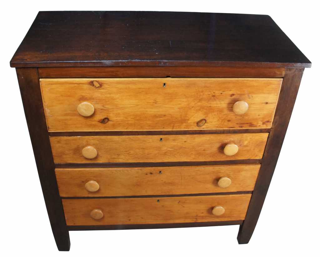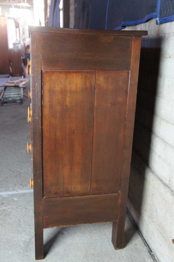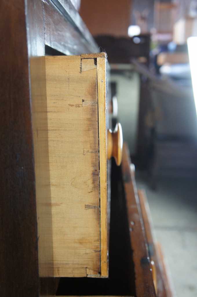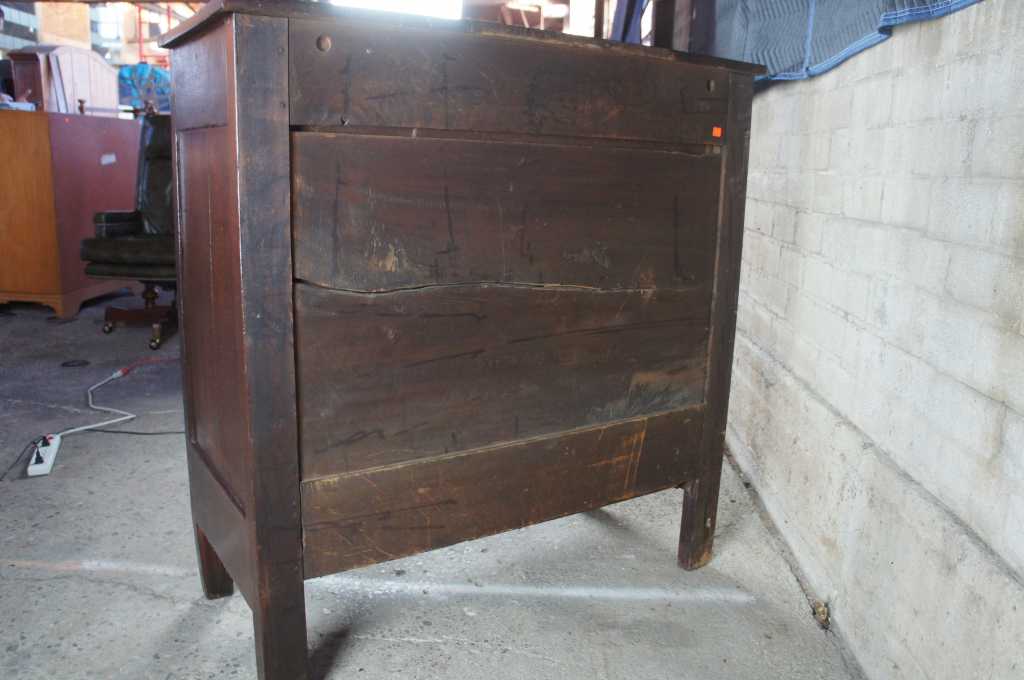 Imperfections are the result of aging; distressing and markings to top, split in back panel, old notch above top drawer from being pryed open