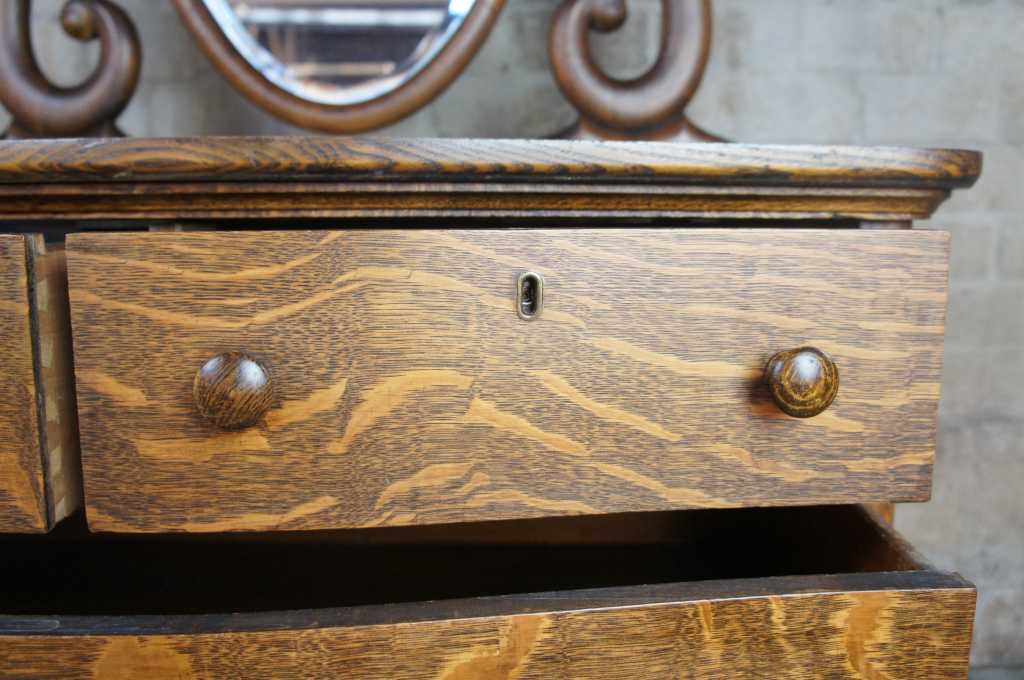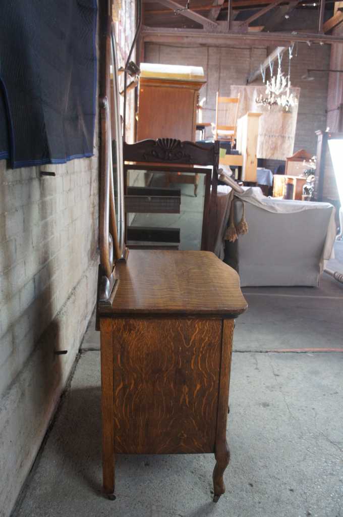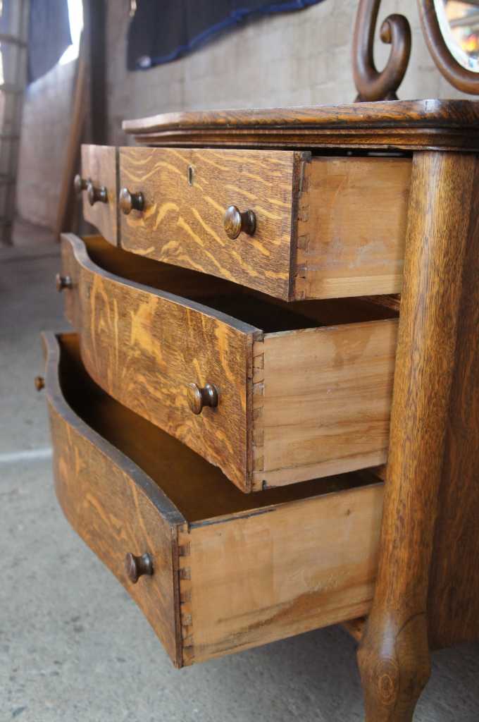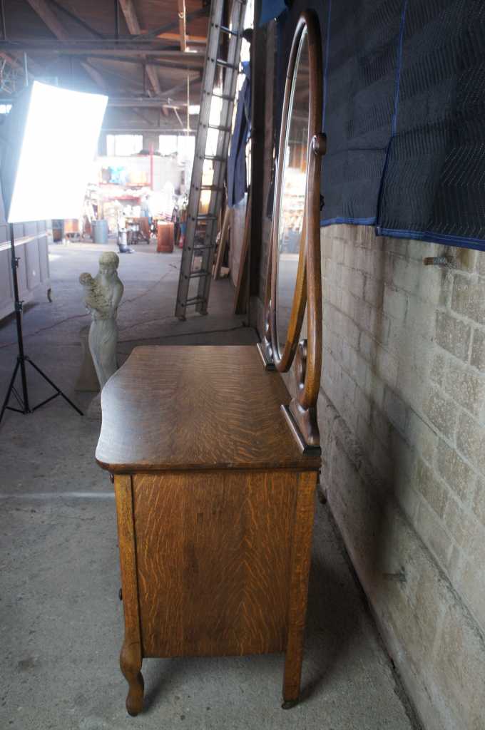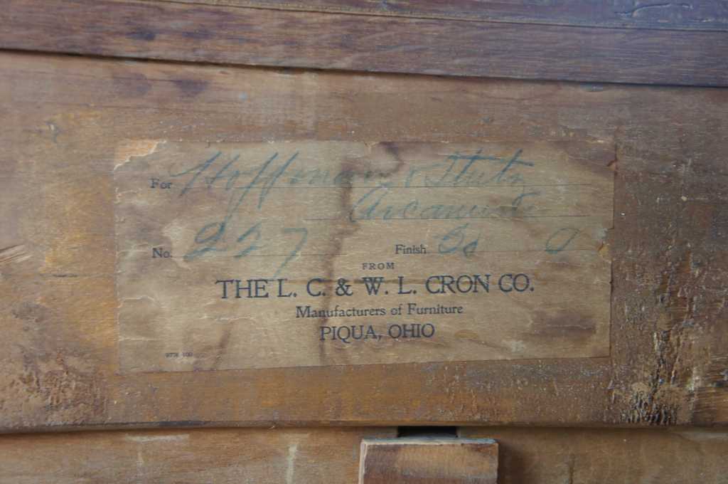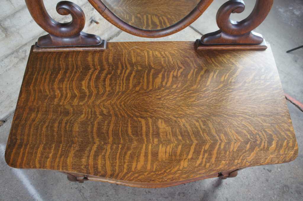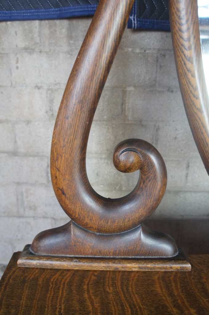 Quartersawn oak dresser and mirror. Circa 1890s, serpentine four drawer front and rear tilting mirror. Mirror is held by scrolled supoprts. Dresser features dovetaled drawers and wheels for easy movement. History and Bio: L. C. & W. L. CRON & CO., dealers and manufacturers of furniture, Piqua. There are probably but few of the successful merchants and manufacturers of the city of Piqua who are equal in energy, enterprise and a clear conception of the wants of the public to the firm of L. C. & W. L. Cron & Co., manufacturers of all kinds of plain and fancy house furniture, and also of all classes of office furniture, desks, cases. etc. this firm has also one of the largest business rooms in the city of Piqua. located at No. 144 Main street, where they have as fine a stock of furniture as any house in this part of the State. L. C. & W. L. Cron & Co. are amply prepared to furnish anything in the undertaking line; they drive a hearse second to none in the city. In 1868, the above business was opened by L. C. Cron. which he managed and carried on until 1869, when he took in his present partners, and the firm's name since has been unchanged this firm have, for the past eleven years, run their factory to almost its full capacity, and now feel the need of a more commodious. convenient and substantial structure, which is now being erected; it will. no doubt, be one of the best of its kind in the State; its completion is anticipated during 1880; this factory, though not located in the corporation limits of the city of Piqua, possesses all the advantages of those in the corporation, such as hydraulic conveniences, gas, etc. The gentlemen of this firm are of the most substantial and reliable men in the place. L. C. Cron, the senior member of the above firm, was born in Piqua Sept. 16, 1836, and was a pupil of the city schools, where he received a good business education; early in life he commenced working under instructions at his present trade, which he has since put to good use, and is now the master wheel of the furniture department of Piqua. In 1861, he entered the United States Army, where he spent three years; while in the service he participated in the battles of Cedar Creek, Ft. Petersburg, and many others of less renown, passing through various hardships as a soldier. Since his return to Piqua, he has filled the most important offices of the corporation in which he lives, and is at present Justice of the Peace. The marriage of L. C. Cron and Margaret Ginn was celebrated Sept. 29, 1859; their children were five in number, viz., George L., born Aug. 27, 1864; died Feb. 15, 1867: Maggie E., born March 12, 1866; Charles L., born Sept. 26, 1867; Jackson C., born June 18, 1869; Albert M., born Dec. 27, 1871; died July 25, 1878. Mrs. L. C. Cron was born in Miami Co., Ohio, Sept. 7, 1838, and died Dec. 27, 1873. L. C. Cron married, for his second wife, Marcella Edmonds of Dayton, Ohio; their marriage was celebrated. Aug. 11, 1874; she was born Dec. 4, 1847; they, by this union, had two children, viz., Hattie B., born July 27, 1875, and Minnie A., born Sept. 19, 1878; died July 1, 1879.