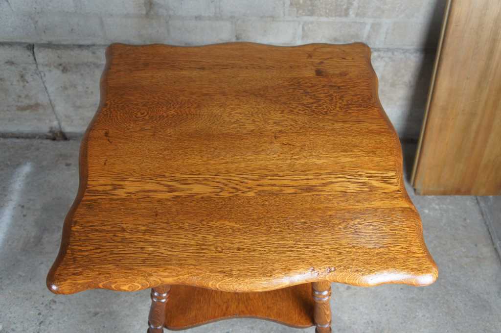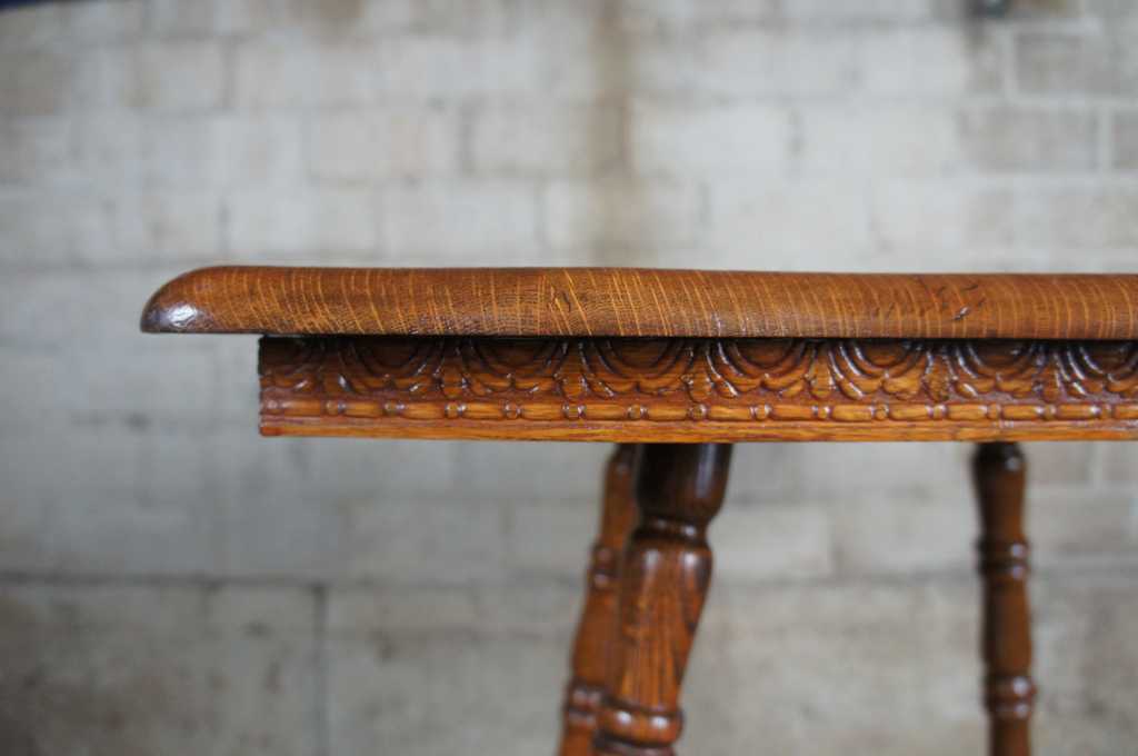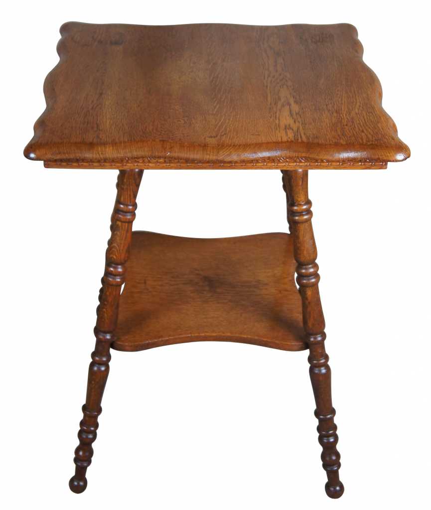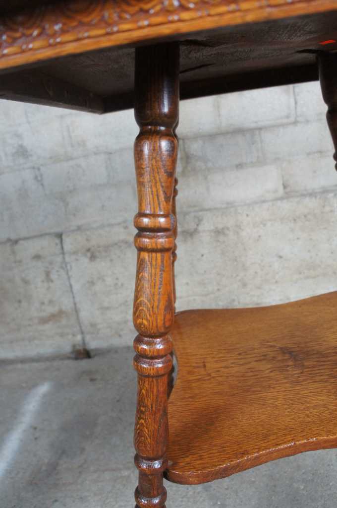 A lovely Victorian oak parlor table, features a serpentine top, engraved floral apron and sausage spool turned legs.