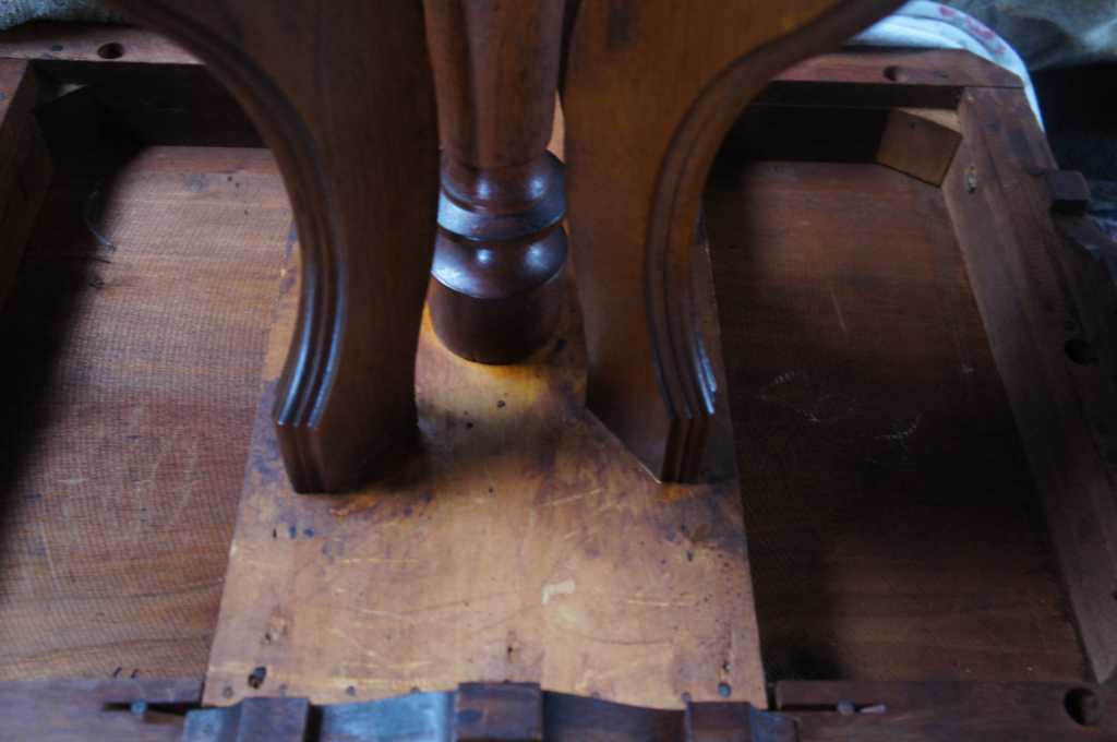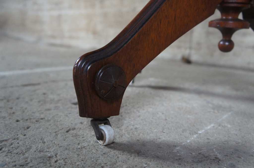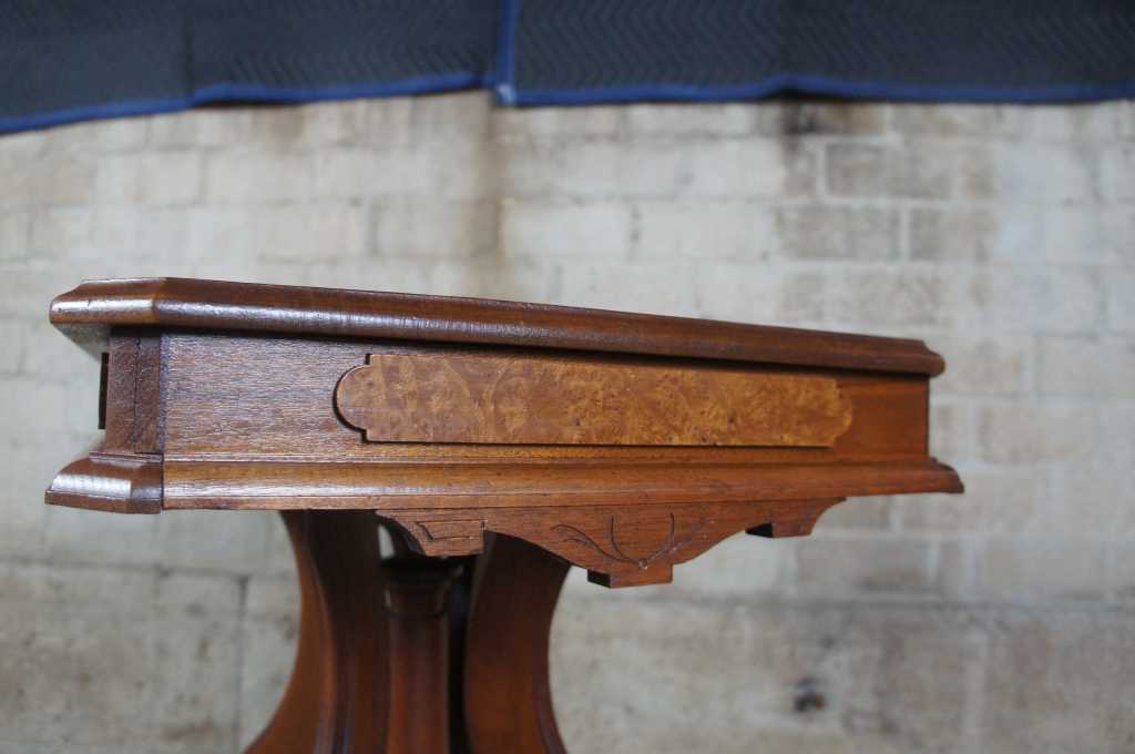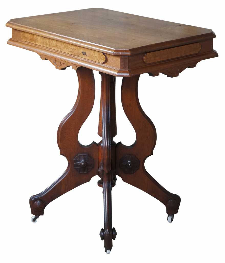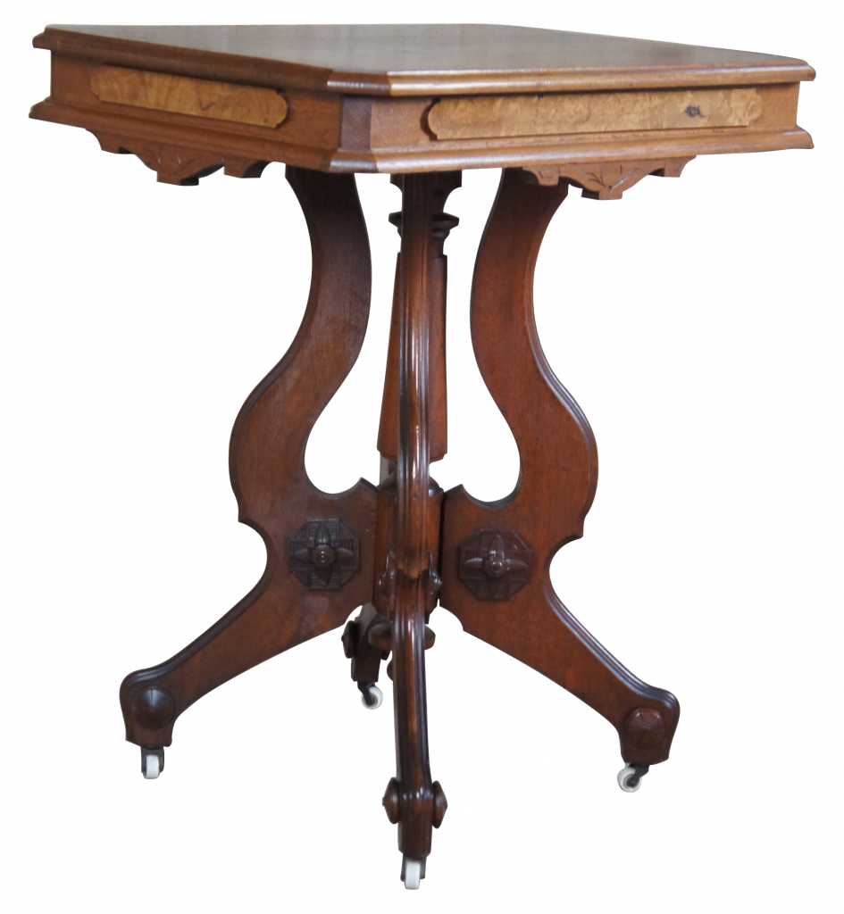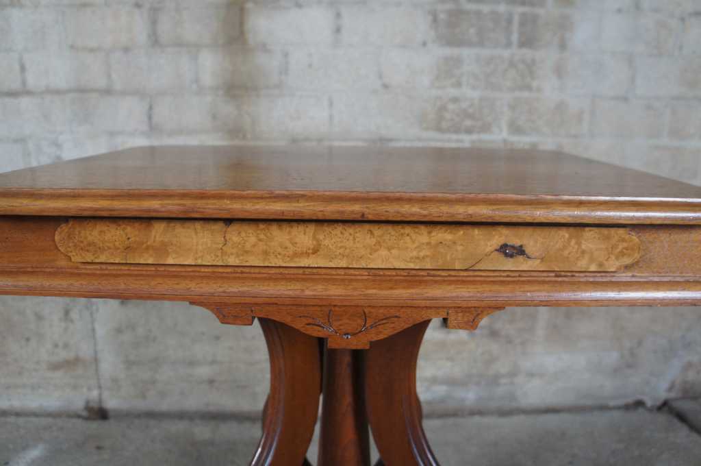 Victorian parlor table from the 19th century. Features carved aprons, burl wood panels, serpentine pedestal base and drop finials, medallions and porcelain castors.