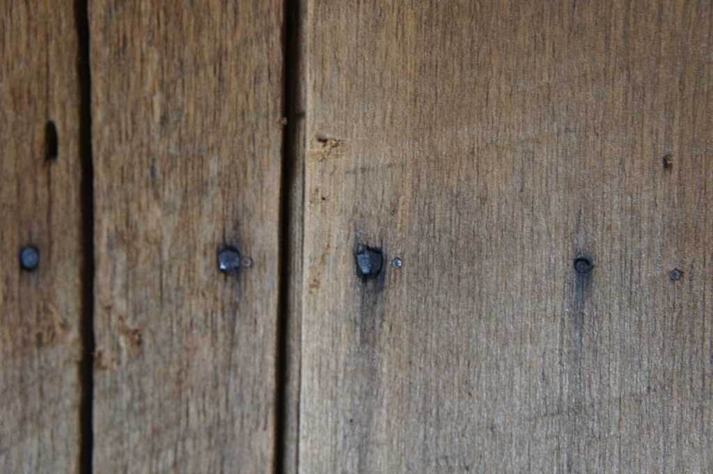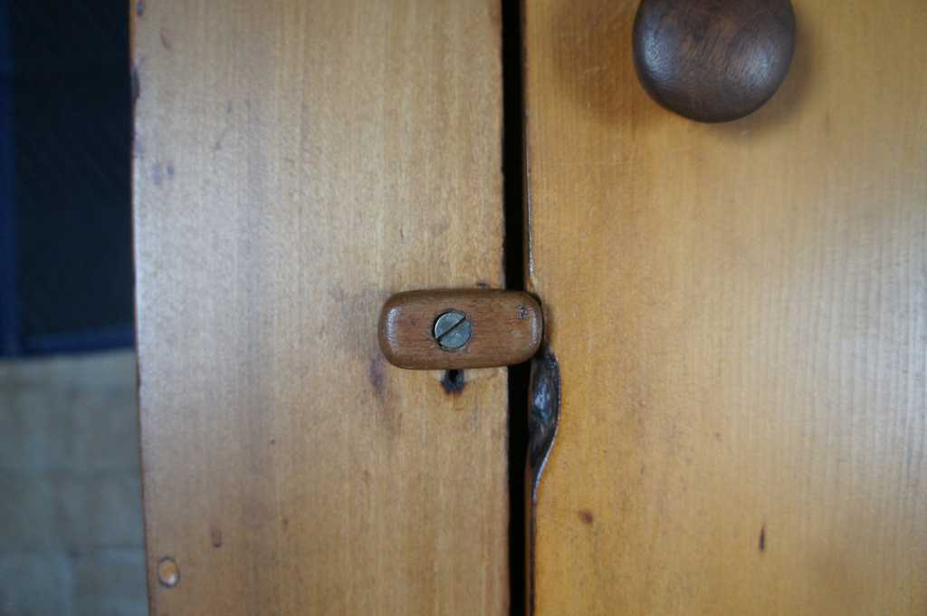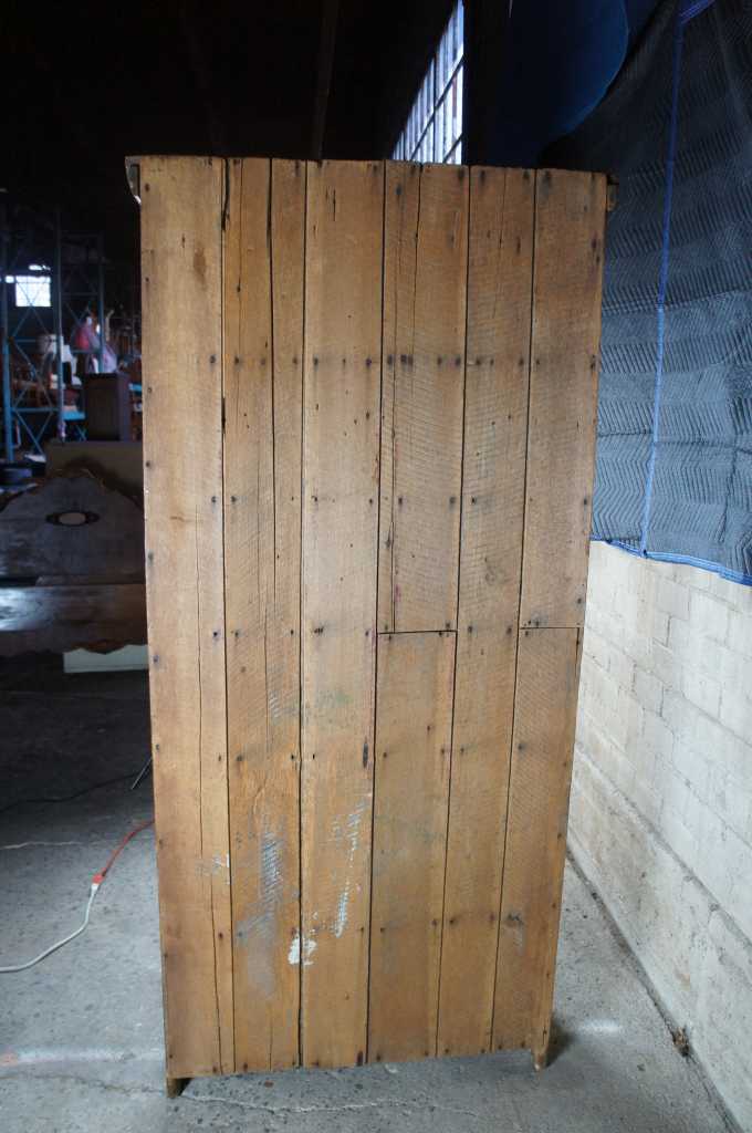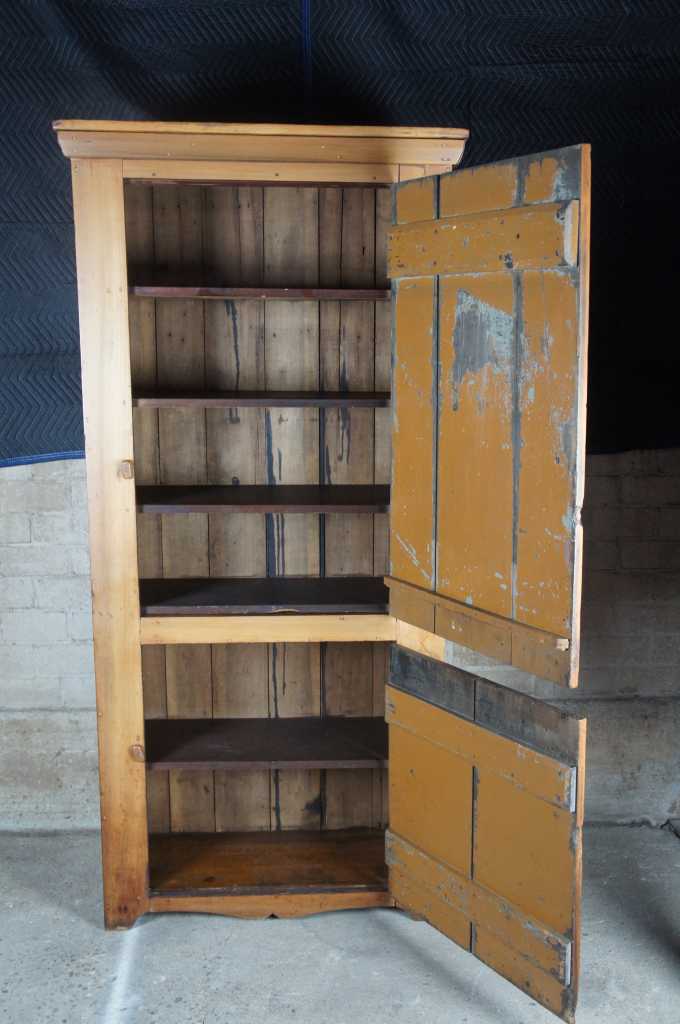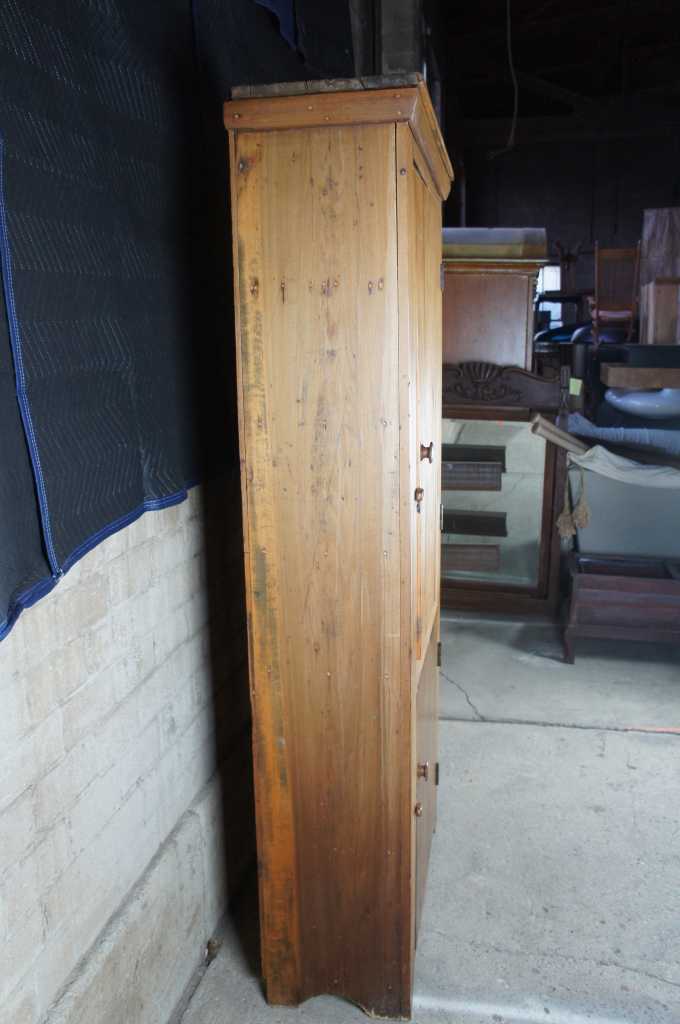 Solid pine 19th Century cupboard; includes two separate cabinets with plenty of space for storage; latches hold each door closed; hand cut nails on back; lower apron is serpentine.