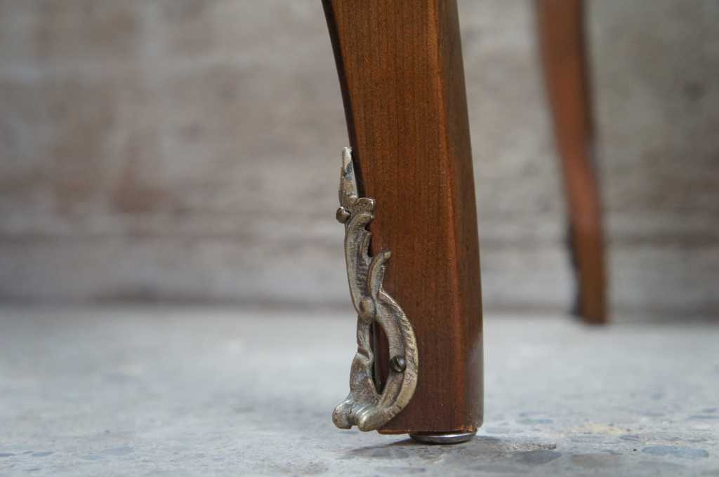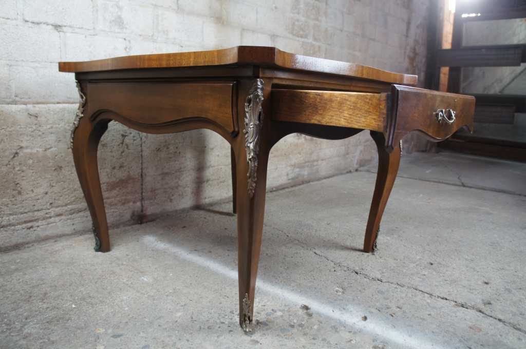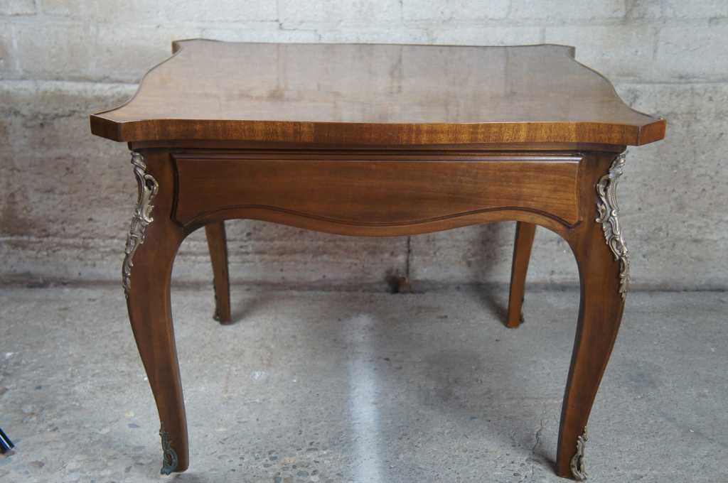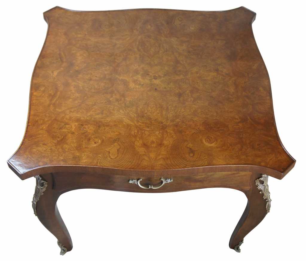 Karges Louis XV American Walnut Side Table; features a shaped top with banded edge and burled veneer, legs are cabriolet with French inspired mounts, includes a single dovetaled drawer.