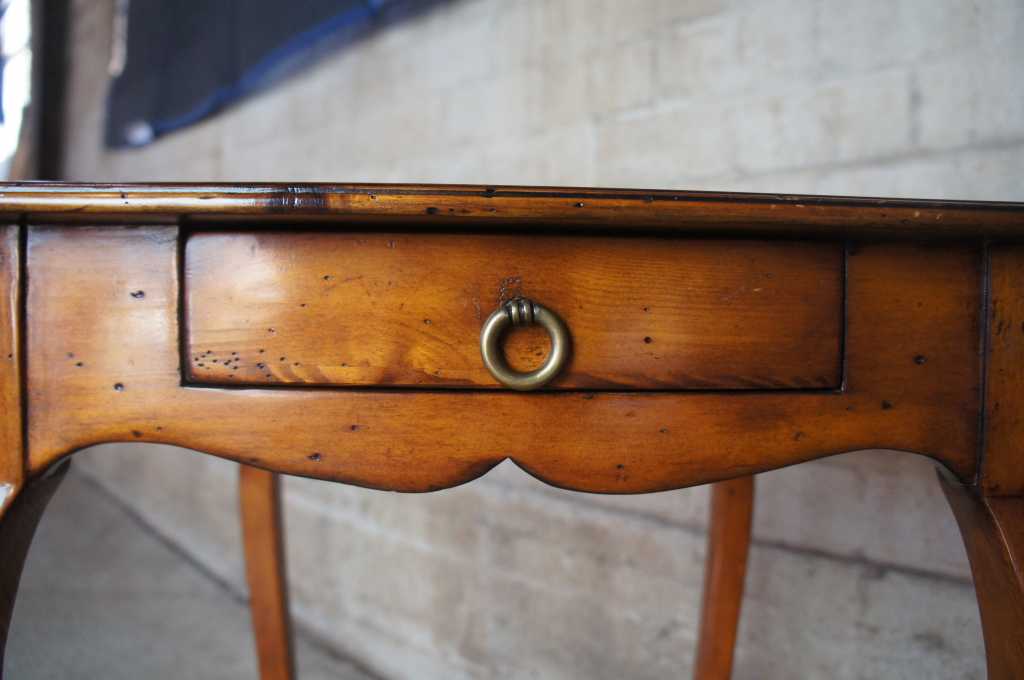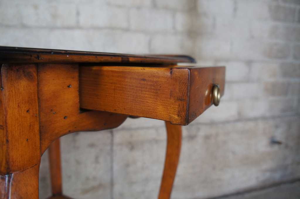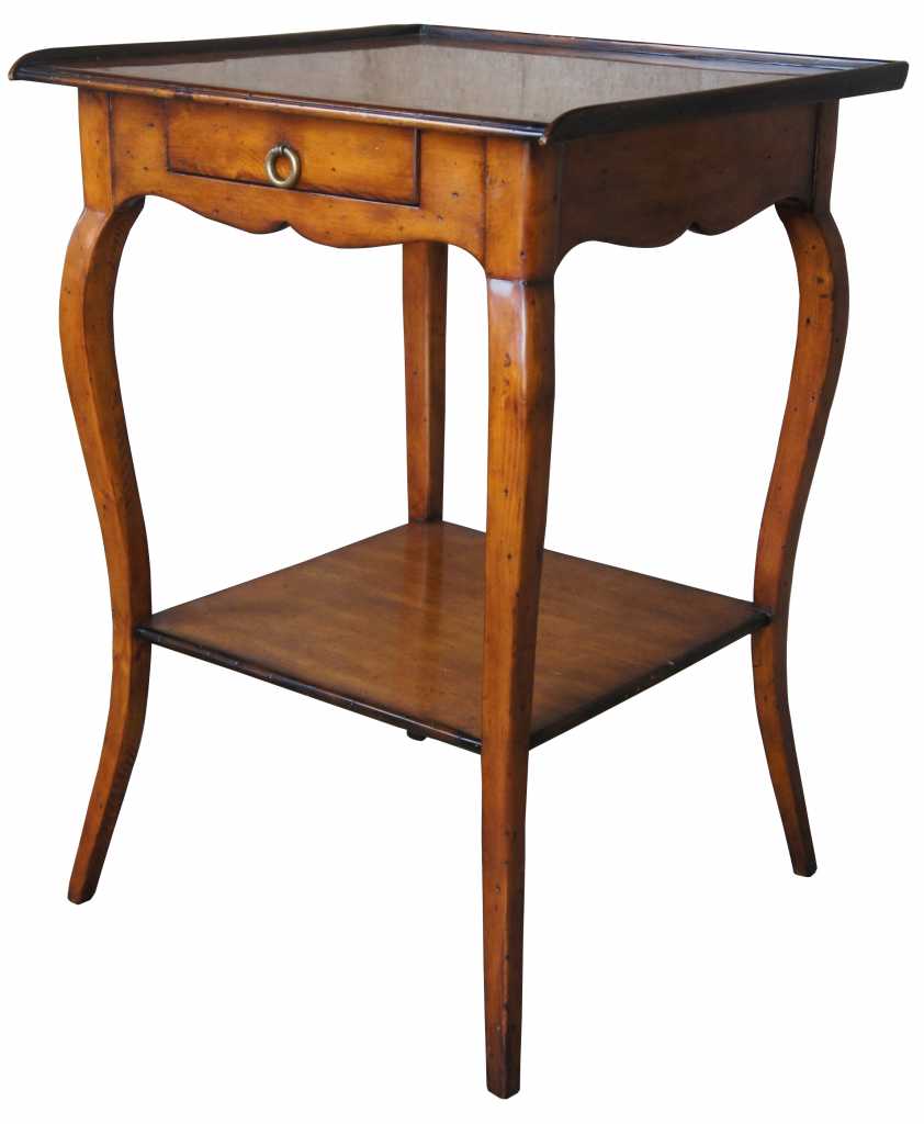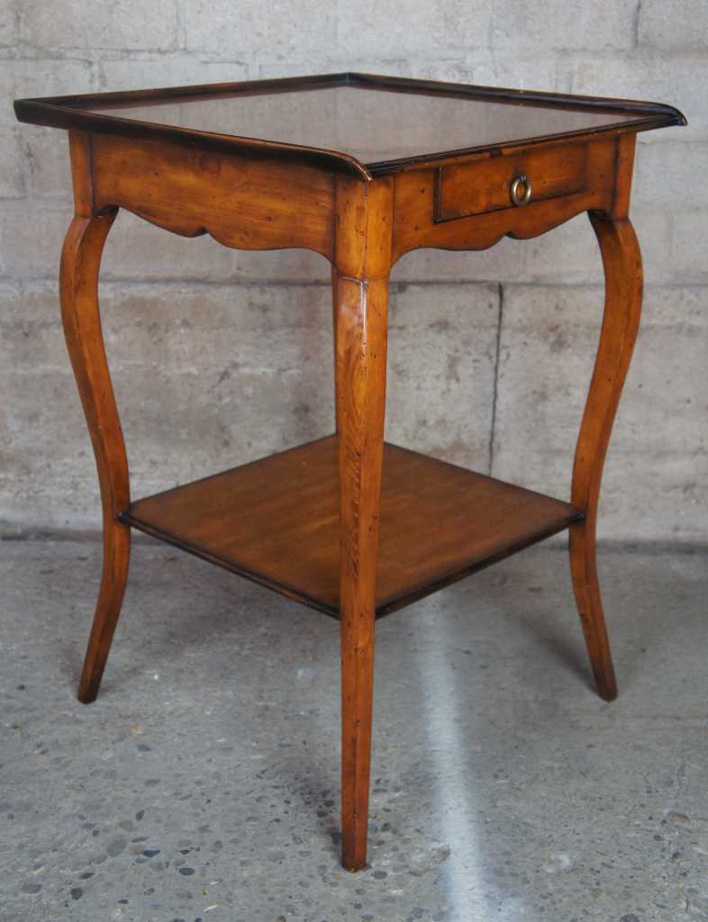 Chateau du Vallois by Theodore Alexander side table. Perfect for use as a nightstand or accent piece. Features distressed walnut with dovetailed drawer and brass hardware. Drawing inspiration from 18th century French deisgns. Features scrolled apron, cabriole legs and inset top.