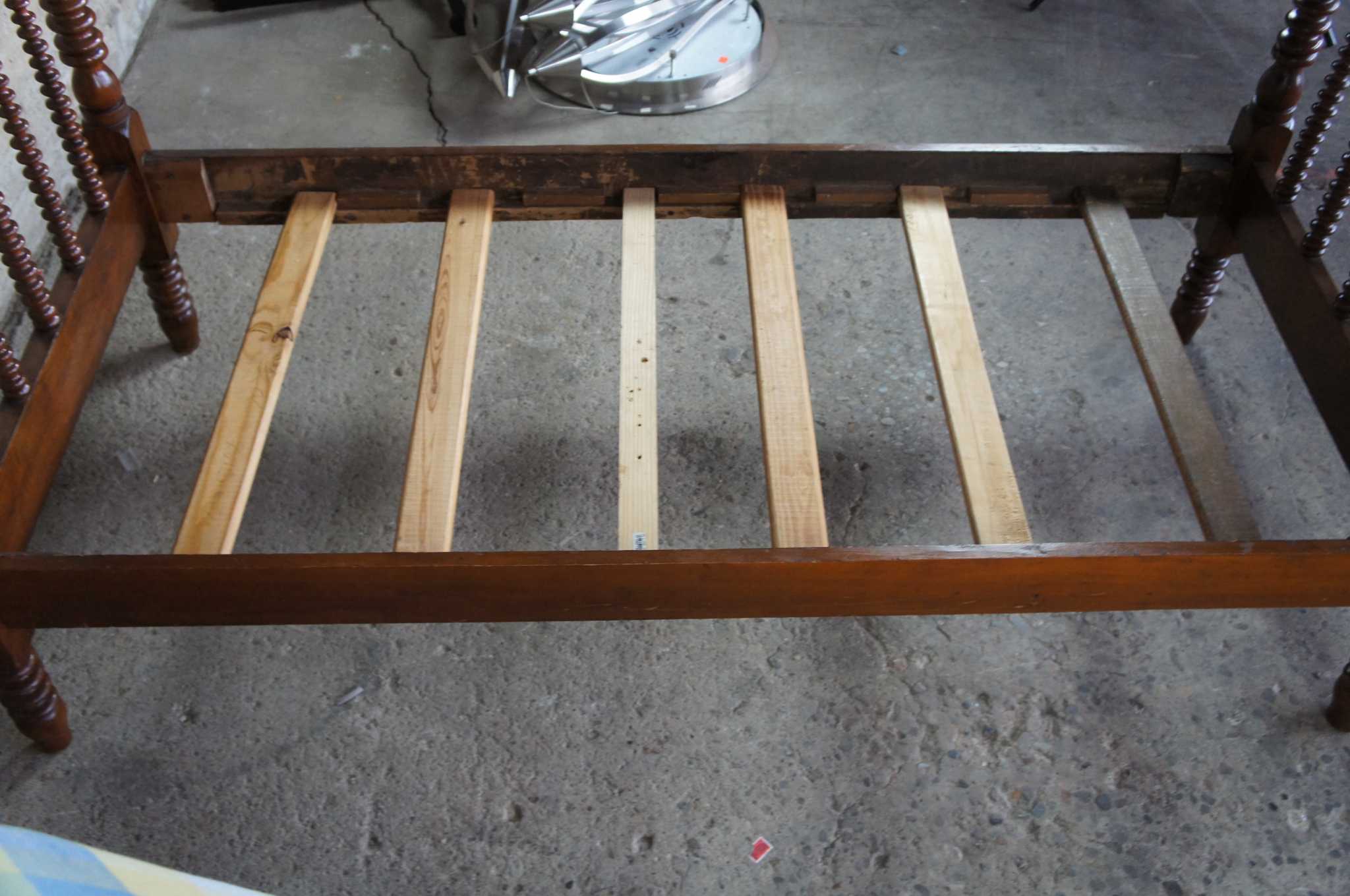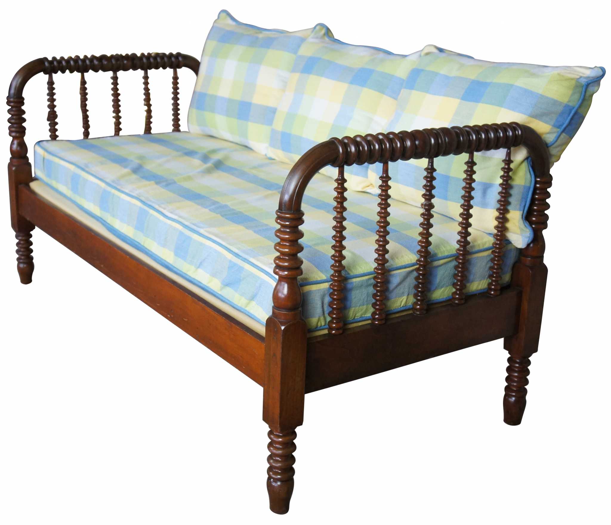 Antique 19th century Jenny Lind repuposed youth bed. Made from pine with spindled accents. Made to be tucked against a wall and used as a bench , day bed or love seat. But also able to be used as a childrens bed.