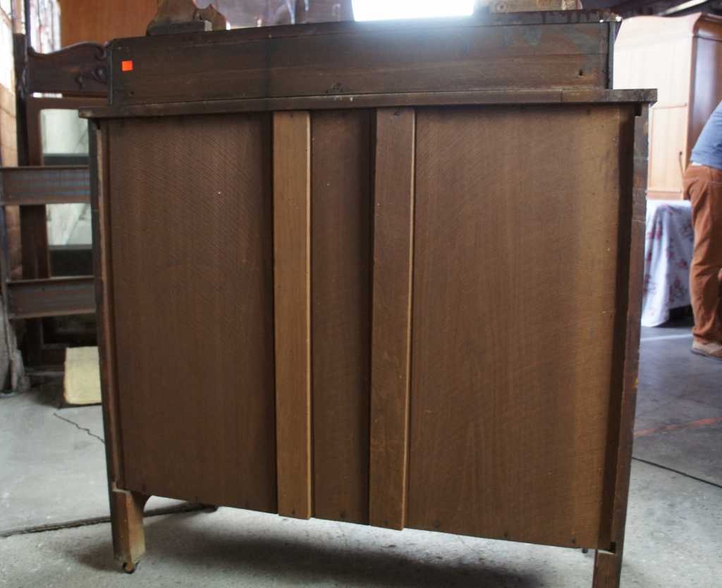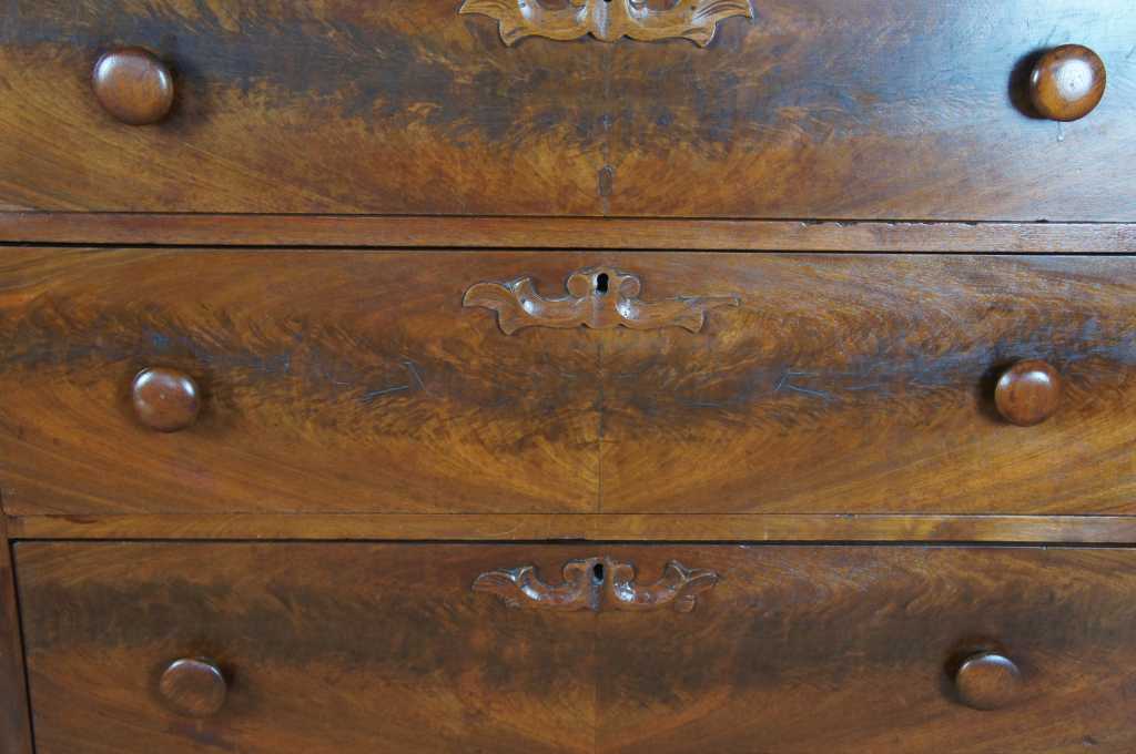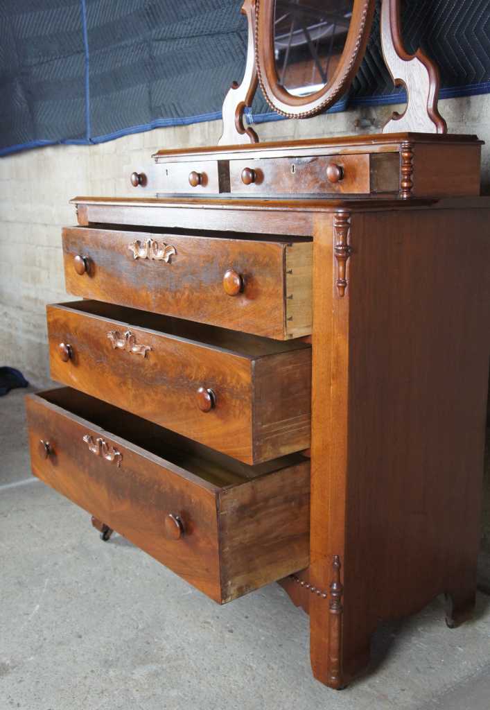 Antique Victorian 19th Century walnut dresser with matchbook veneered burlwood drawers, features three fulls sized drawers and two upper glove box drawers. Along the top is an oval mirror with gadrooning around the edge. Drawers feature hand turned drawer pulls and ornately carved keyholes.