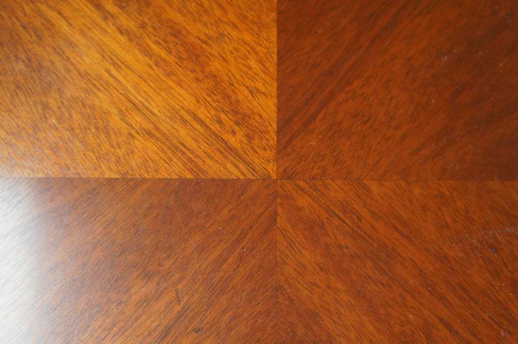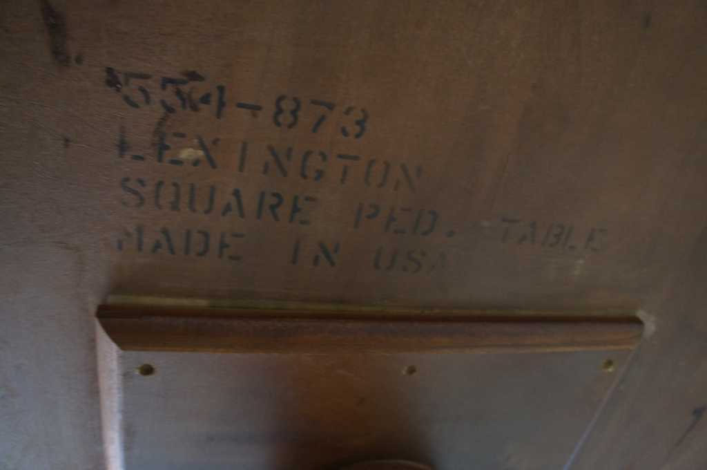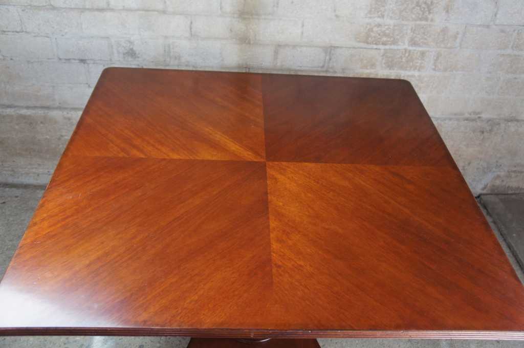 Traditional style pedestal table by lexington furniture. 554-873. Great dining or breakfast table, features a square top with matchbook veneer and rounded edges and fluted edges. Table supported by a grooved column mounted to footed legs with brass castors coming from the pedestal.