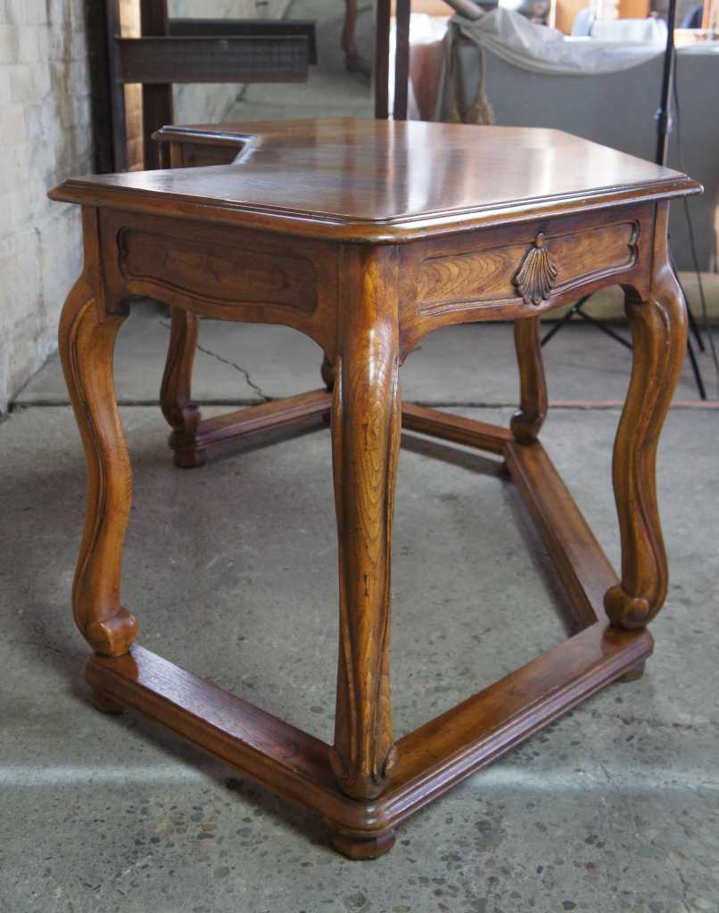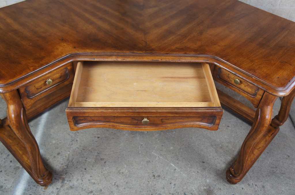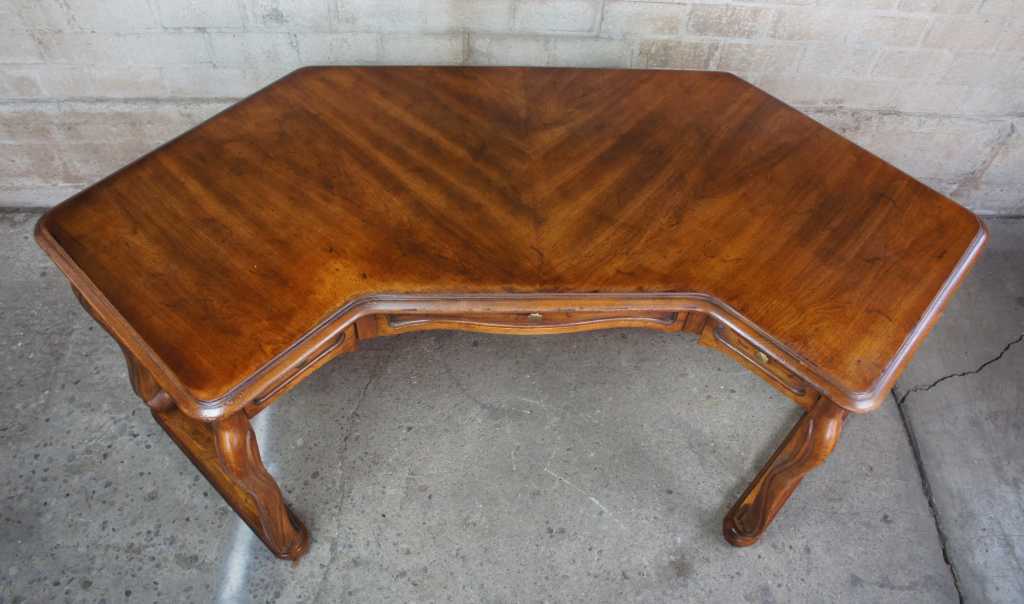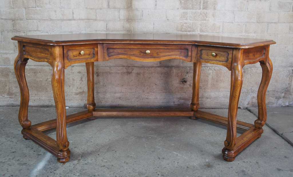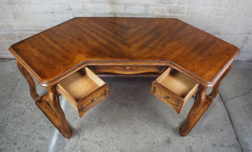 A curved walnut desk by Drexel Heritage, part of the Brittiany line. This desk features three sides with pressed shell cartouches to the apron and sits on cabriole legs with stretchers between, terminating in scrolls and bun feet under stretchers. Dovetailed drawers with floral pulls are present to the back side of the desk. It is marked to the interior of the drawer.