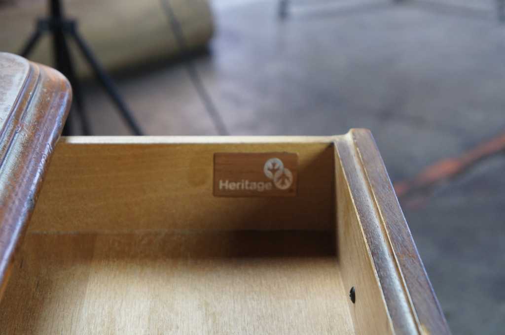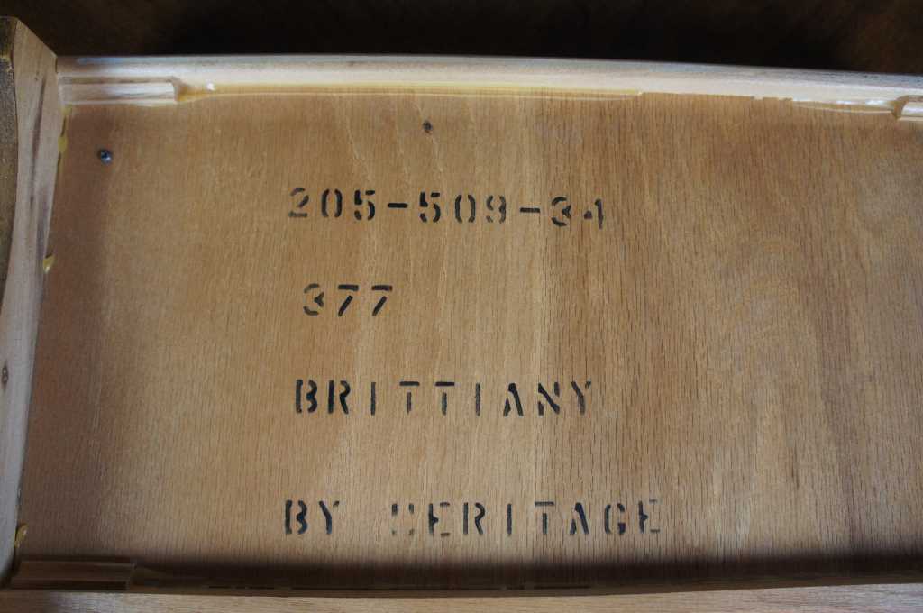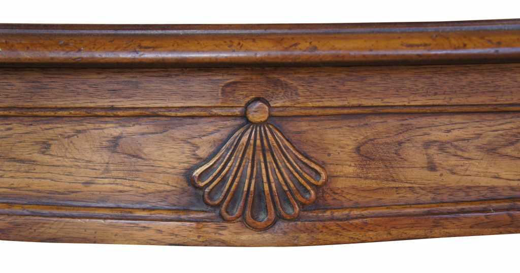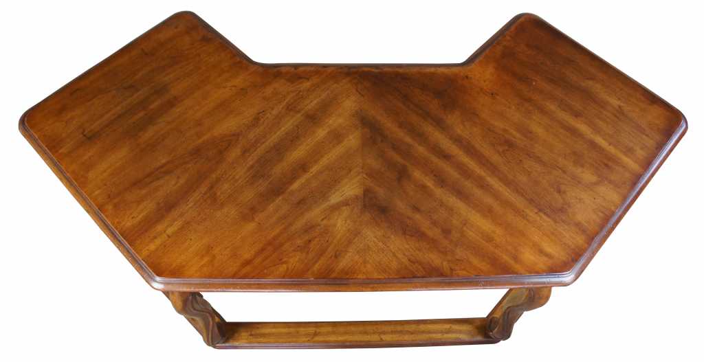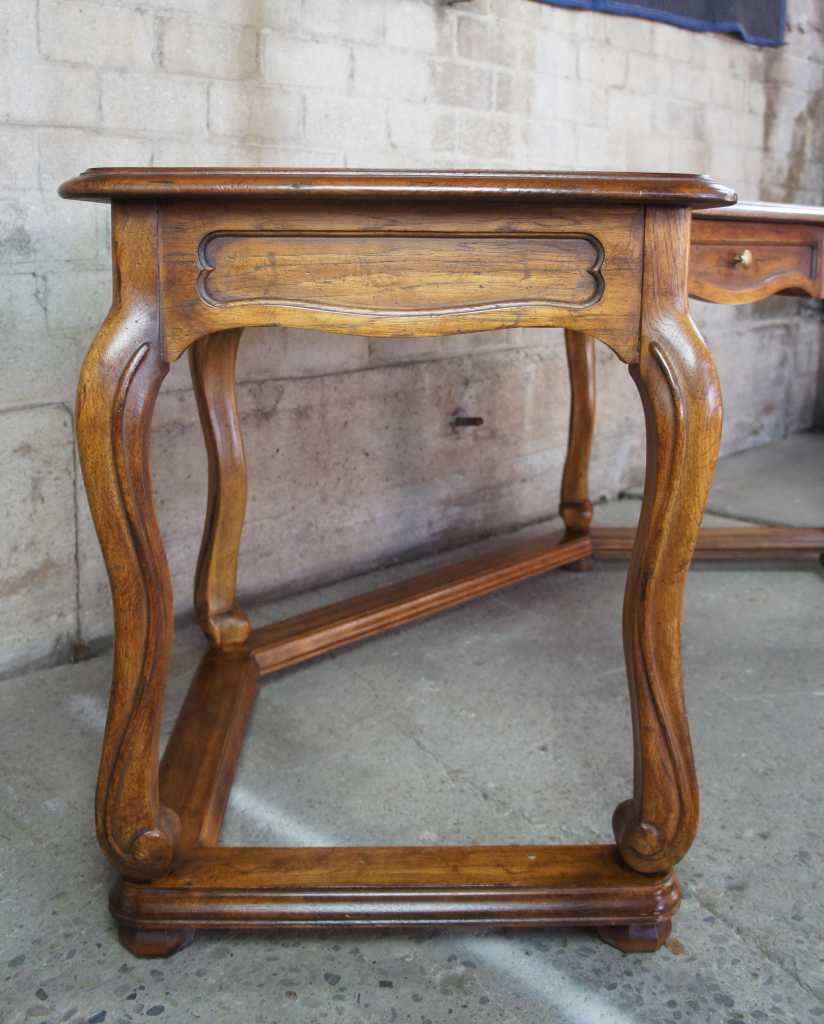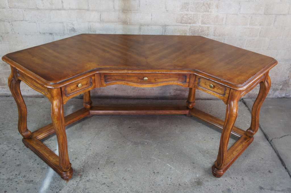 A curved walnut desk by Drexel Heritage, part of the Brittiany line. This desk features three sides with pressed shell cartouches to the apron and sits on cabriole legs with stretchers between, terminating in scrolls and bun feet under stretchers. Dovetailed drawers with floral pulls are present to the back side of the desk. It is marked to the interior of the drawer.