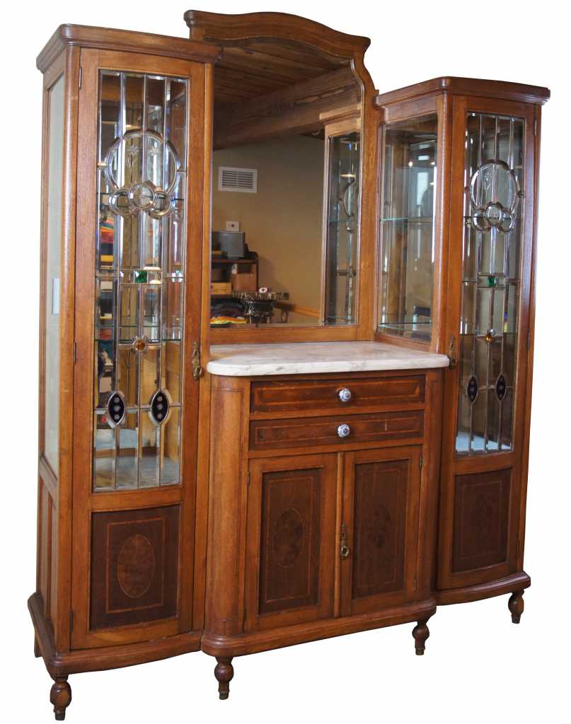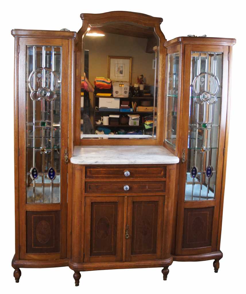 Mid 19th Century oak bar back or buffet with mirror and double stained glass curio cabinets. Features a marble top, two drawers and lower cabinet for accessory storage. Illuminated with beveled, etched and stained glass accents. Opens to three shelves and lower cabinet storage. Door penels feature walnut and burl inlays. Delft porcelain drawer pull accents.