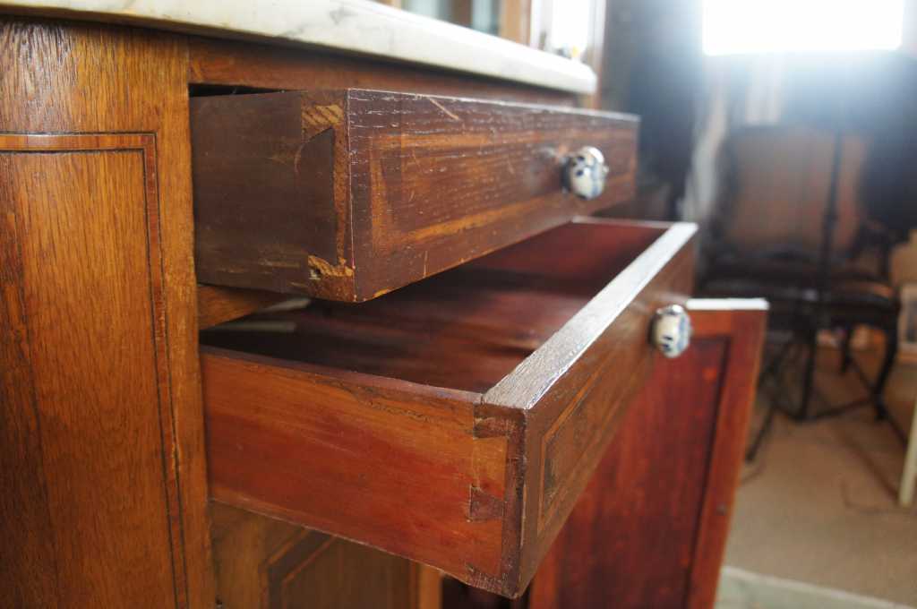 Good antique condition, distressing from use, marking from age, upper drawer does not have inlay along front, outer legs missing front edge of turning, some scratching to marble surface.
