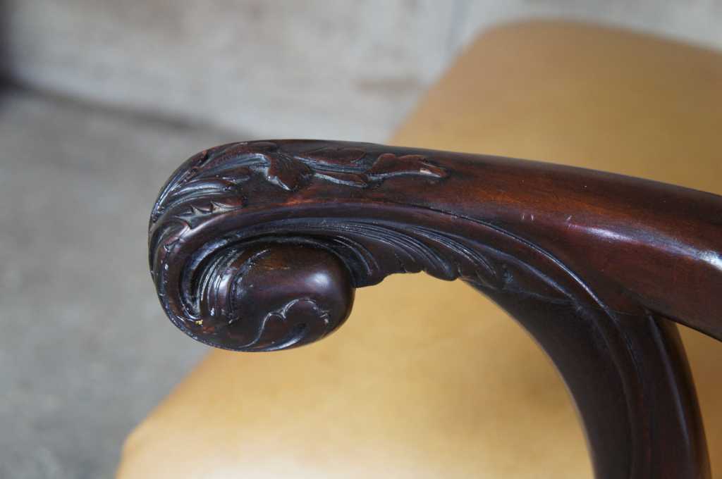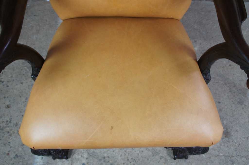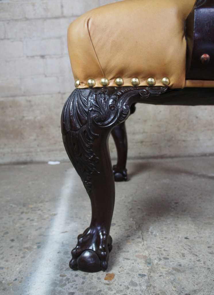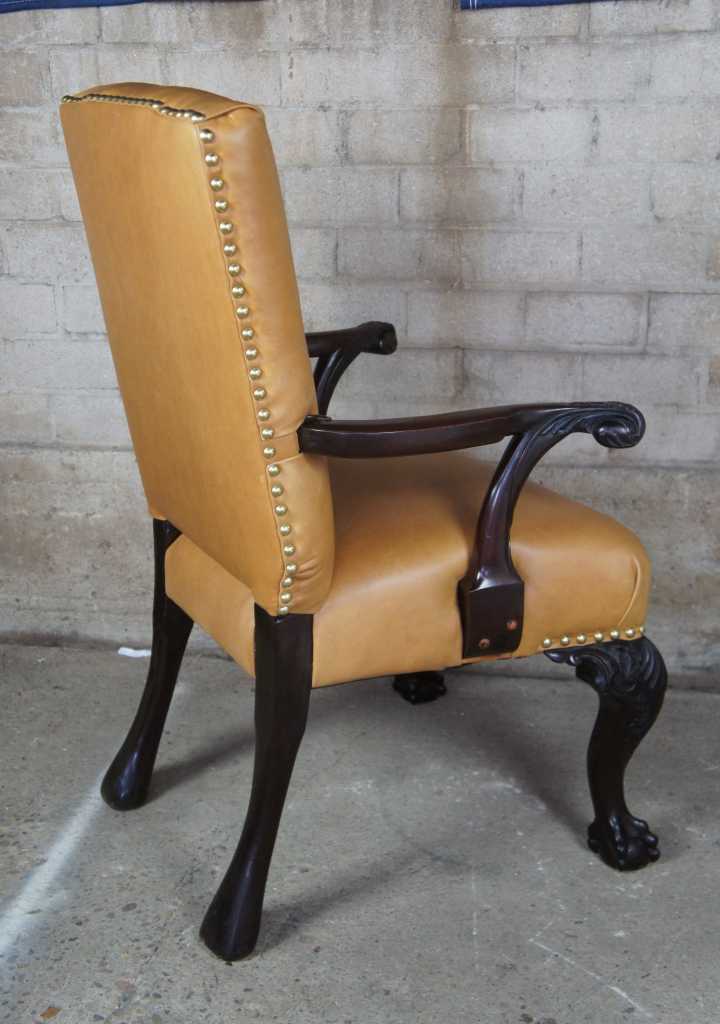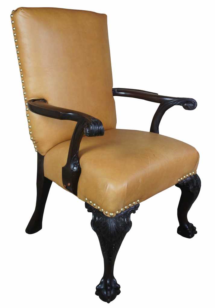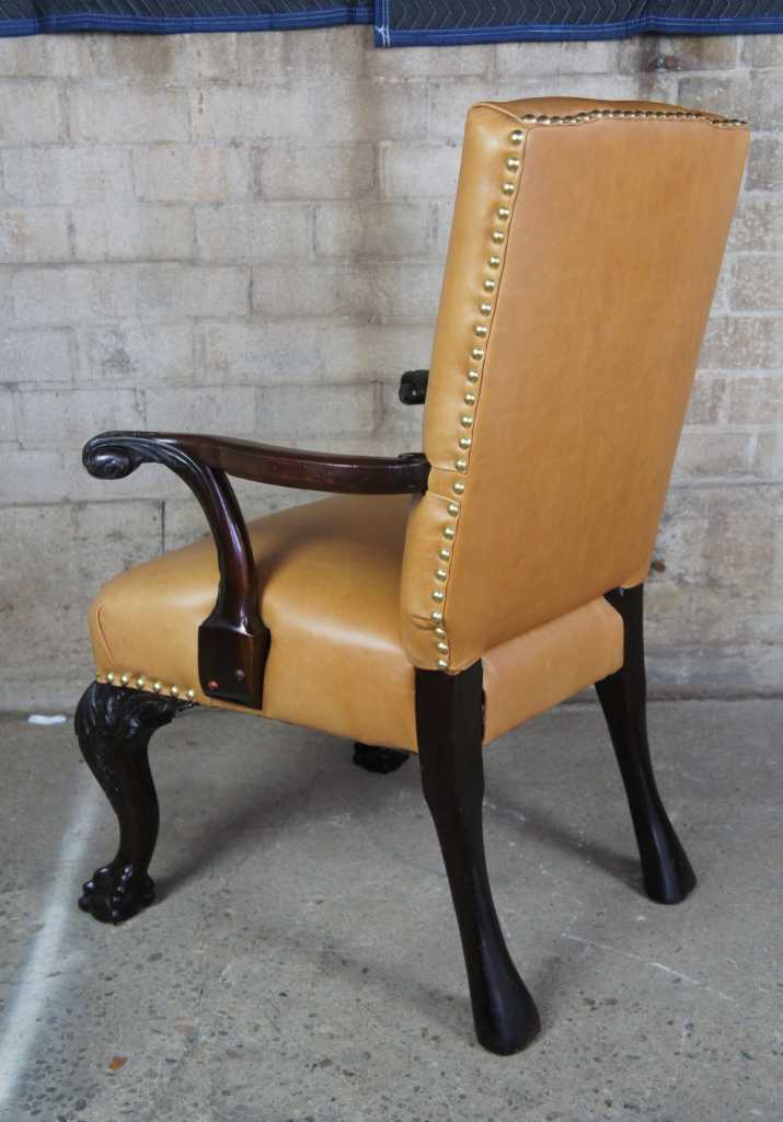 A beautiful heavy english chippendale style arm chair. Made from mahogany with tan leather and nailhead trim. Heavily carved with cabriole legs and ball and claw feet. Great for use as an accent piece, desk chair or dining seat. Camel color leather, thick and firm.