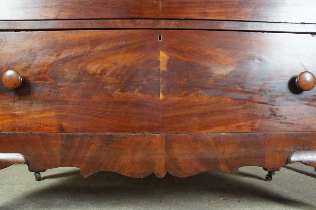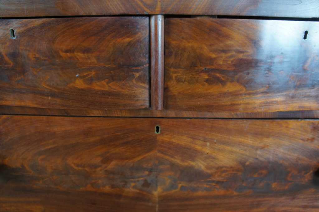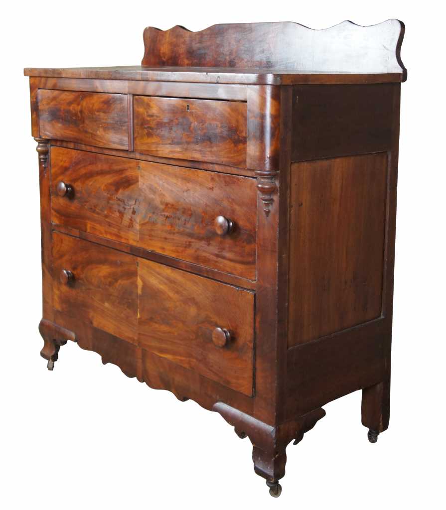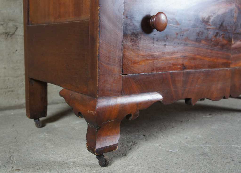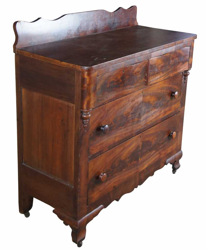 American Empire Chest, circa 1850s. Made from mahogany with crotched front drawers. Features serpentine backsplash, upper front drawers and lower apron; on castors for ease of movement.