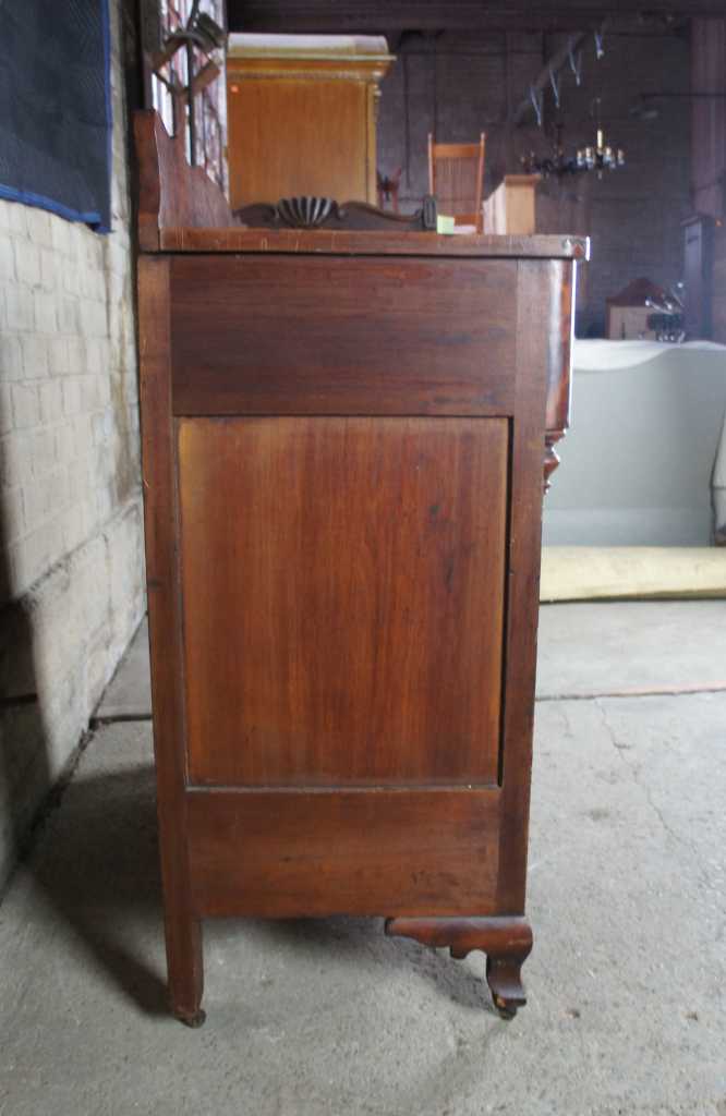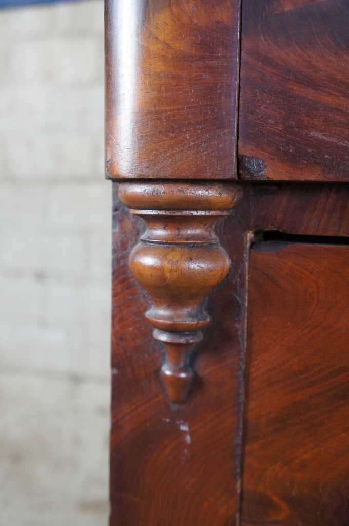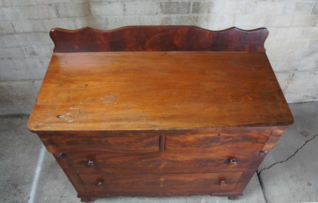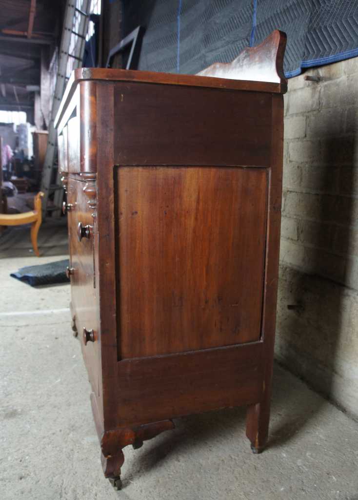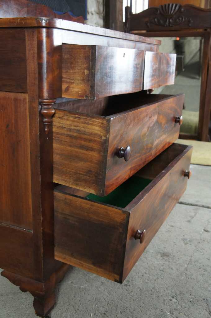 American Empire Chest, circa 1850s. Made from mahogany with crotched front drawers. Features serpentine backsplash, upper front drawers and lower apron; on castors for ease of movement.