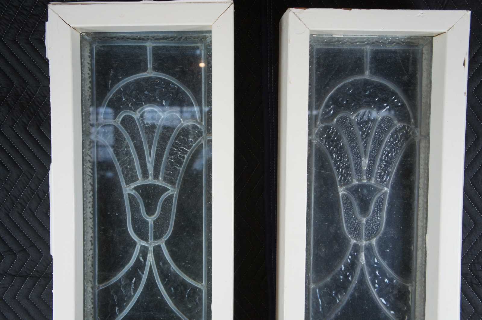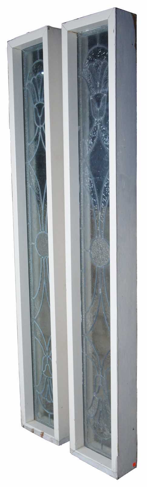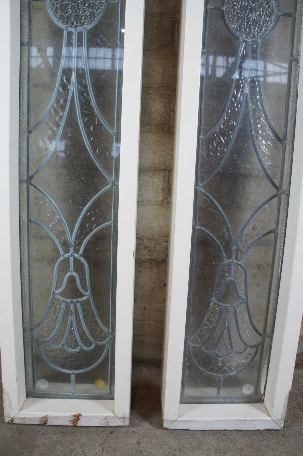 Two large full length sidelight (door flanking) antique victorian leaded stained glass window panels. Made to flank a doorway / entryway. Features a wood shadow box style frame with a protective glass in front of the stained glass.