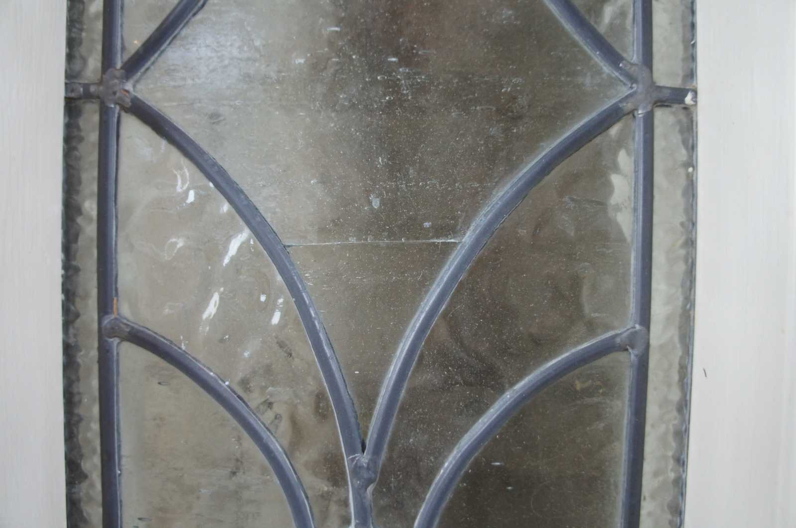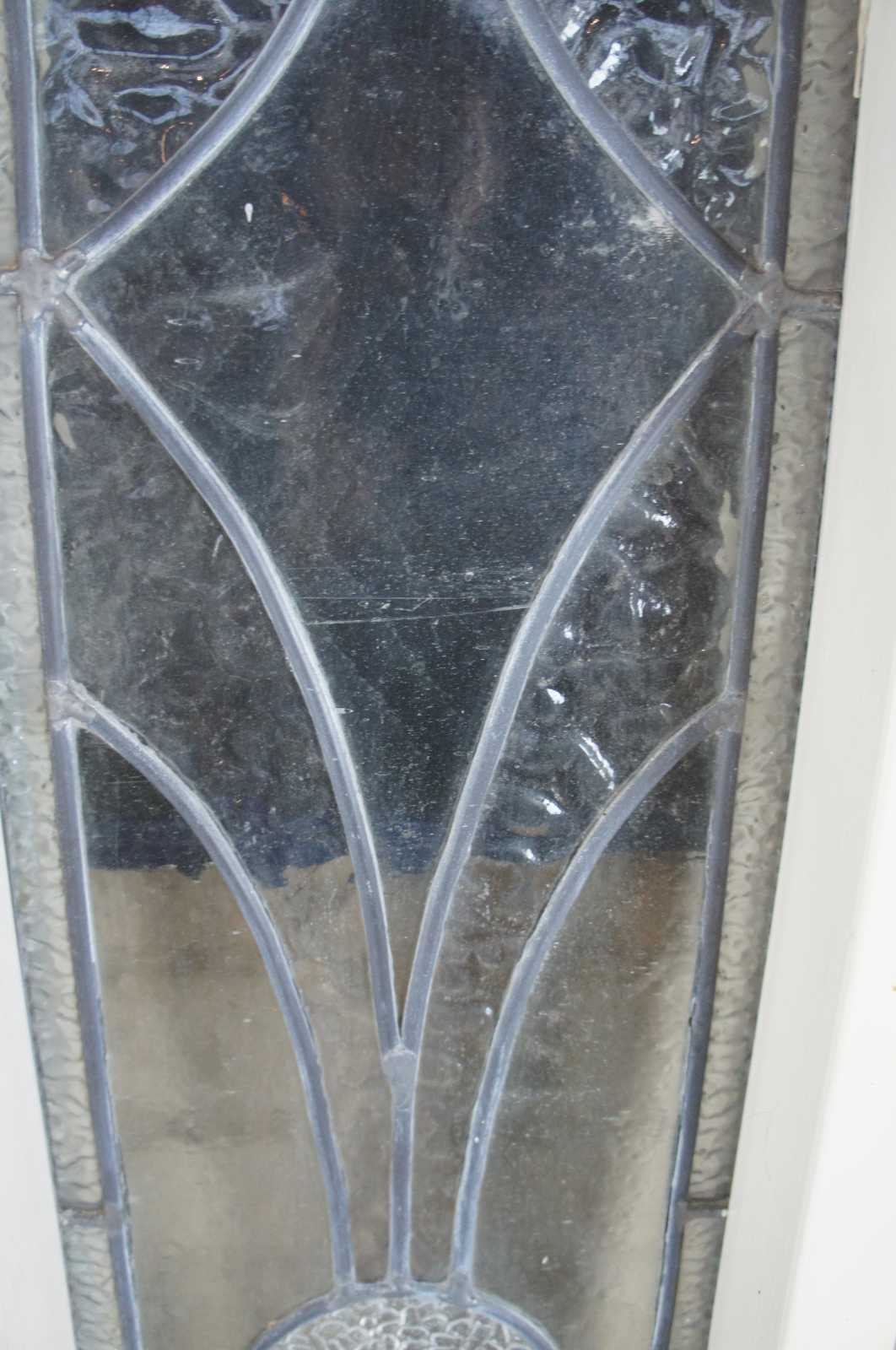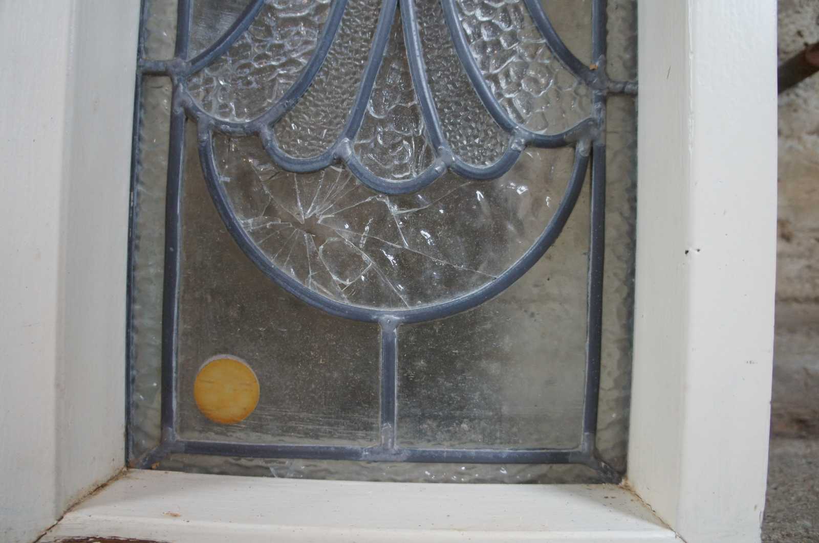 Two large full length sidelight (door flanking) antique victorian leaded stained glass window panels. Made to flank a doorway / entryway. Features a wood shadow box style frame with a protective glass in front of the stained glass.